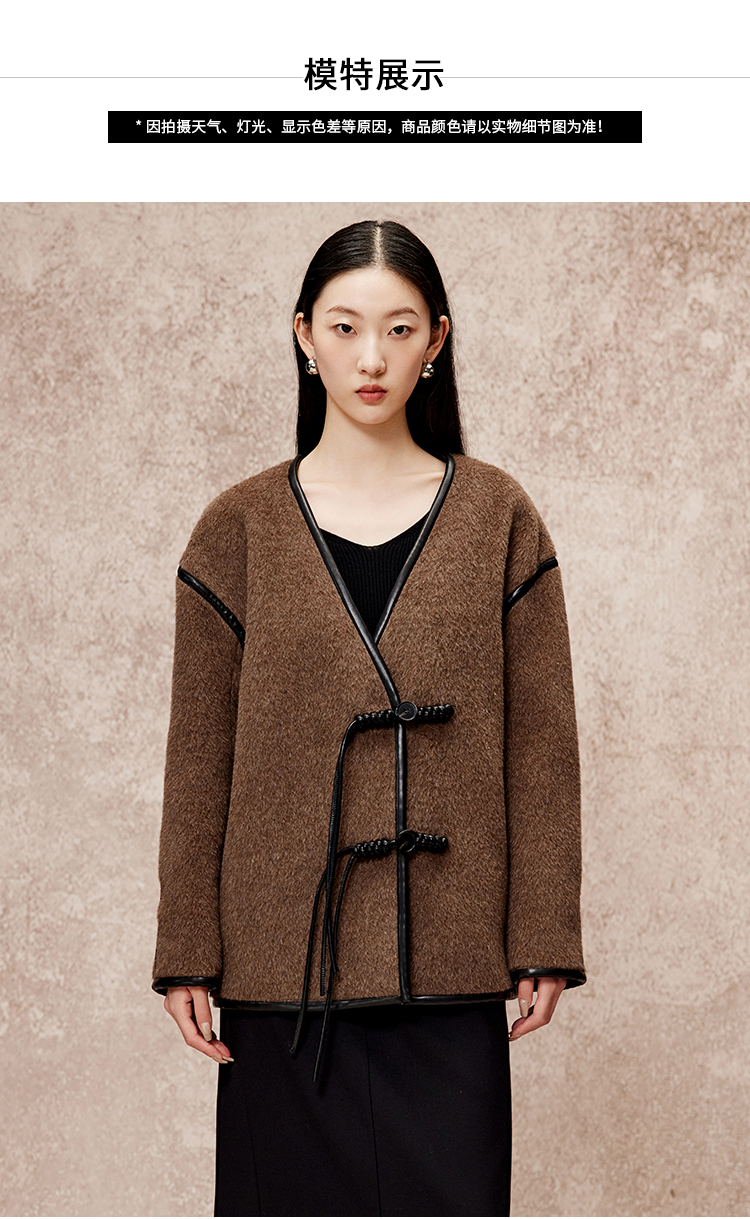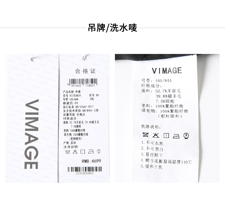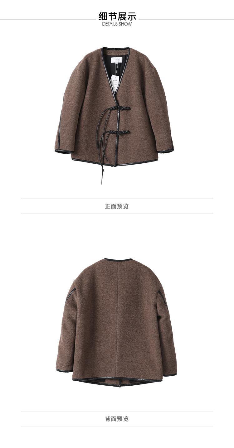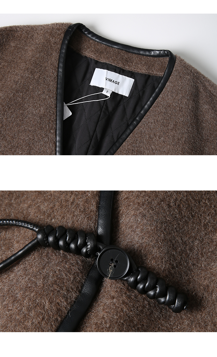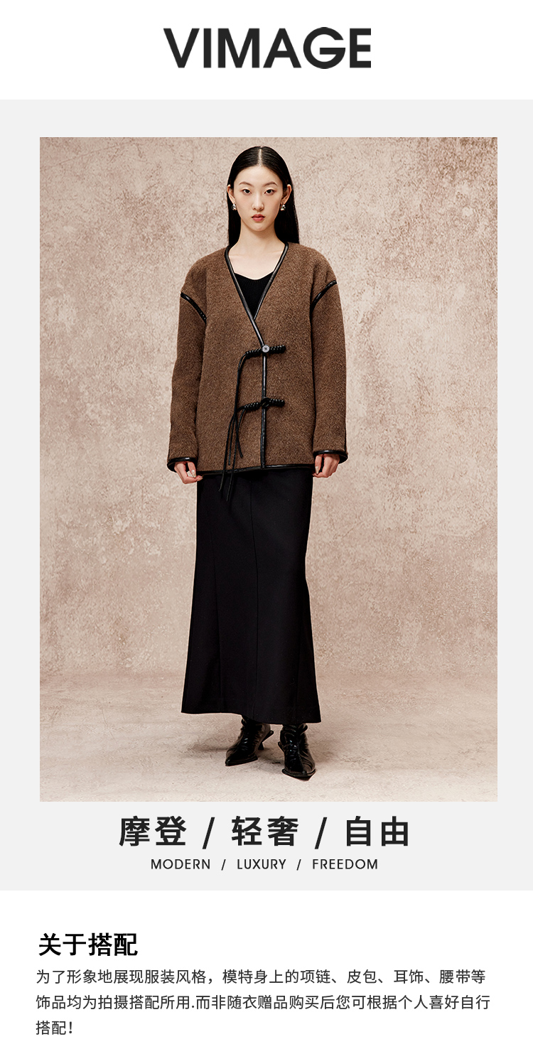 VIMAGE纬漫纪气质V领慵懒宽松深卡其色毛呢子外套冬新款V2203834