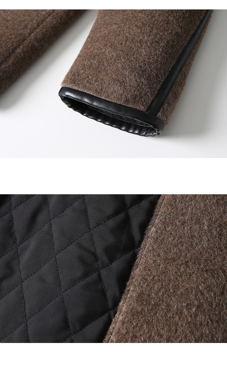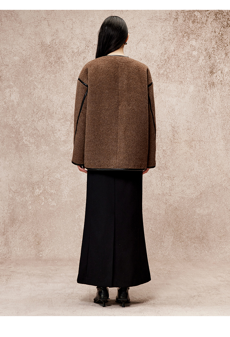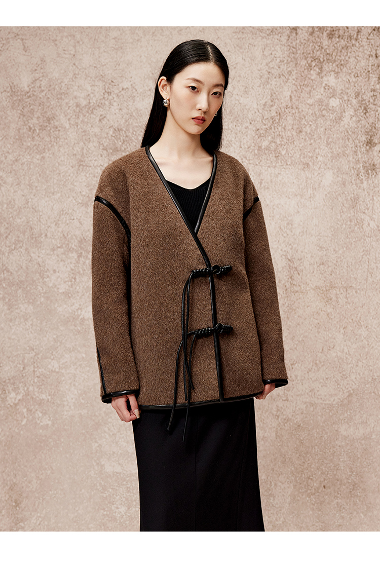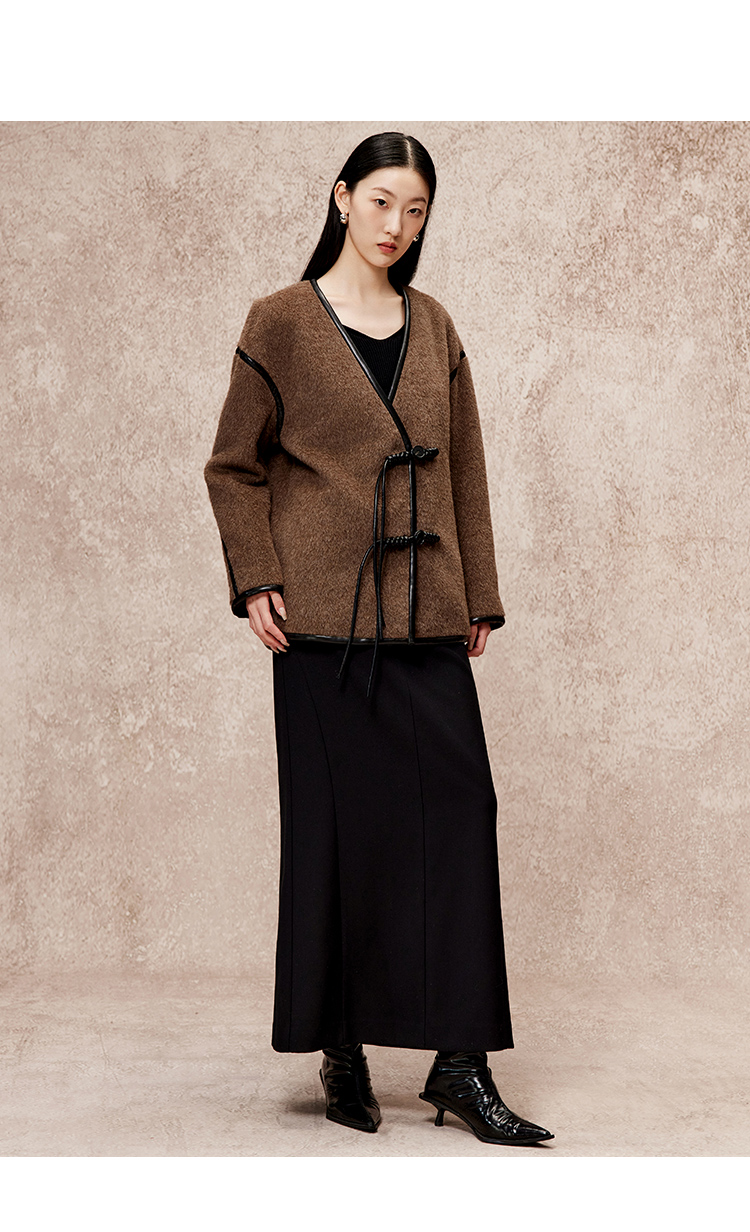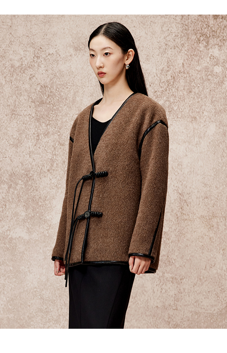 VIMAGE纬漫纪气质V领慵懒宽松深卡其色毛呢子外套冬新款V2203834