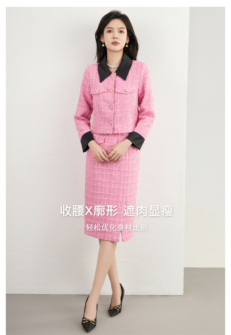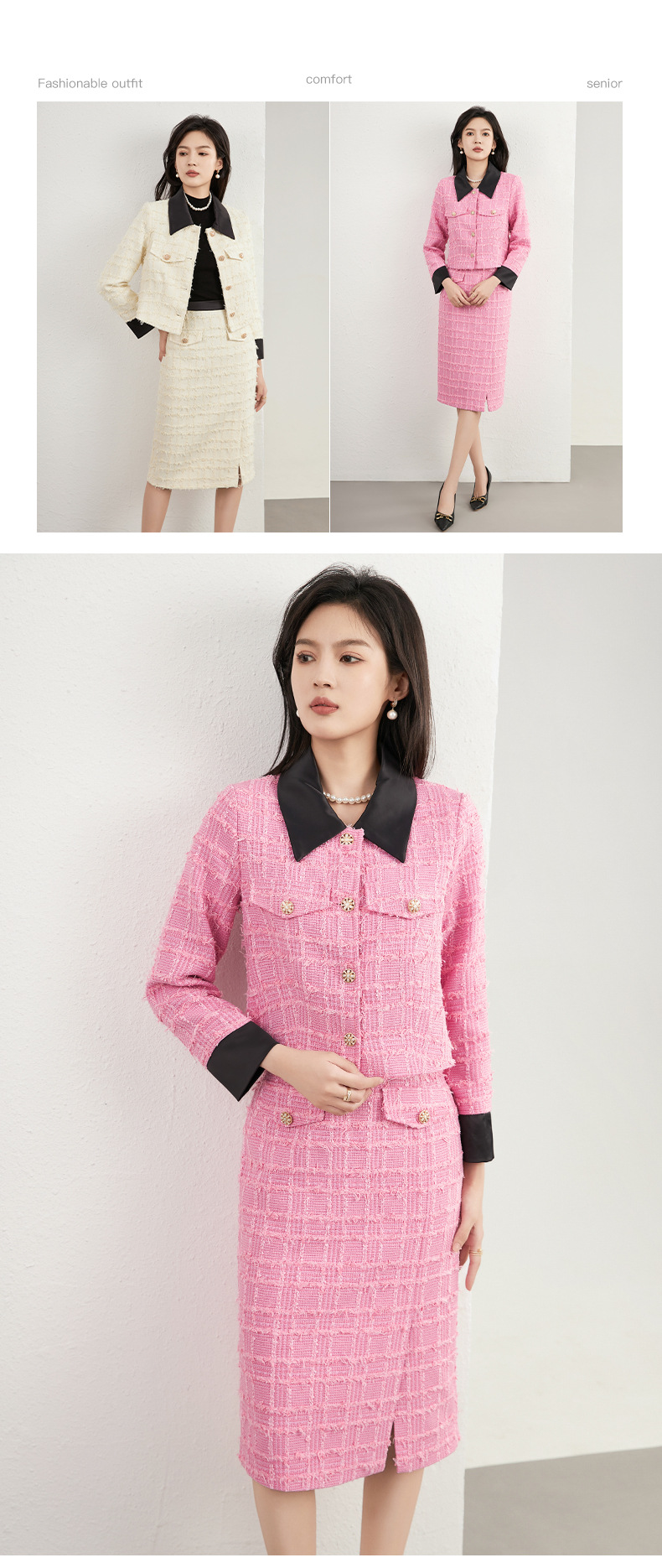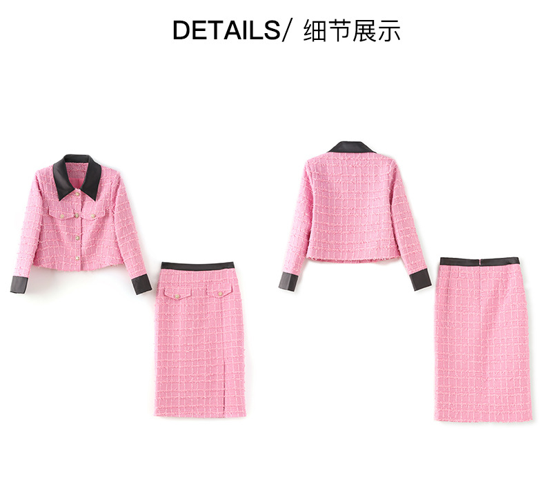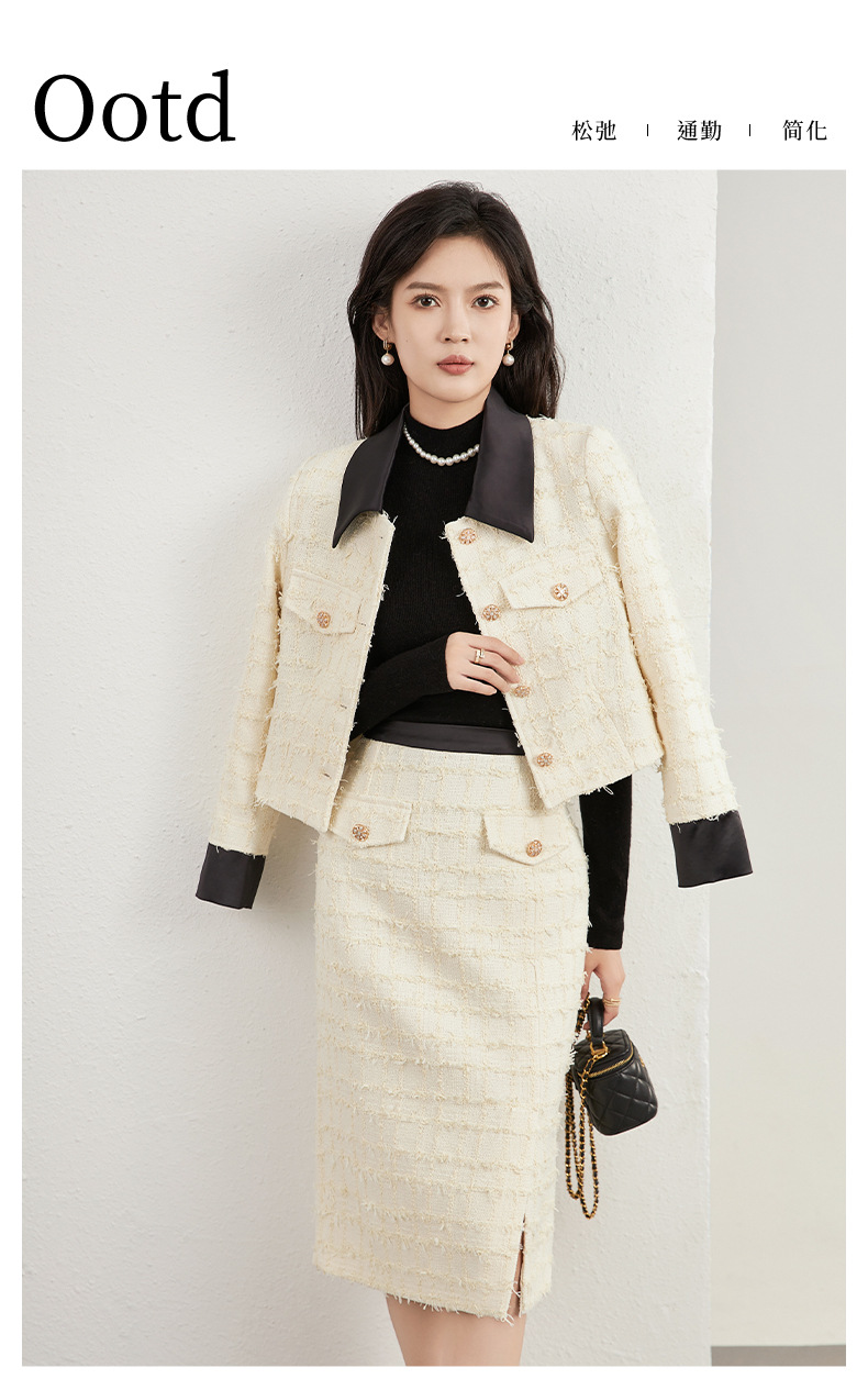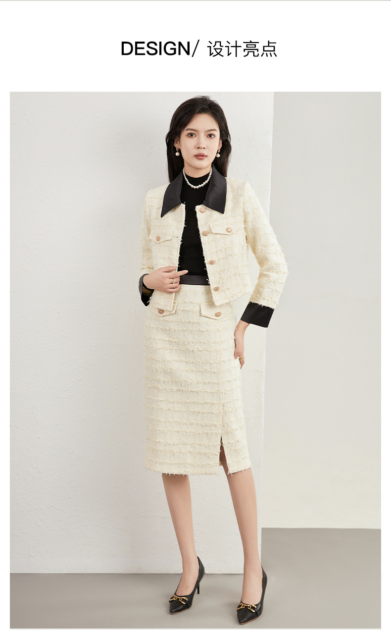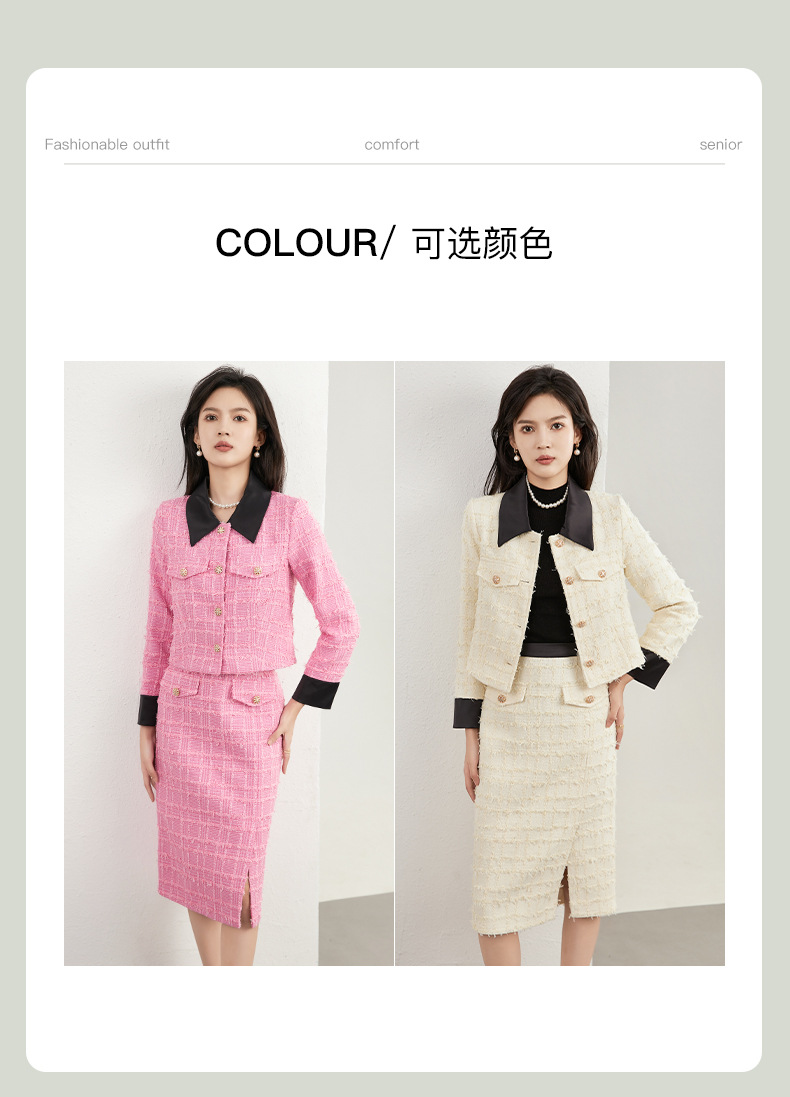 高级感小香风套装,名媛翻领撞色短外套+直筒半裙两件套WLZD-2323302
