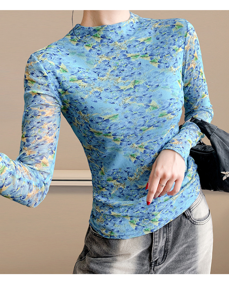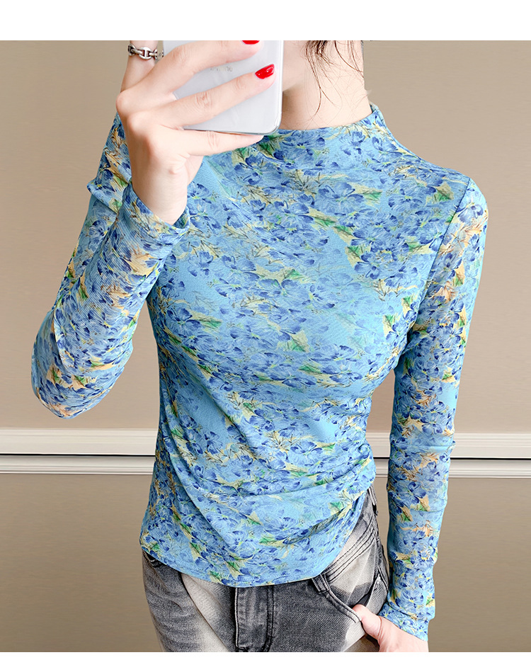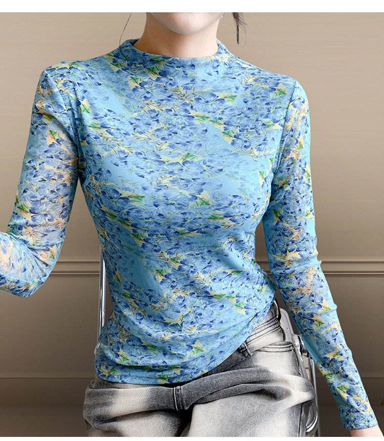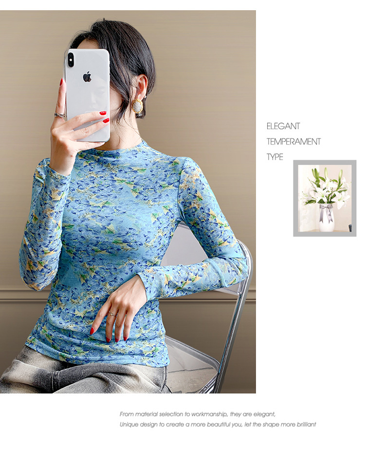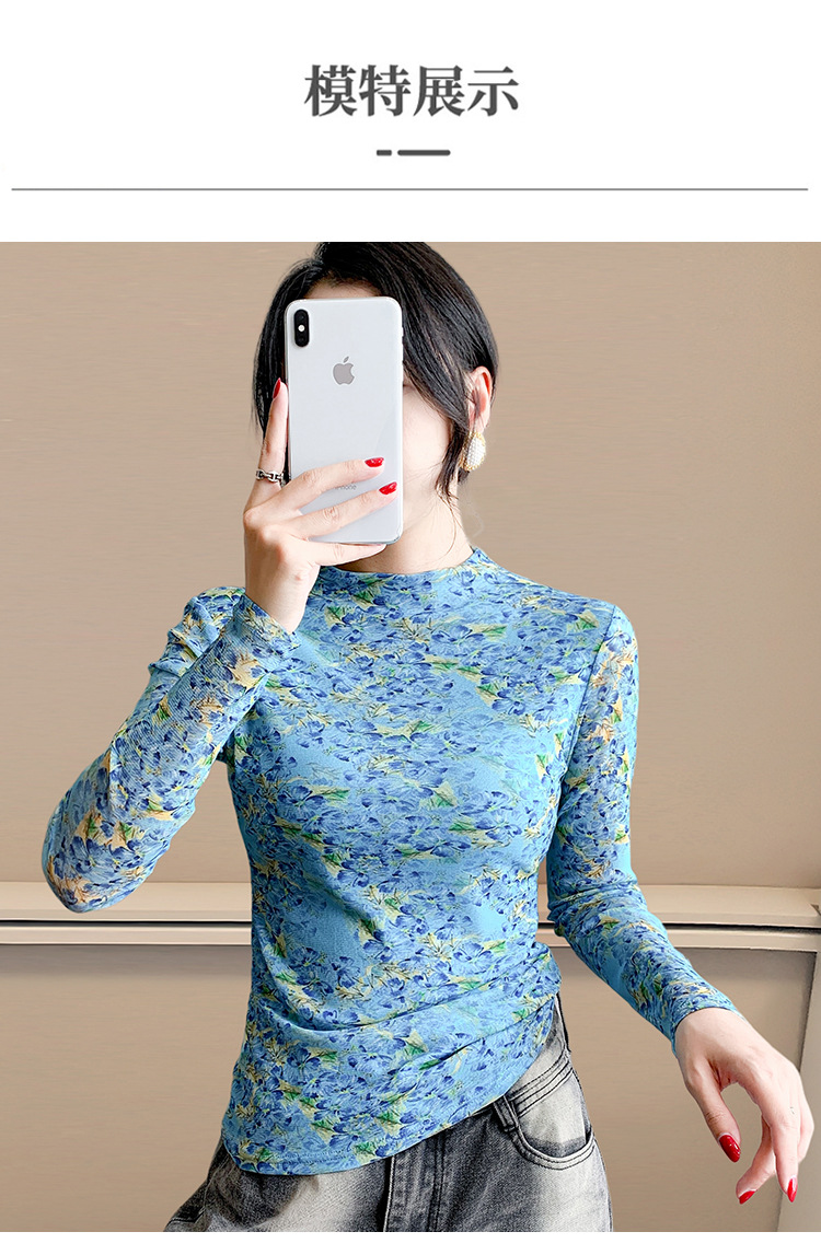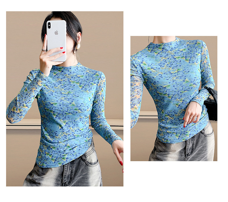 KQL A55F8573时尚洋气高弹网长袖印花半高领打底衫T恤