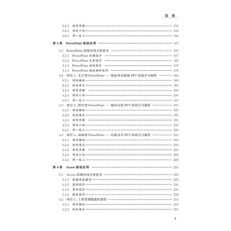 2010为基础,内容涉及Word高级应用、Excel高级应用、PowerPoint高级应用、Access高级应用、Visio高级应用以及宏和VBA基础。同时依据编著者多年实际教学经验,结合的教学改革成果,以CDIC)工程教育理念为指导,进行教材的整体设计。突出以工作需求为导向,将实际工作中所用到的主要的技术提炼出来。通过情景教学及项目驱动的方式,用实际例子来讲解知识,避免了纯理论的说教,具有重点突出、简明扼要、可操作性强等特点。全书共19个项目,均来自生活和工作实际案例加工提炼,每个项目均从项目描述、知识要点、制作步骤、项目小结等4个方面进行描述,每一章后安排了若干个实践练习题。其内容丰富,语言精练,通俗易懂,是Office基本功能的补充。通过学习本教材,读者不仅可以体会办公软件的强大功能,掌握办公软件的使用技巧,而且可以学会综合运用办公软件来处理复杂的实际问题。