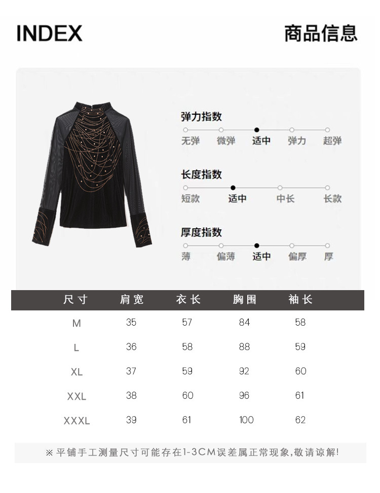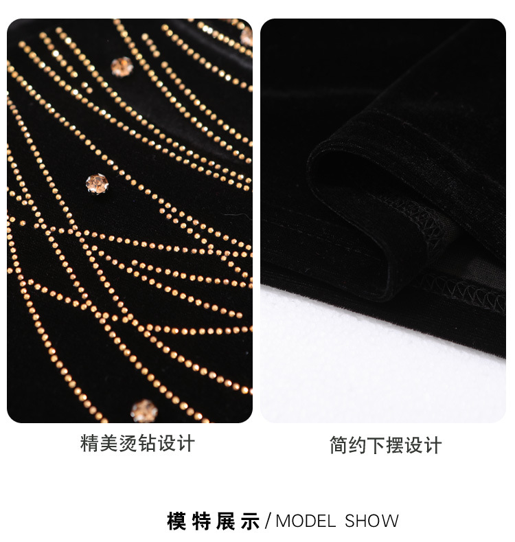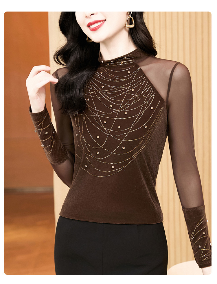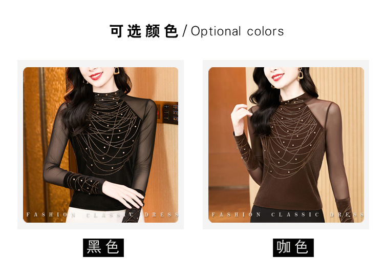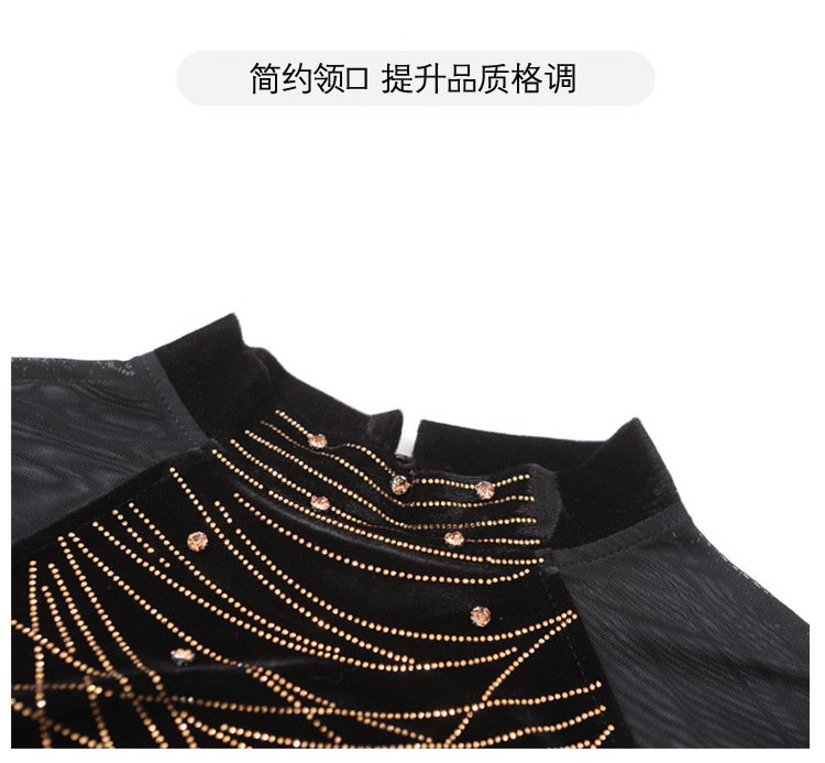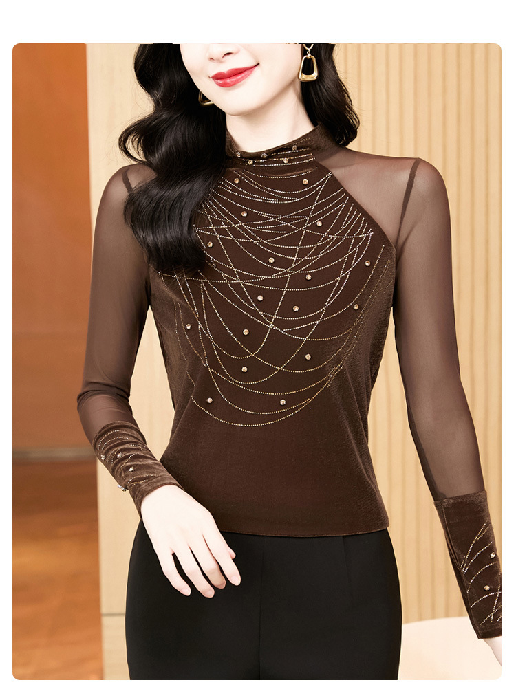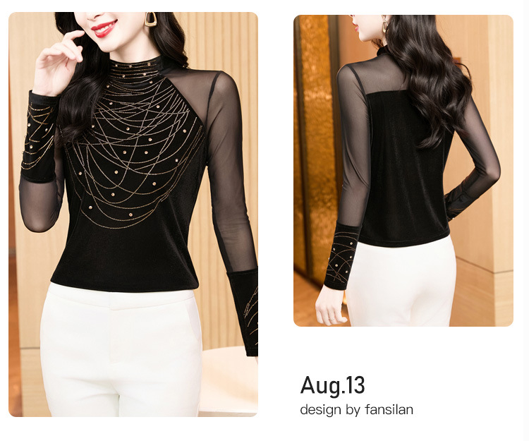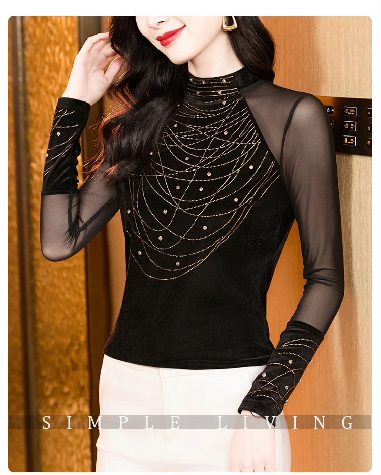 KQL E37M2967洋气百搭高领烫钻钉珠T恤丝绒拼接网纱长袖打底衫