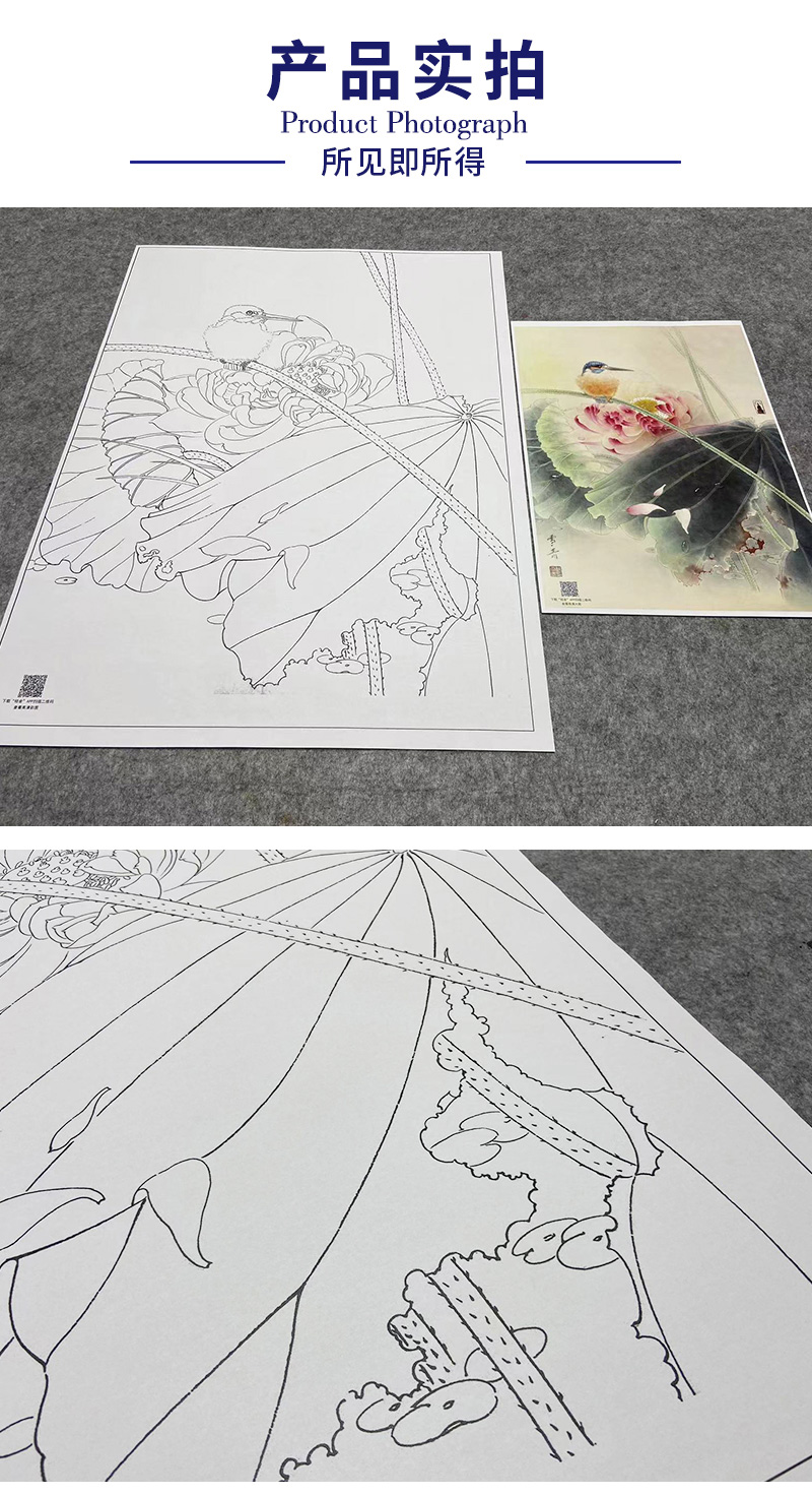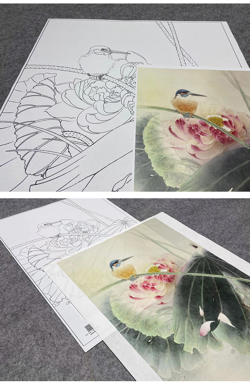 【大彩图】龚雪青工笔画白描底稿《翠鸟荷花》临摹勾线花鸟线稿XQ49