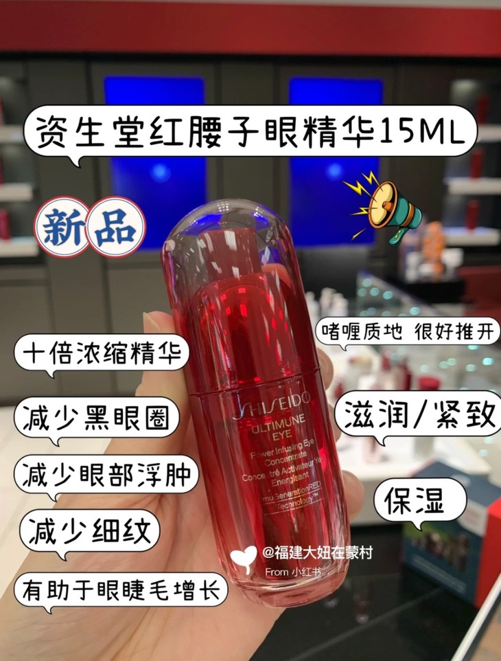 👑资生堂红妍肌活眼部精华15ml ✅含有多种营养成分,可以深入肌肤层次,滋润、紧致和恢复眼部肌肤 💦轻盈啫喱的质地,可以轻松吸收,不会有油腻感 🙌有助于减少细纹、黑眼圈和浮肿,让你眼部肌肤更加明亮、有弹性和健康~
