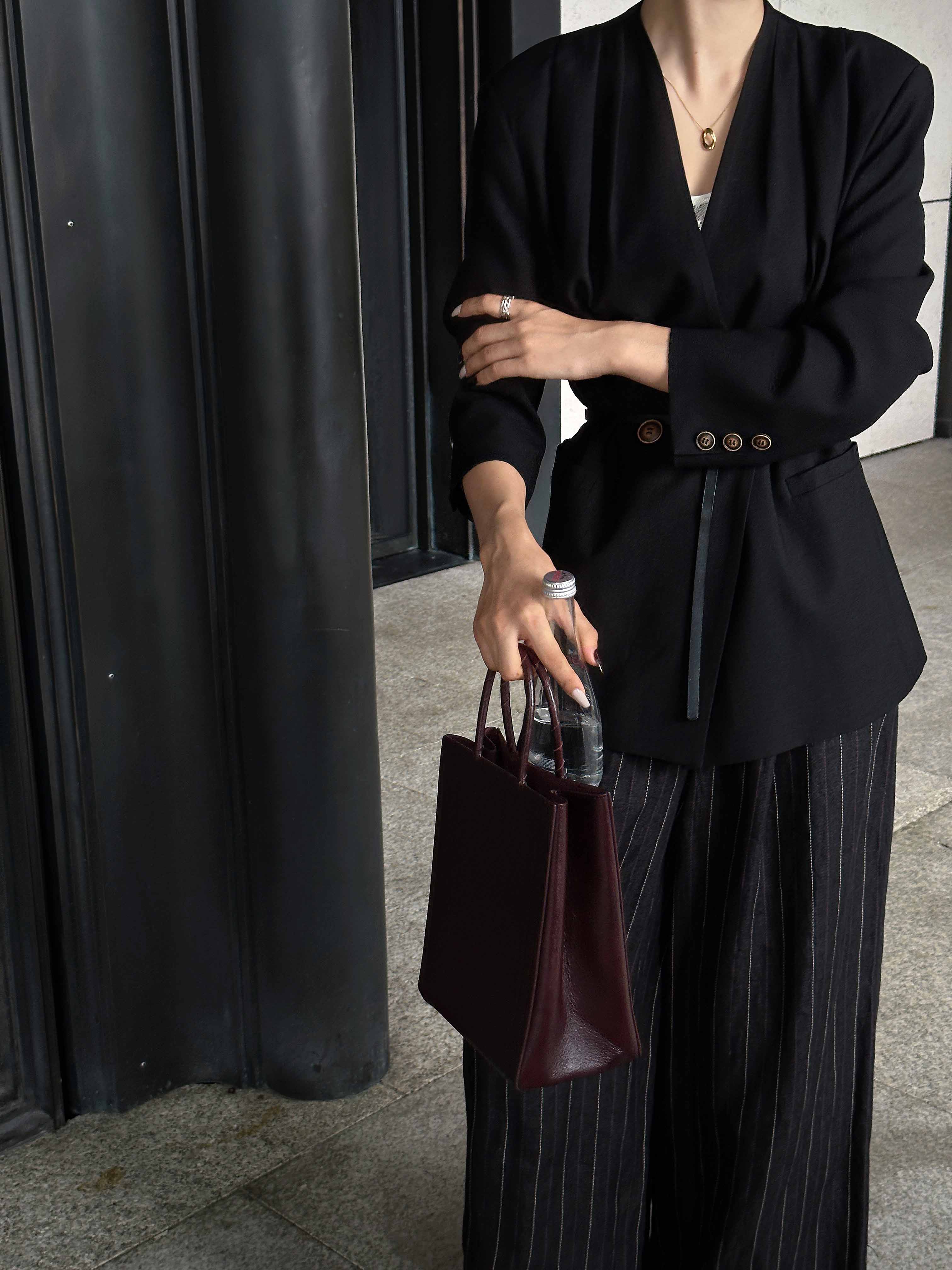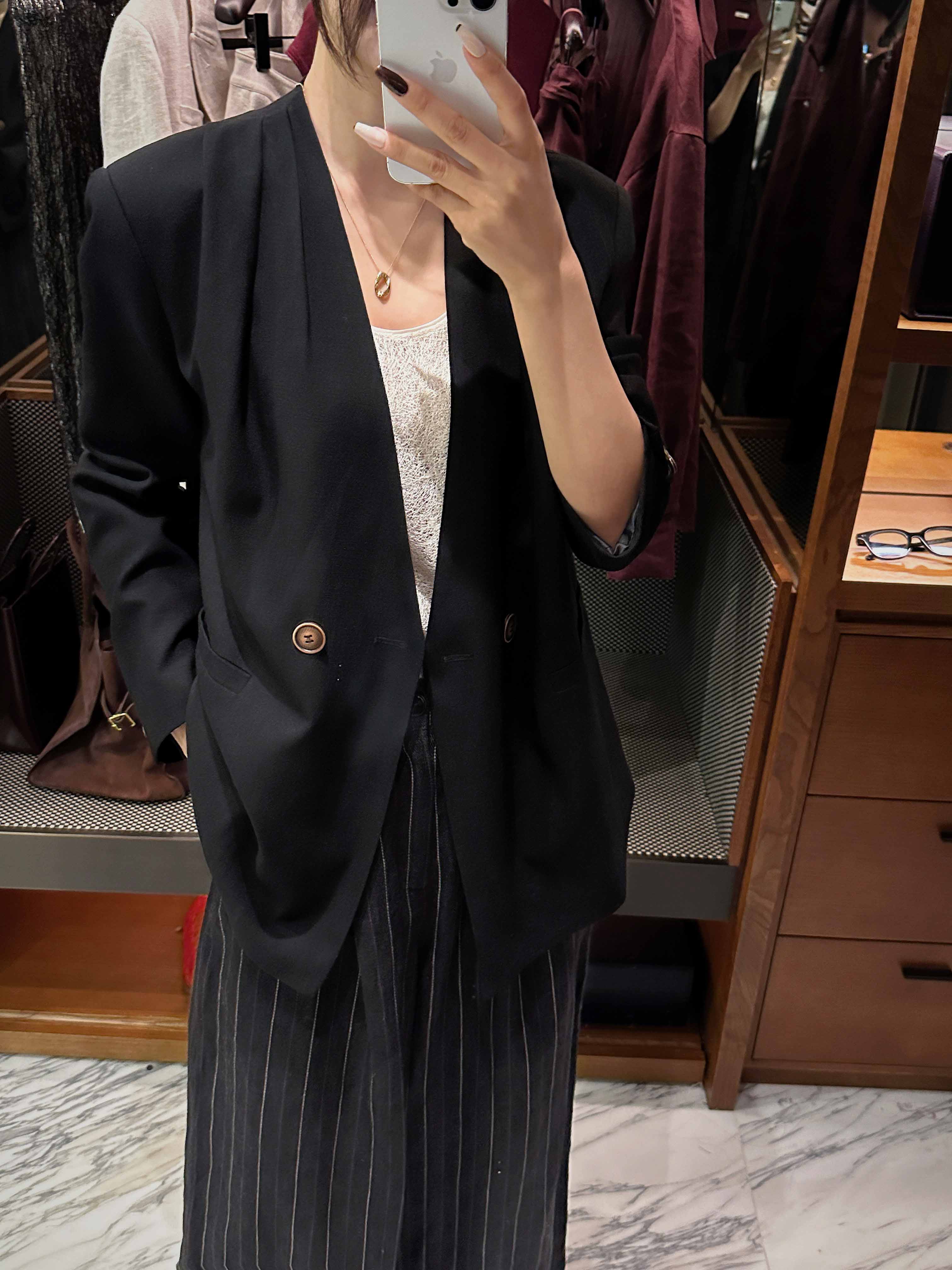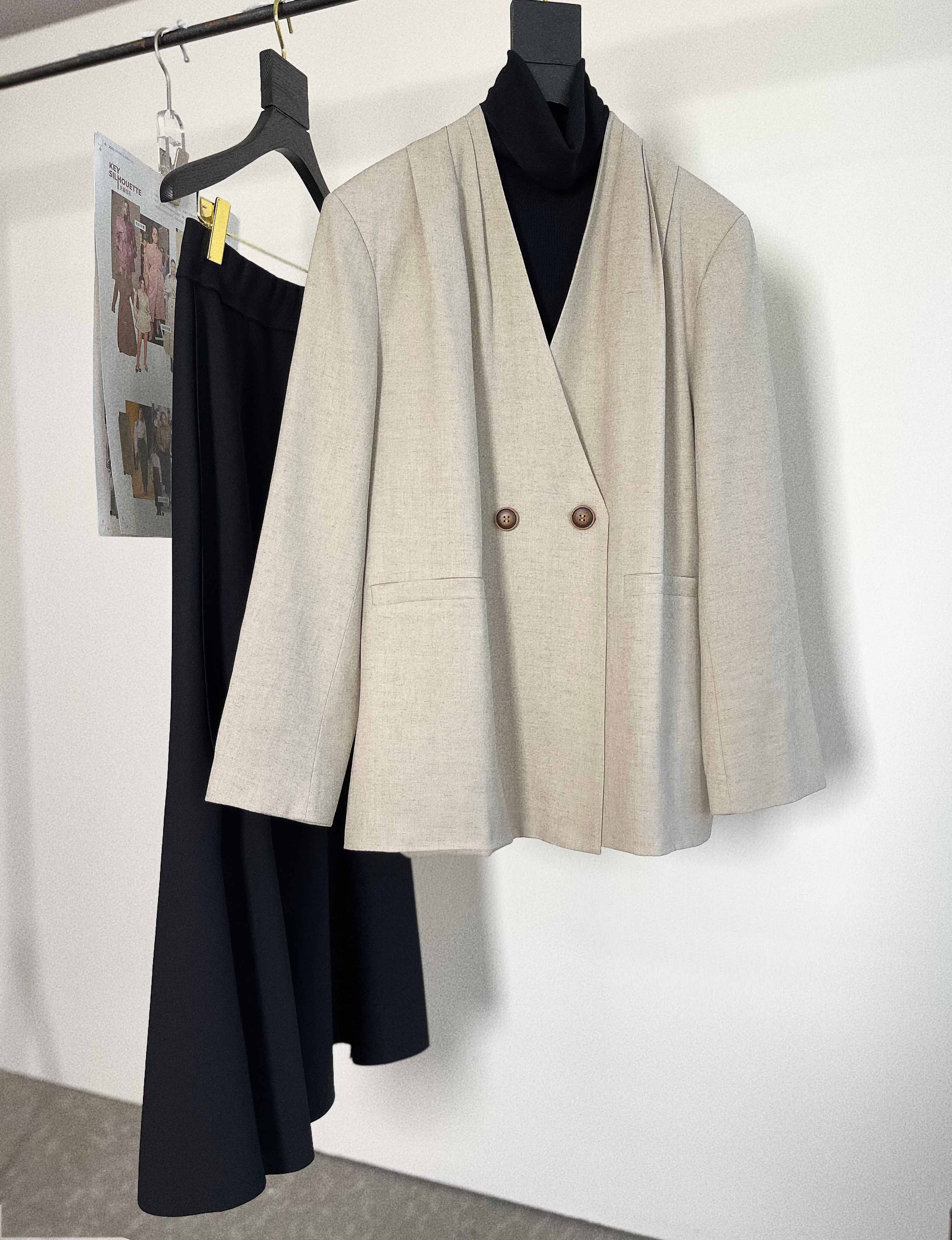 韩系通勤不费力外搭|前身打褶双排扣气质无领西服