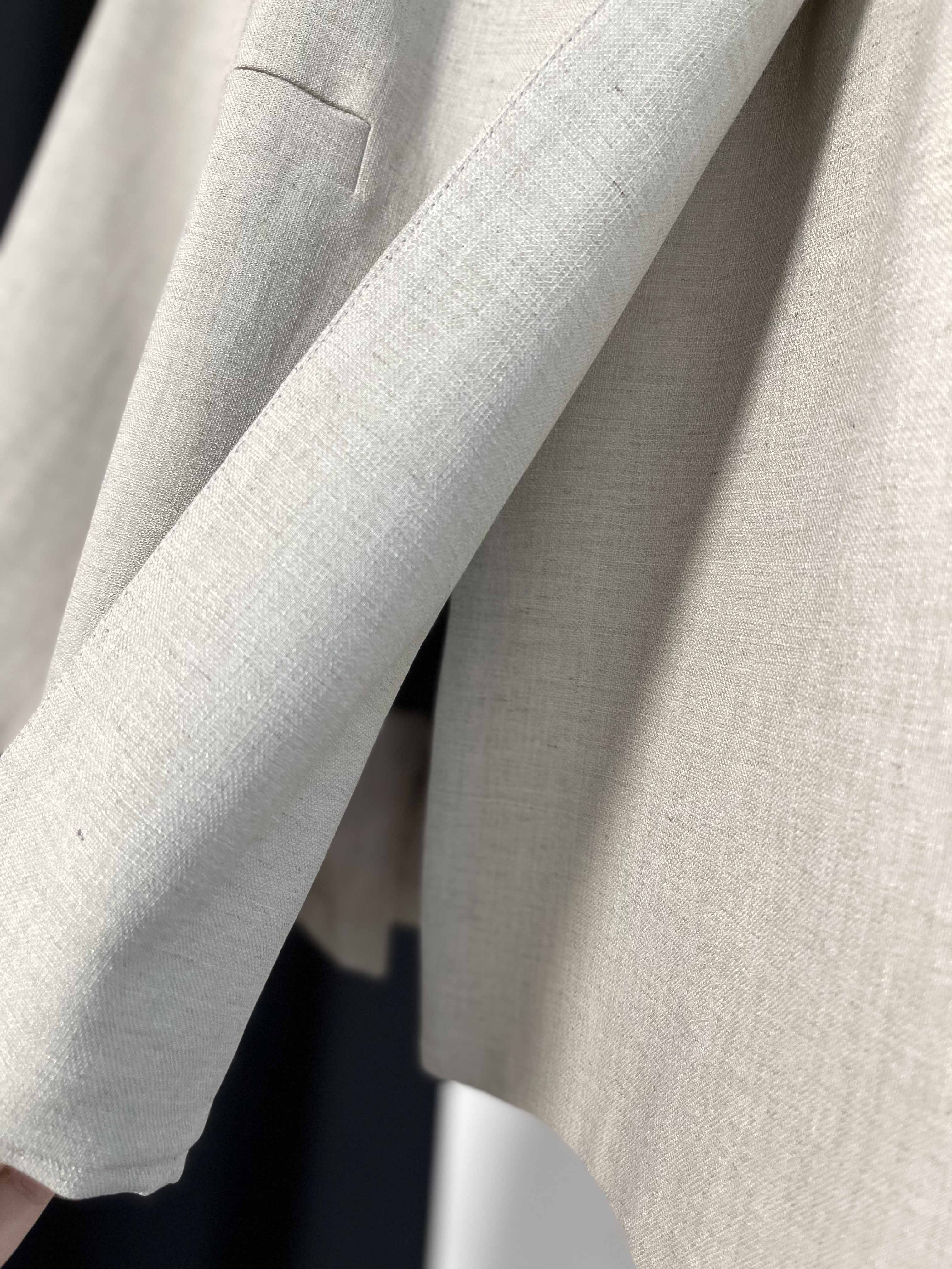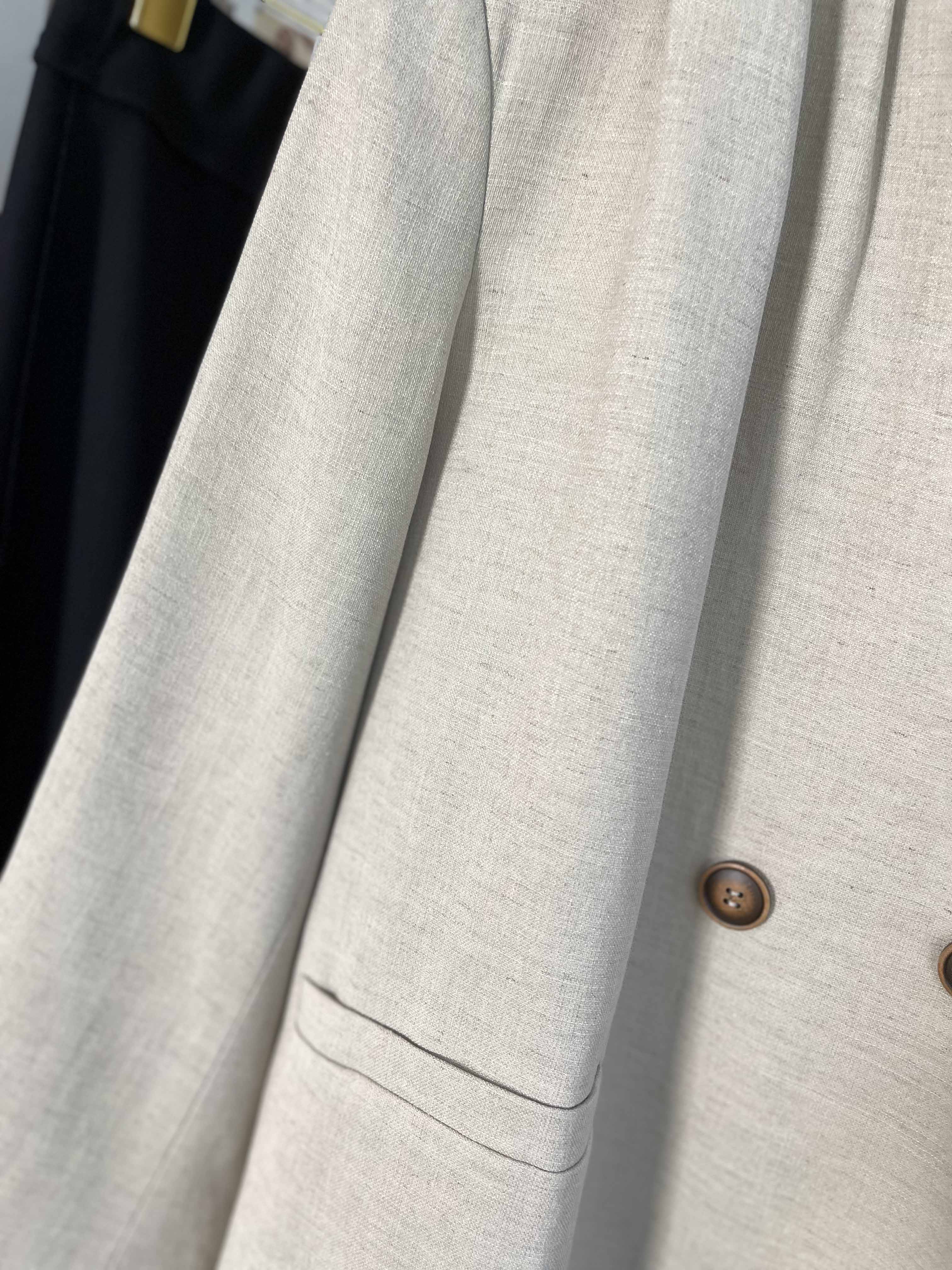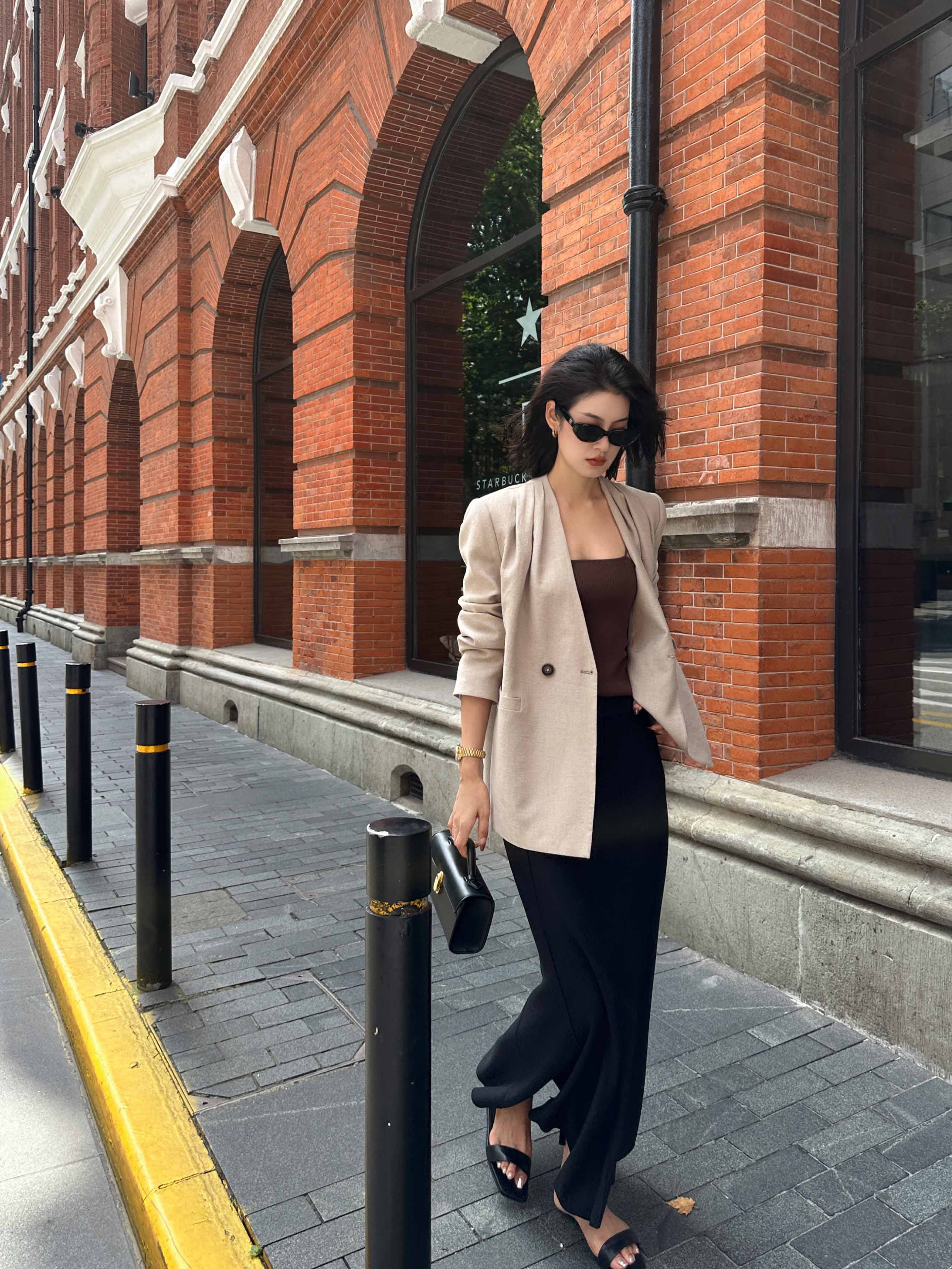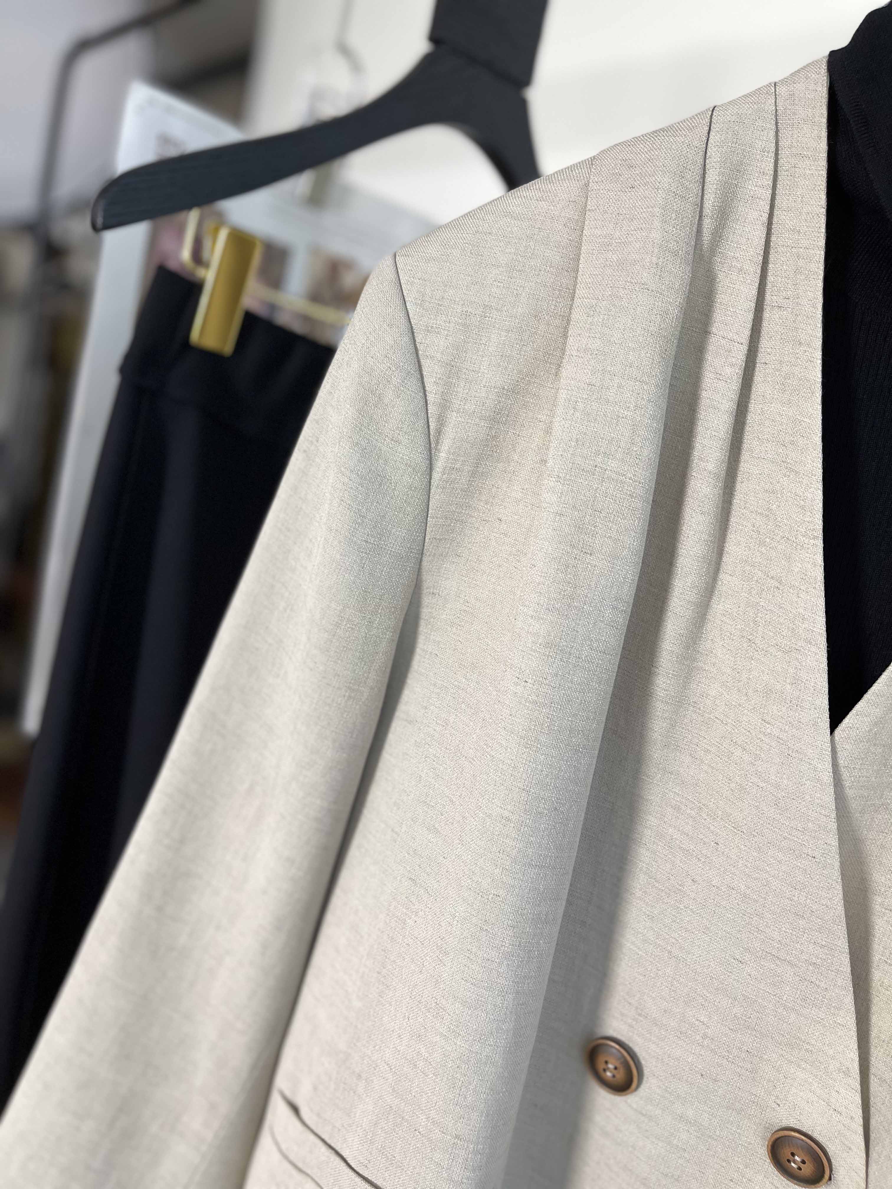韩系通勤不费力外搭|前身打褶双排扣气质无领西服