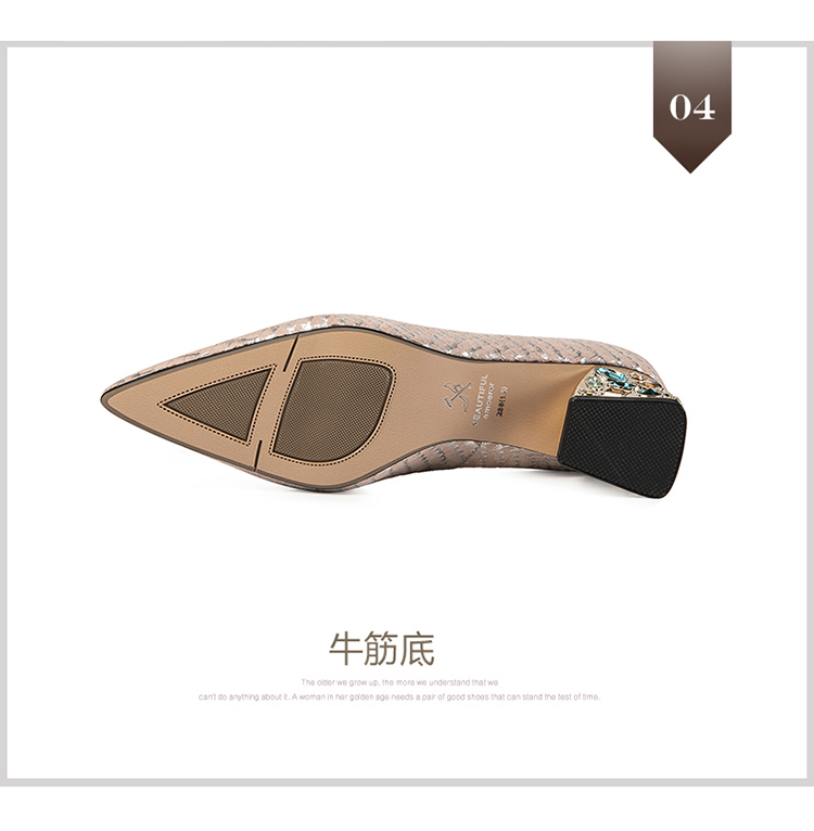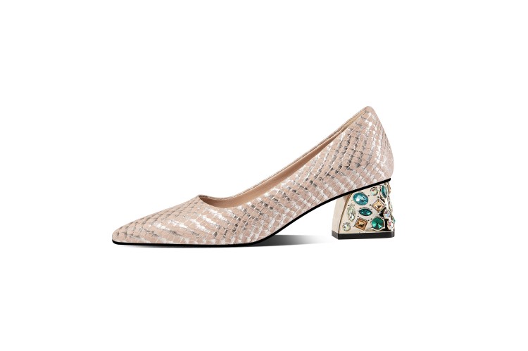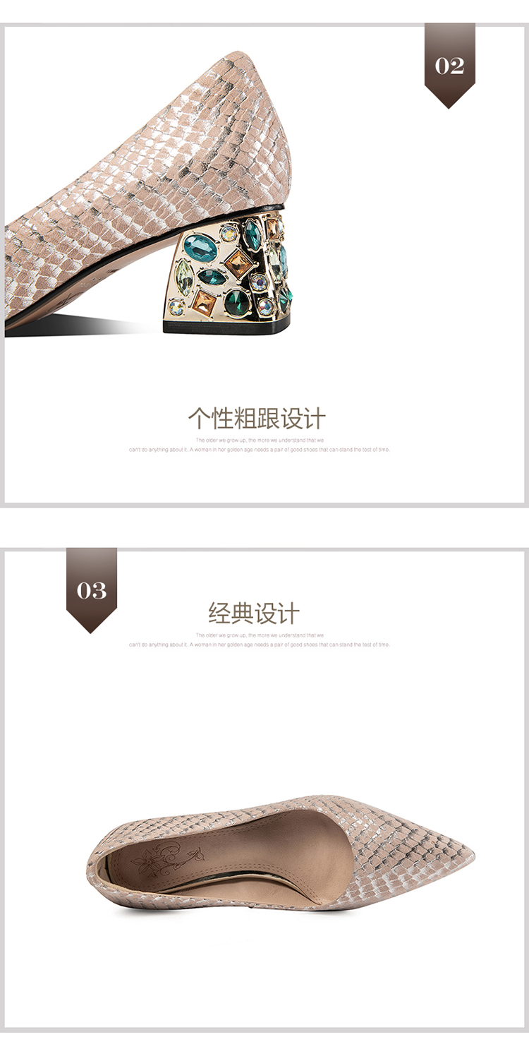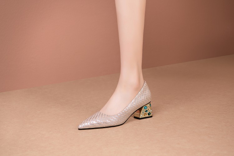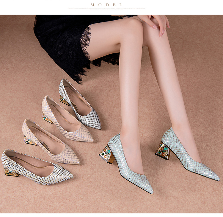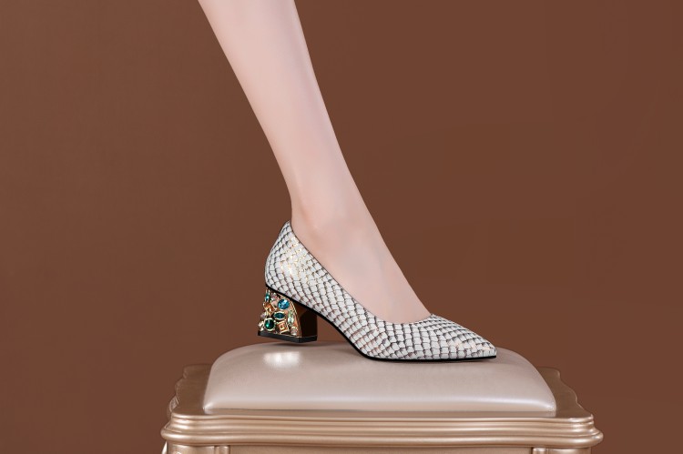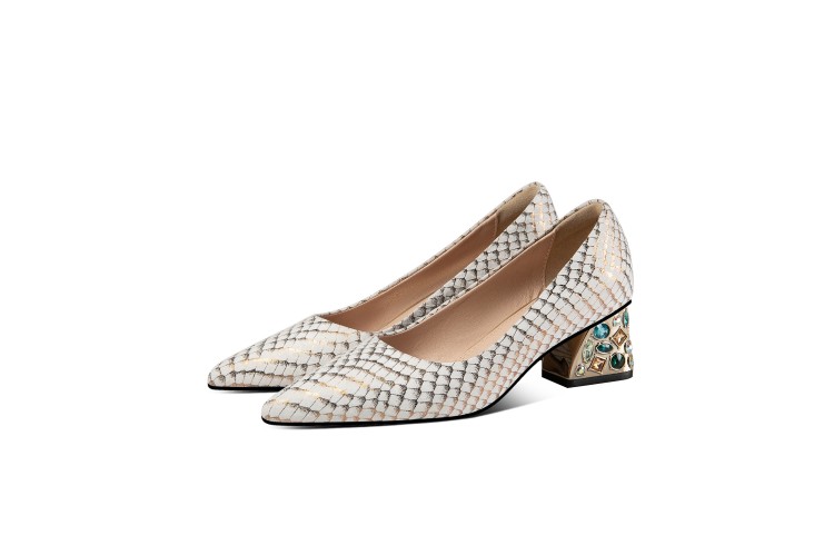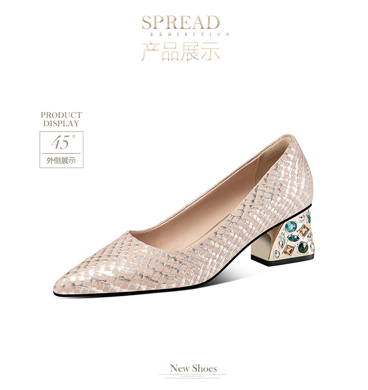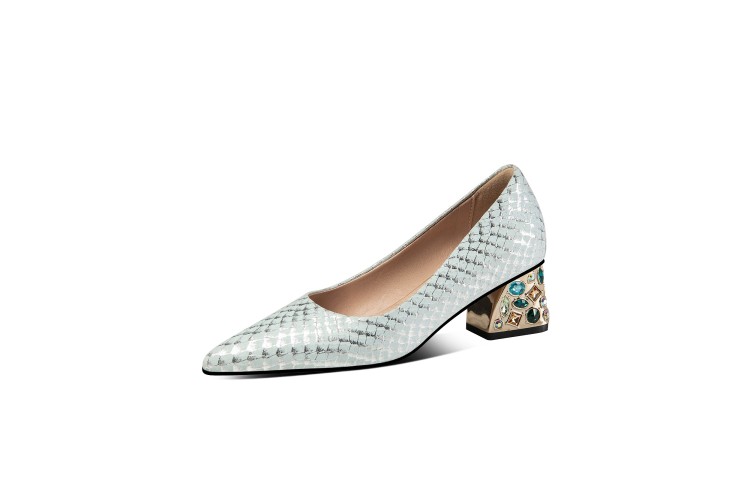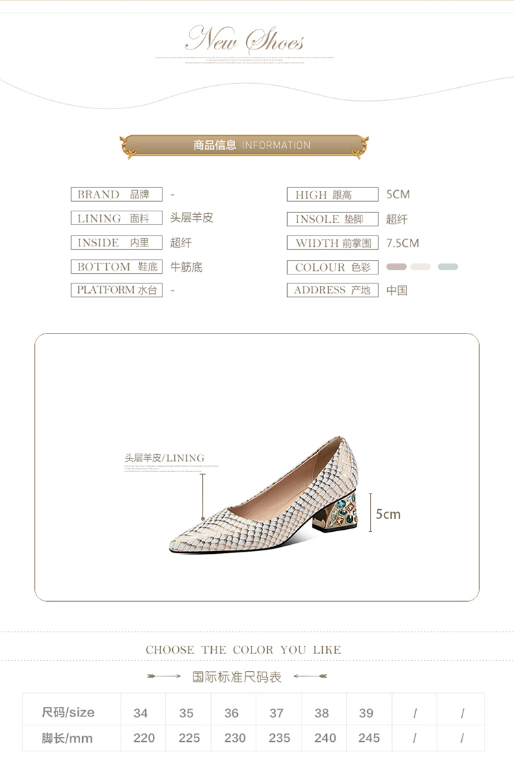 【预售5天】尖头舒适真皮水钻金属粗跟白色单鞋浅口简约配裙子女鞋XME&W9200