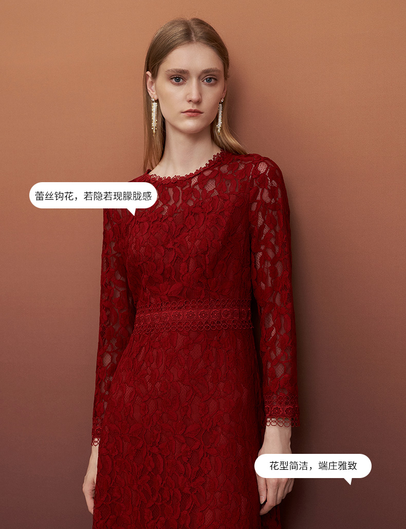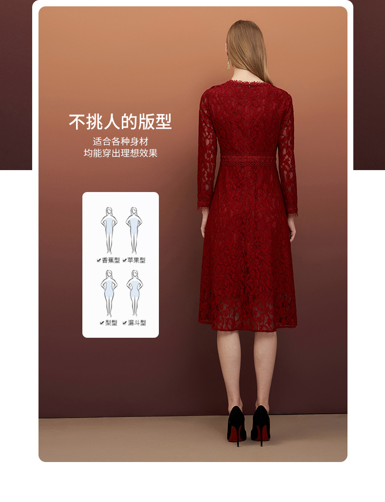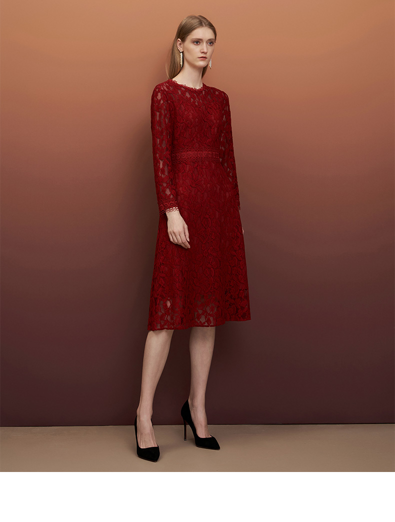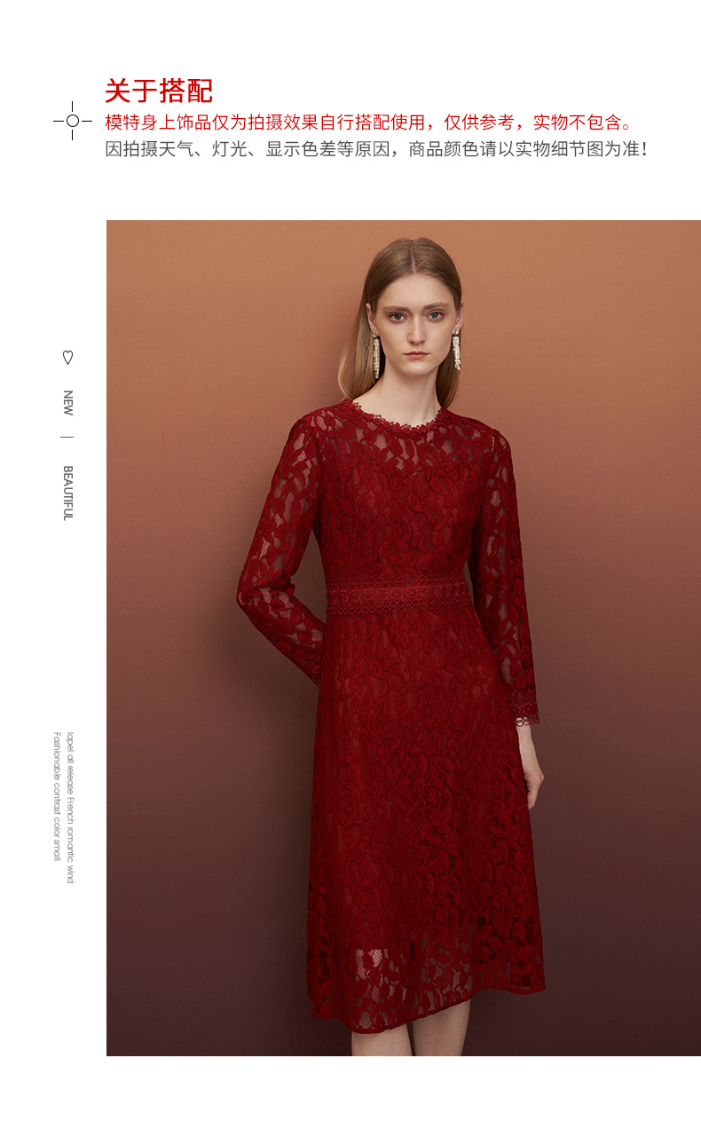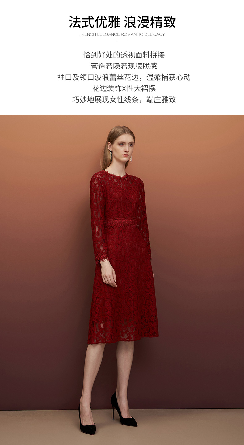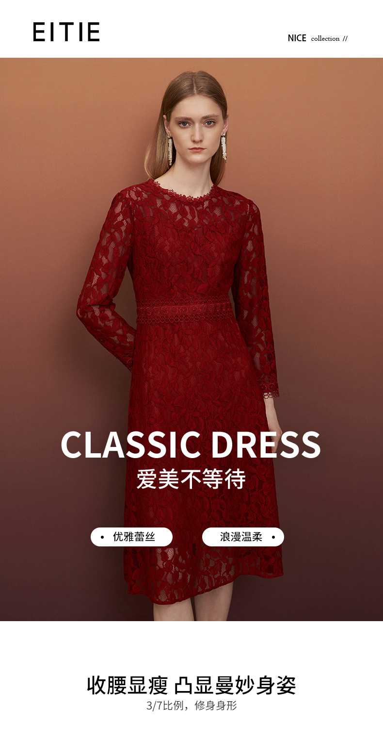 EITIE爱特爱秋季新款蕾丝镂空紧身收腰显瘦长袖连衣裙A字裙女6707428