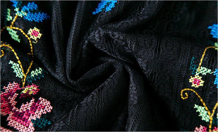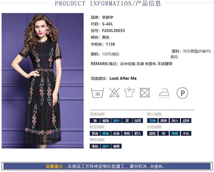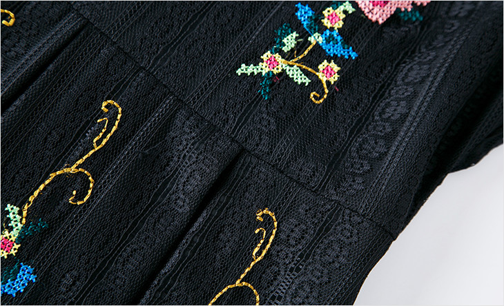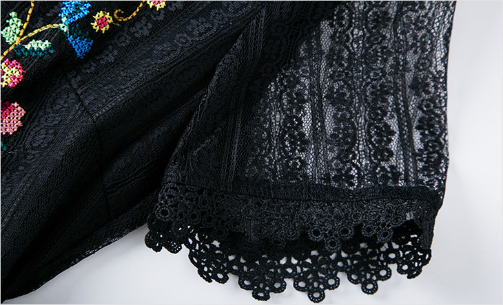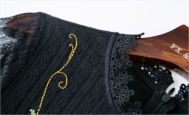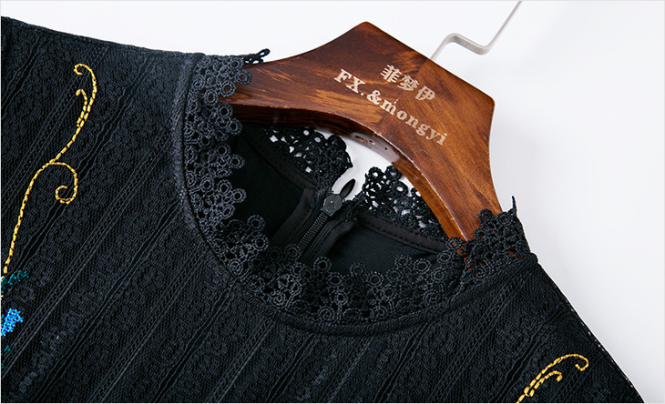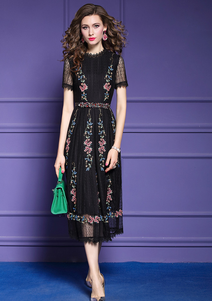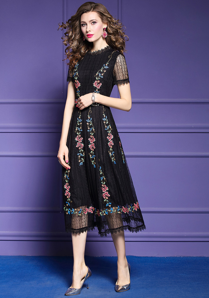 FMY-F20XL30033夏季复古气质优雅收腰绣花黑色蕾丝连衣裙