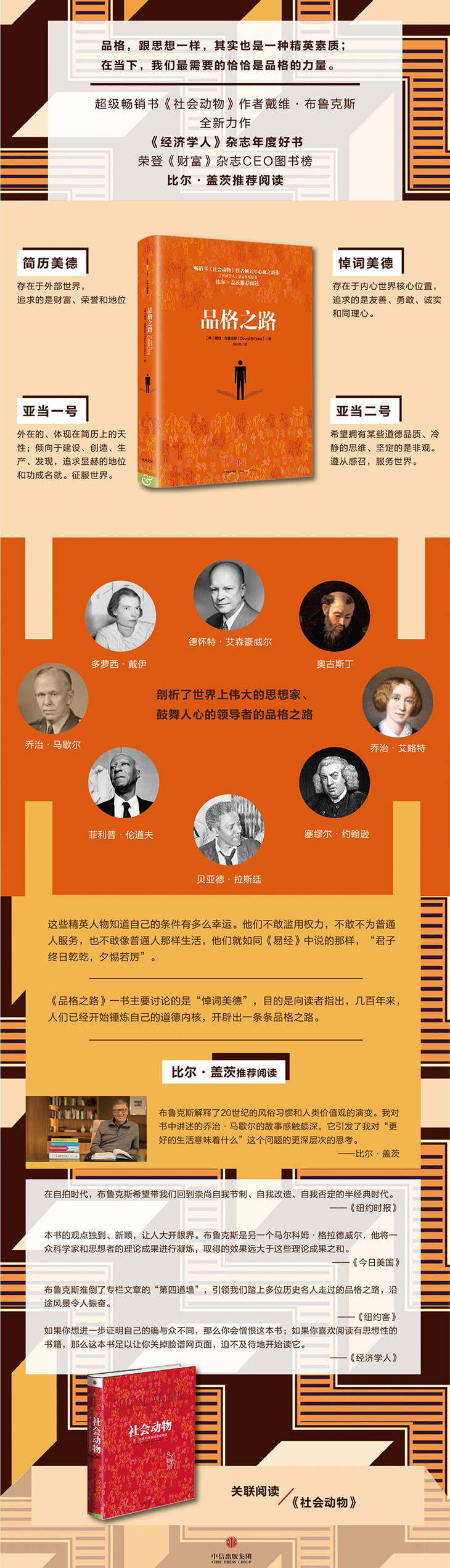 在书中,布鲁克斯剖析了几位世界上最伟大的思想家、最鼓舞人心的领导者的品格之路,他们是:罗斯福新政的幕后女英雄弗朗西斯•帕金斯,最杰出的美国总统之一德怀特•艾森豪威尔,用爱和善行去拯救世界的人间天使多萝西•戴伊,第二次世界大战“胜利的组织者”乔治•马歇尔,为终结种族歧视奔走一生的斗士菲利普•伦道夫与贝亚德•拉斯廷,用手中的笔让世界变得更美好的文学家塞缪尔•约翰逊,把人生搬至更广阔舞台之上的思想者奥古斯丁,以及一生都在执着寻爱的女小说家乔治•艾略特。