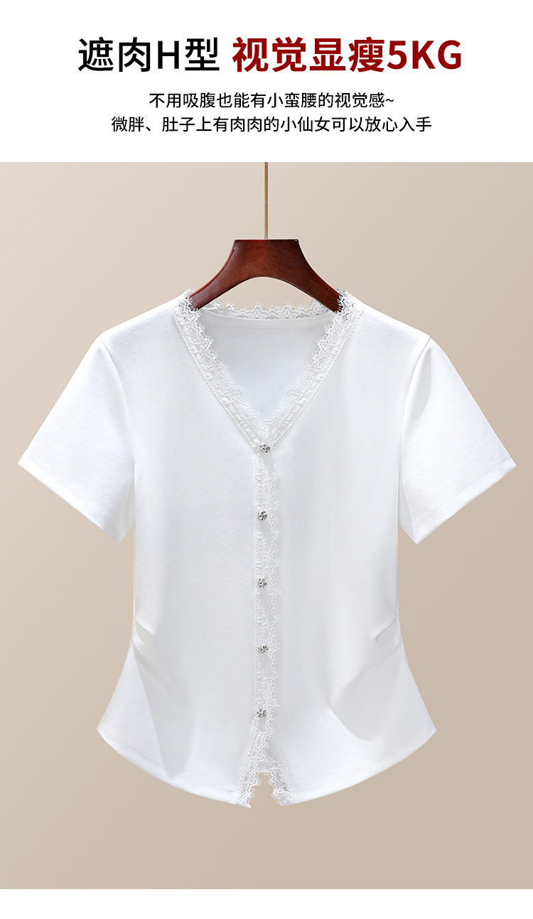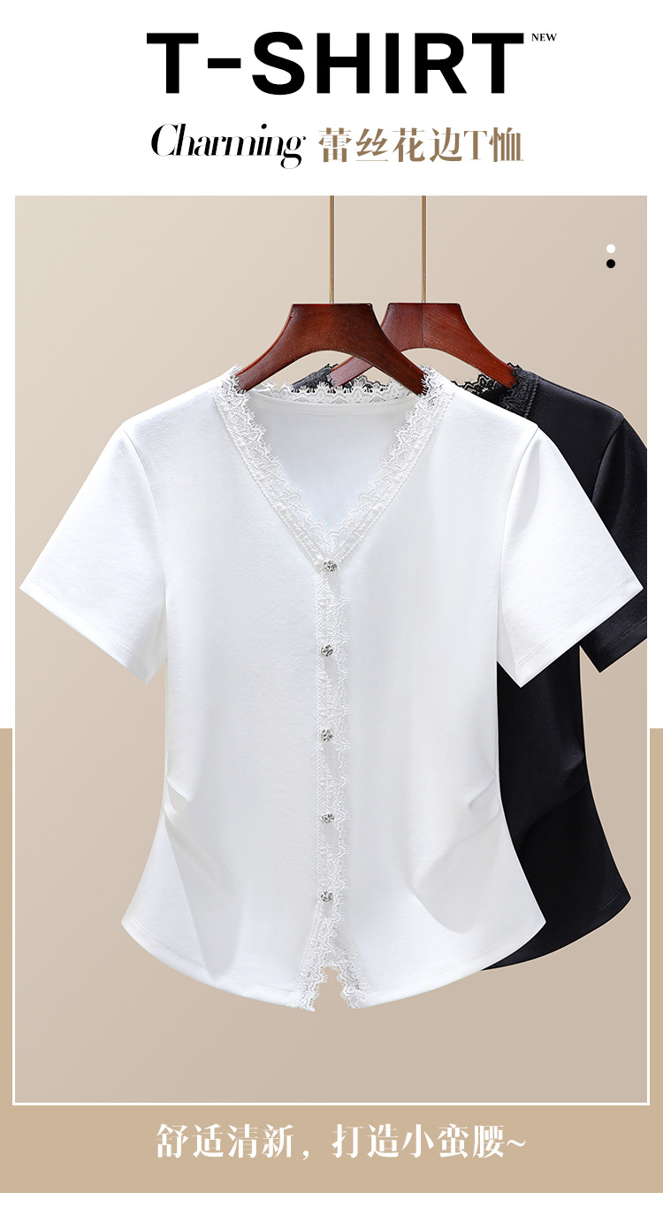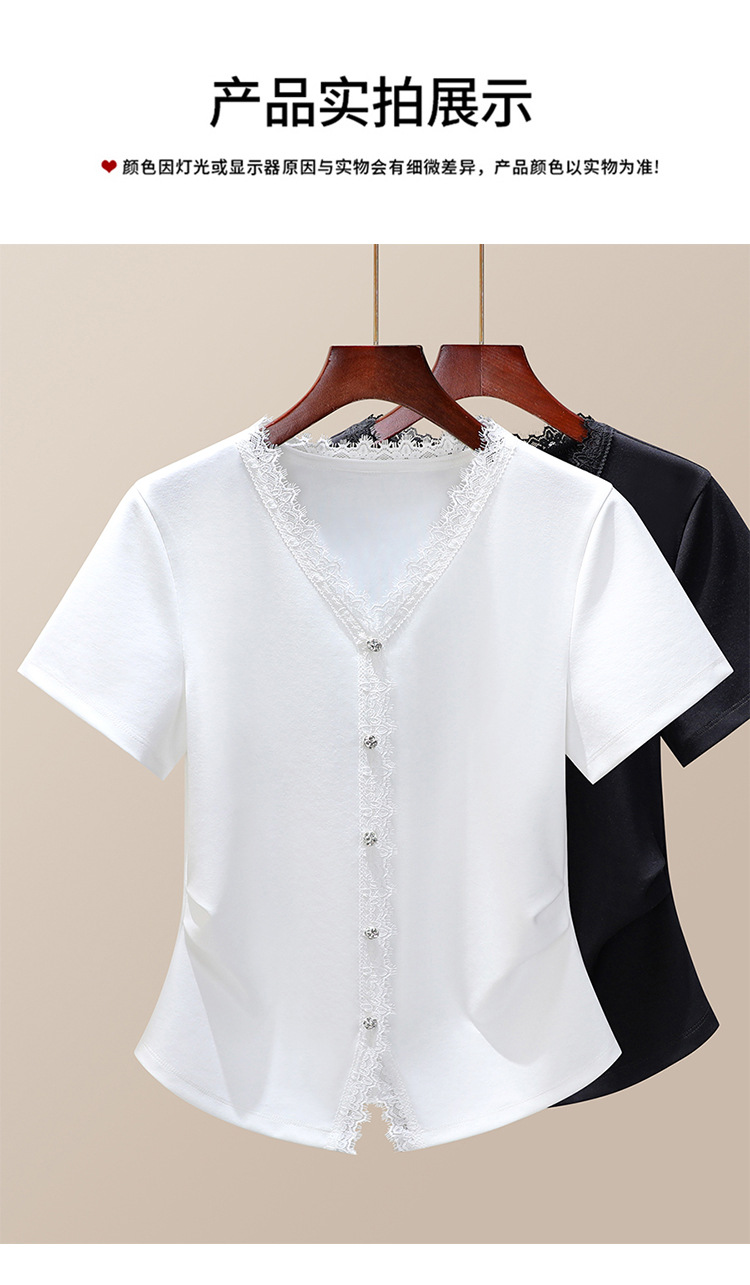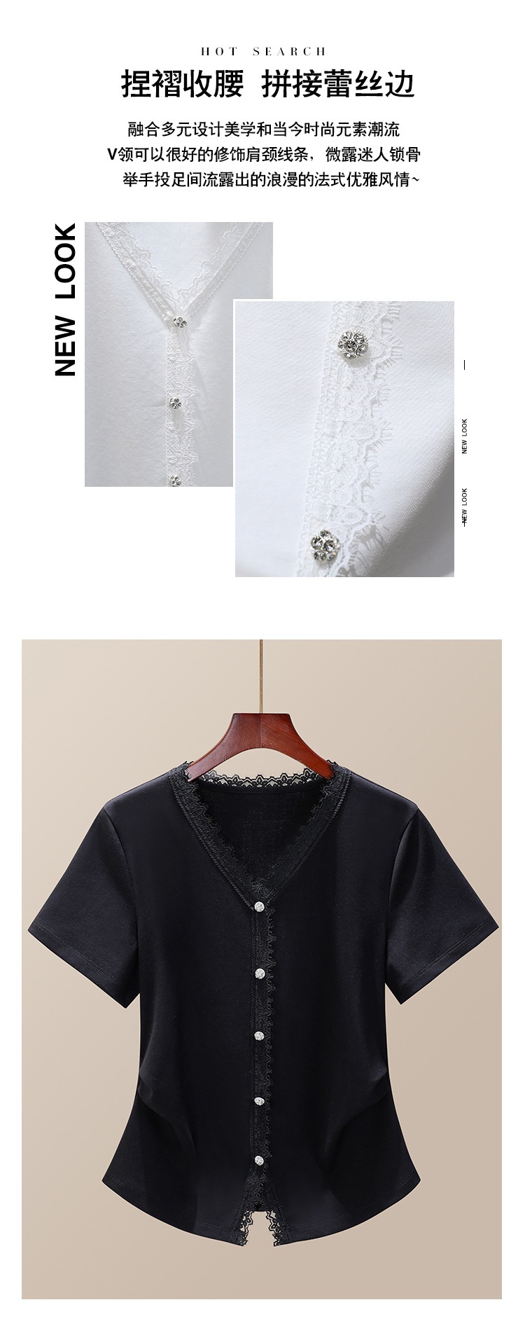 「自j」全新升级【铂金会员119/天猫159/差价40】(01154)洛诗琳法式蕾丝拼接V领T恤2025夏季新款气质显瘦开叉上衣