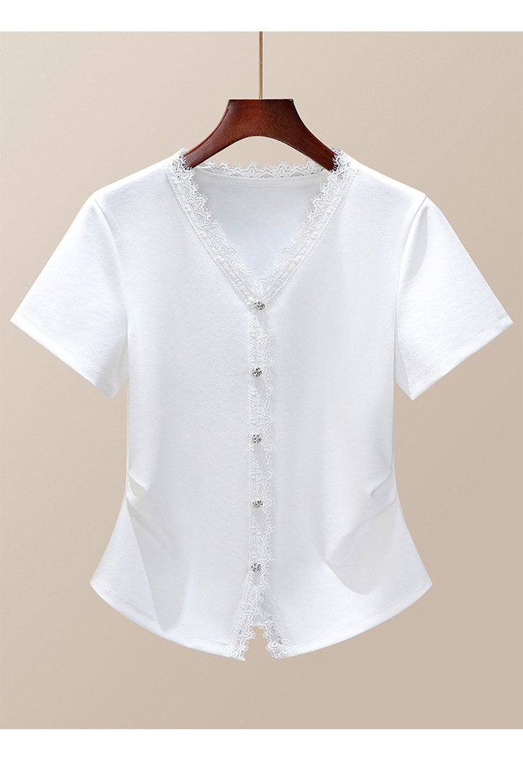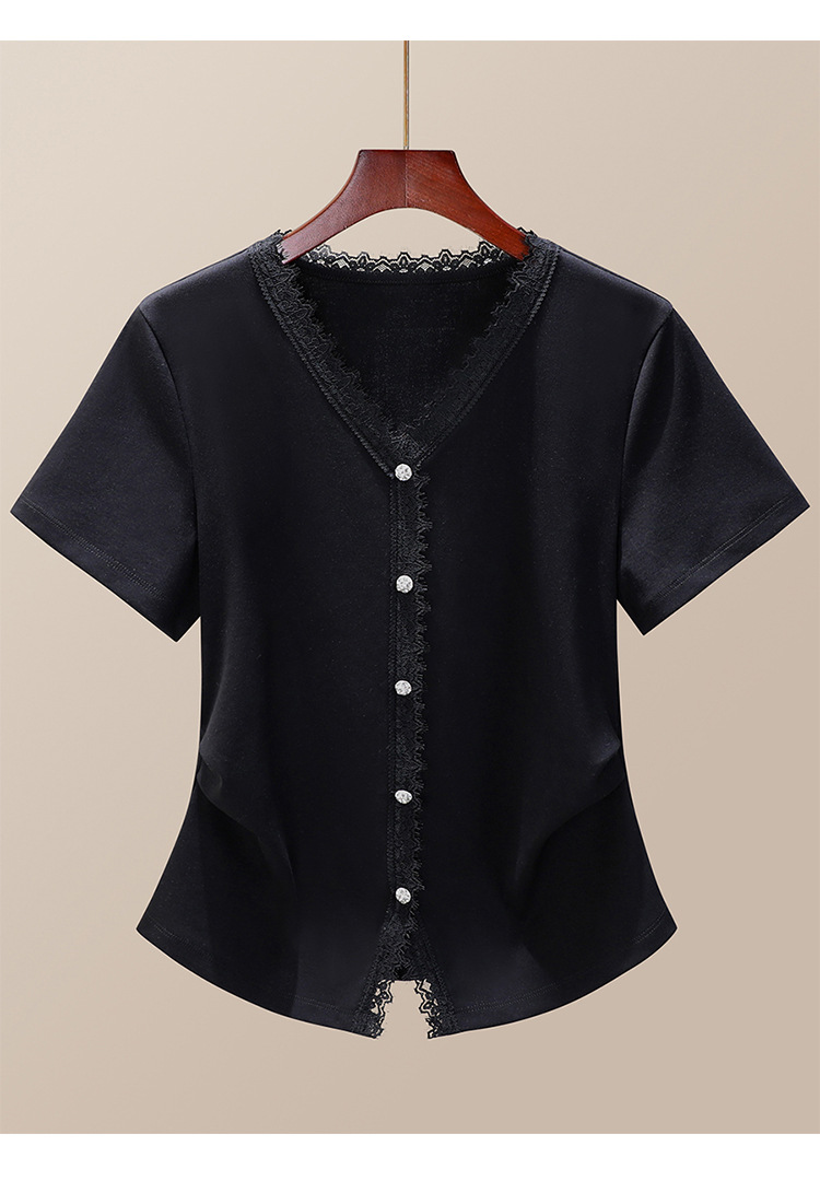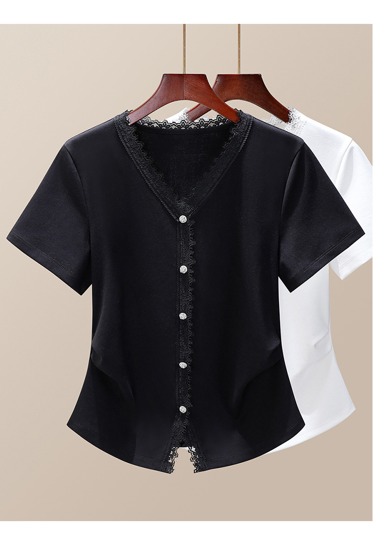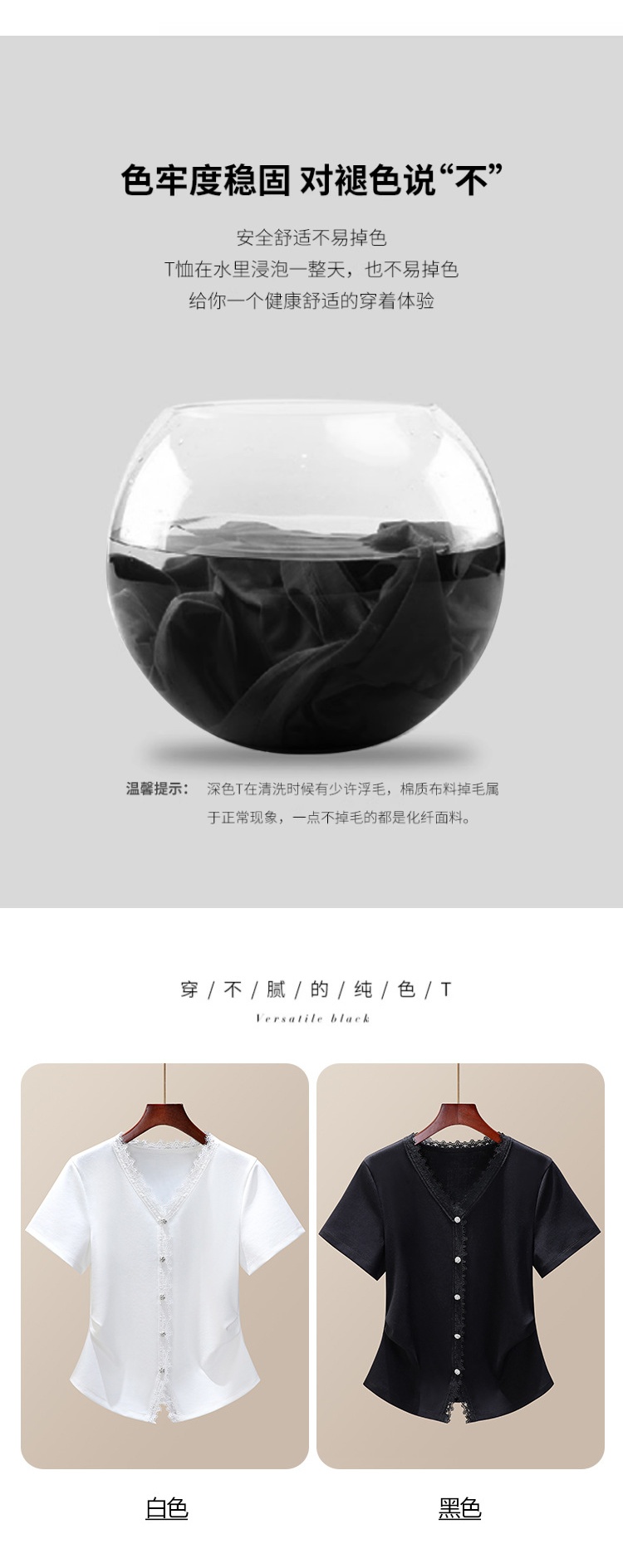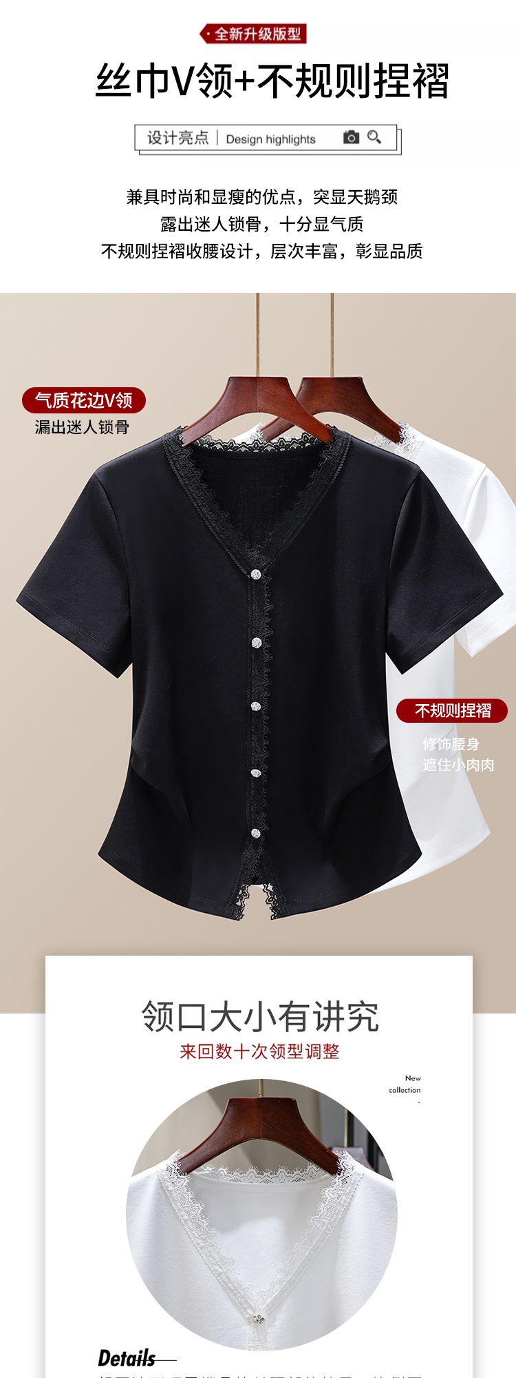 「自j」全新升级【铂金会员119/天猫159/差价40】(01154)洛诗琳法式蕾丝拼接V领T恤2025夏季新款气质显瘦开叉上衣