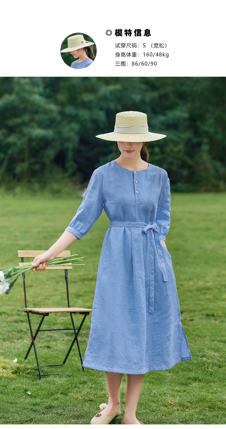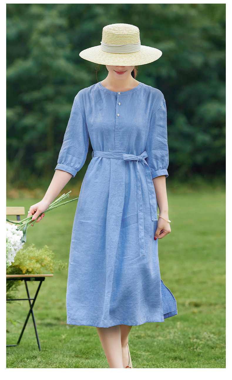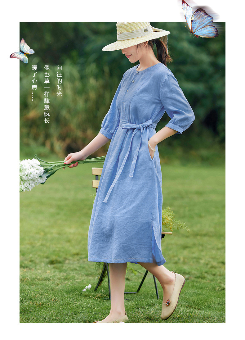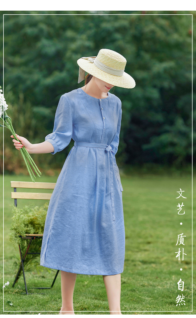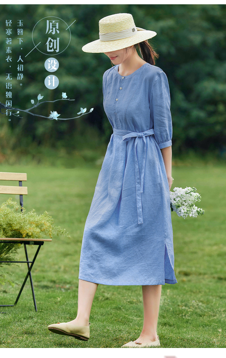 2023春原创文艺亚麻连衣裙纯色气质侧开叉长裙YM-S348