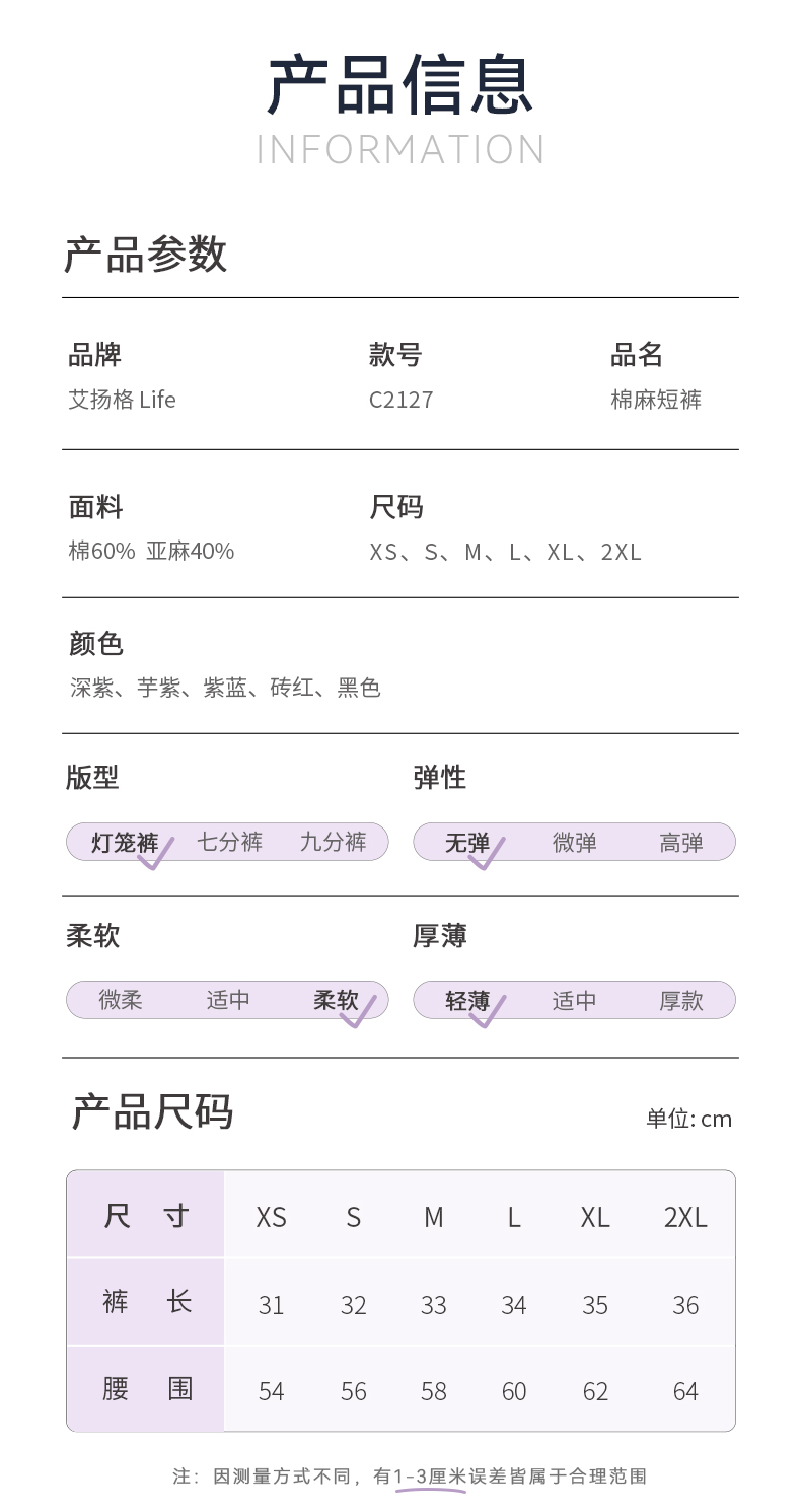 艾扬格 life C2127瑜伽男女同款棉麻短裤 灯笼裤 有口袋 轻薄透气 修饰臀形
