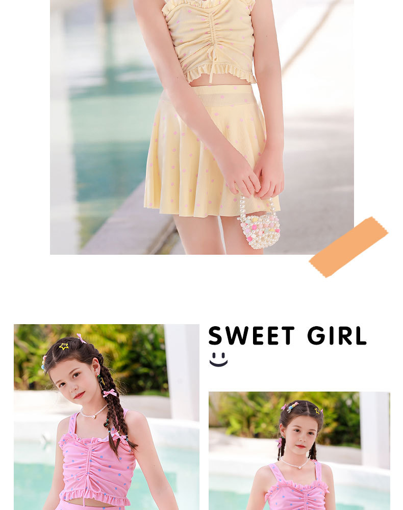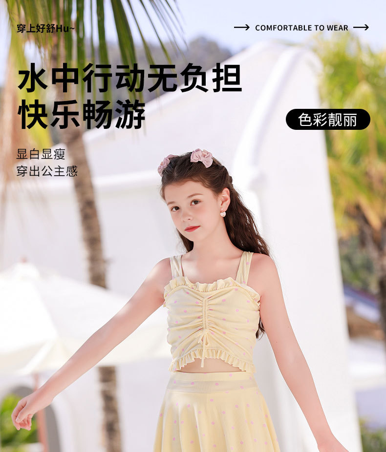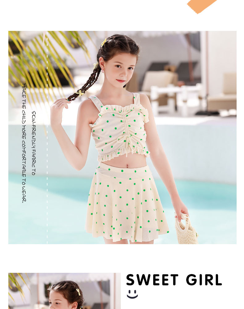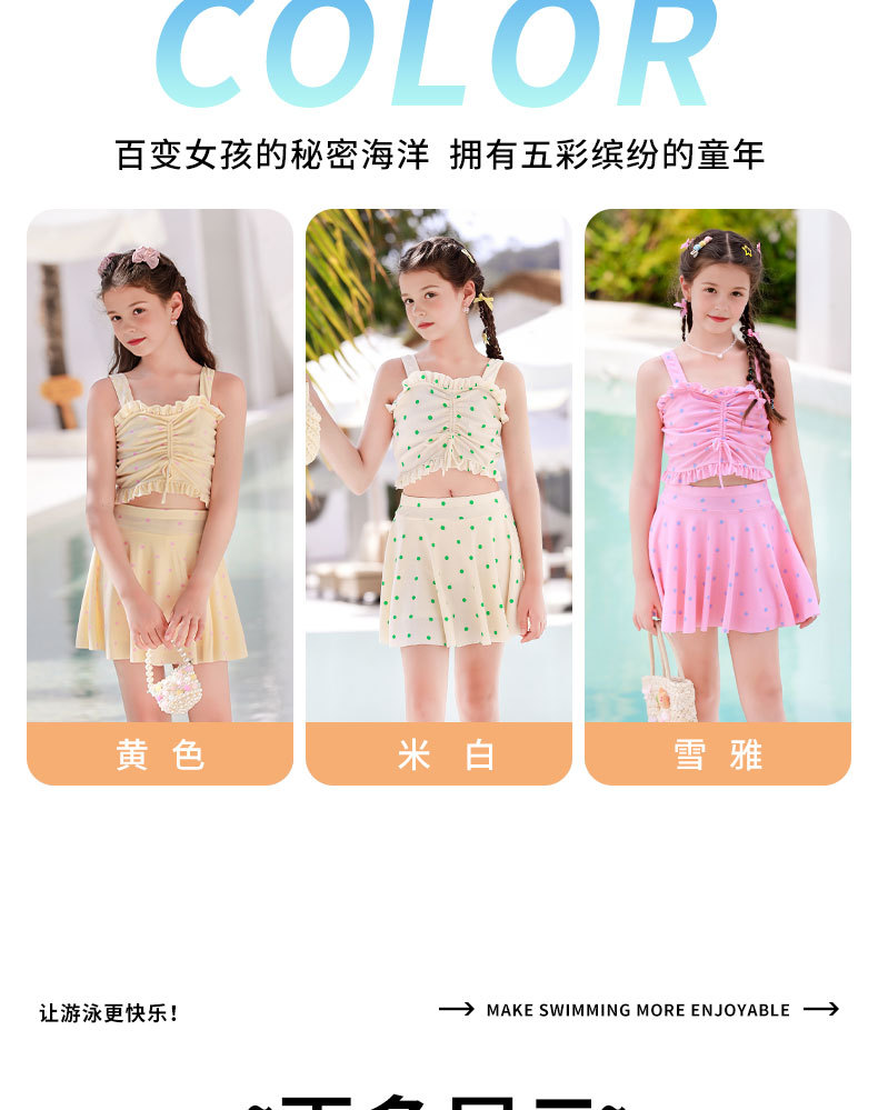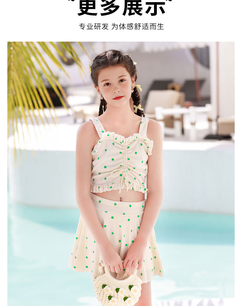 【水中行动无负担,快乐畅游~】儿童泳衣新款 女童中大童 可爱小清新 波点分体吊带裙式 少女度假泳装-QQ