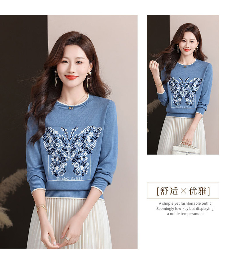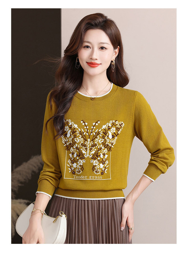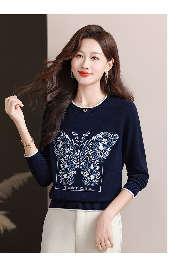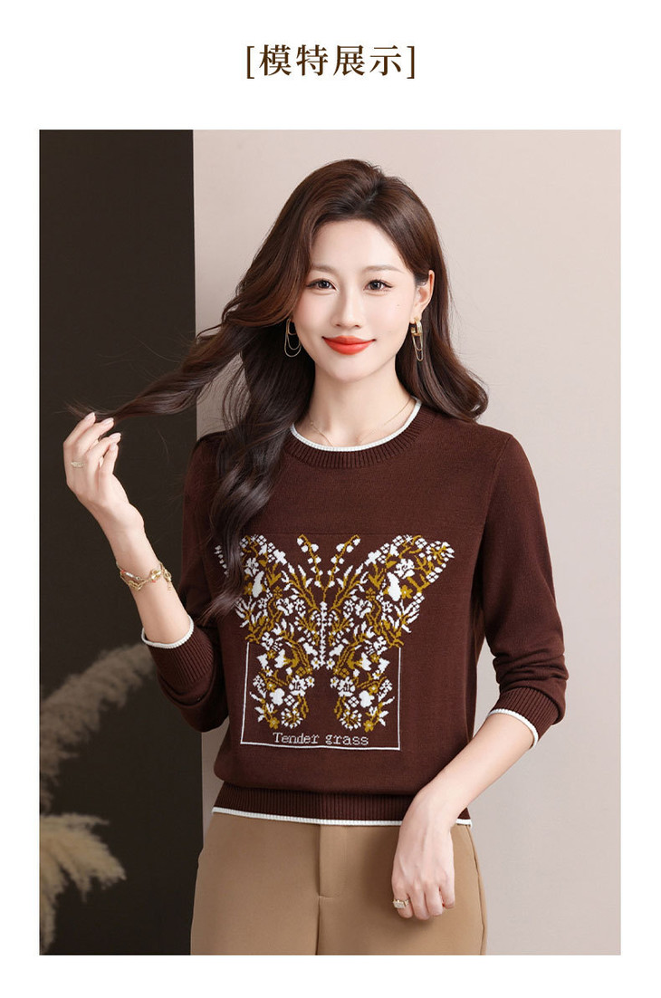 蝴蝶提花圆领针织衫, 复古风长袖显瘦套头百搭毛衣上衣CC-89-855