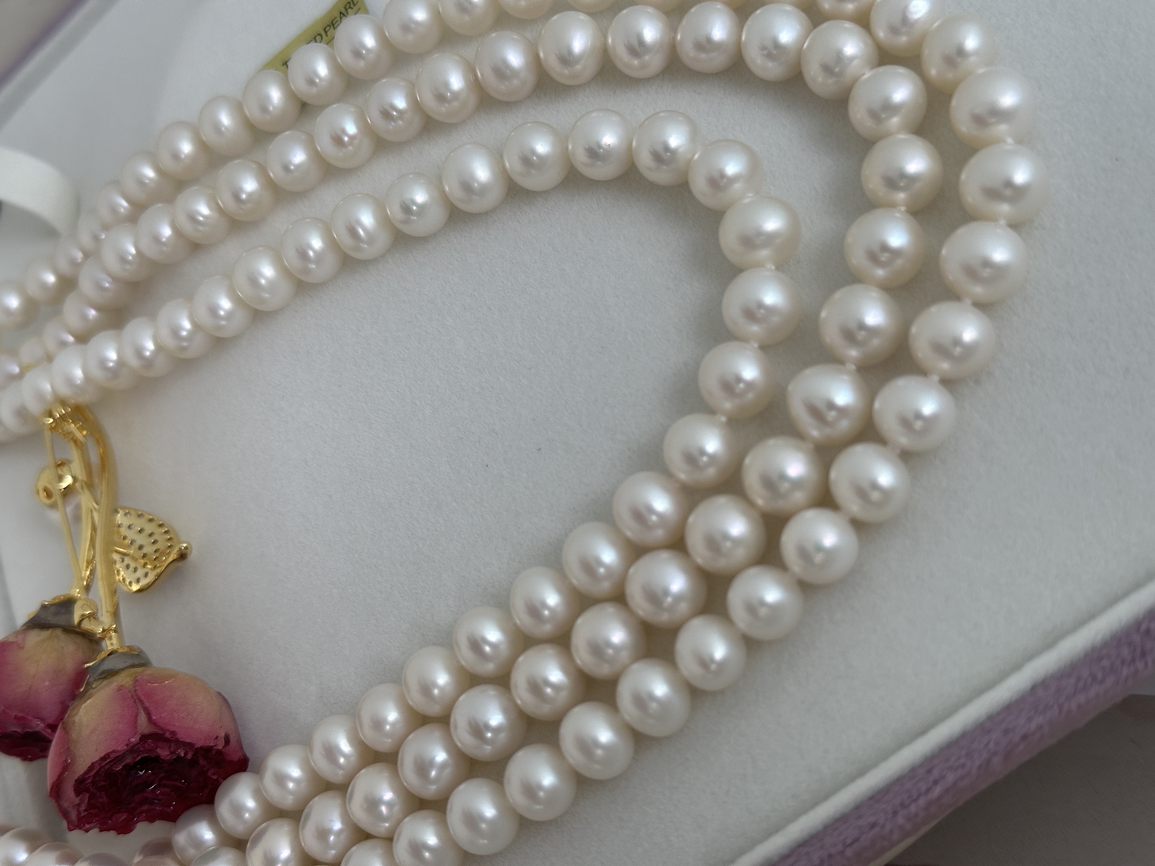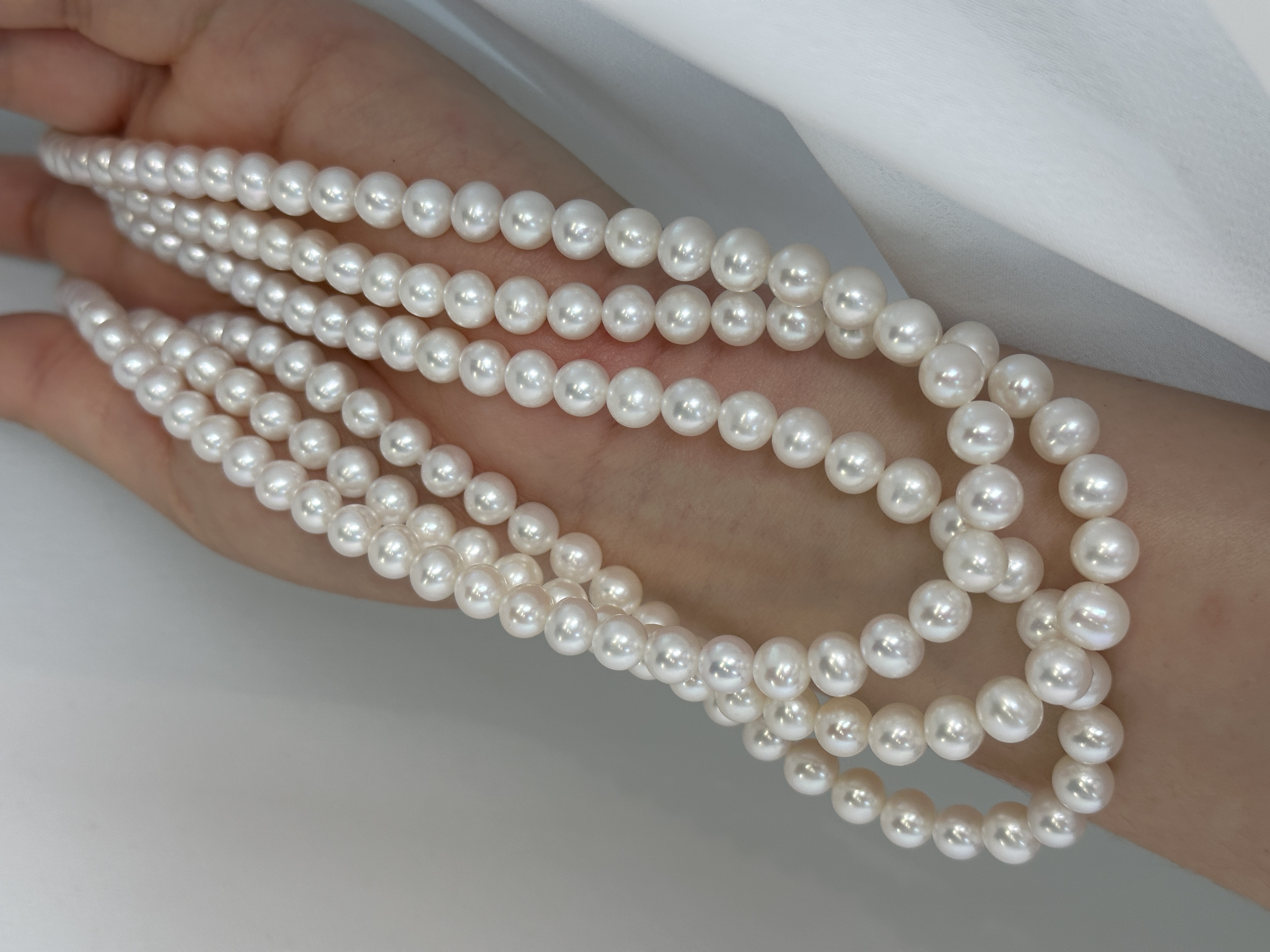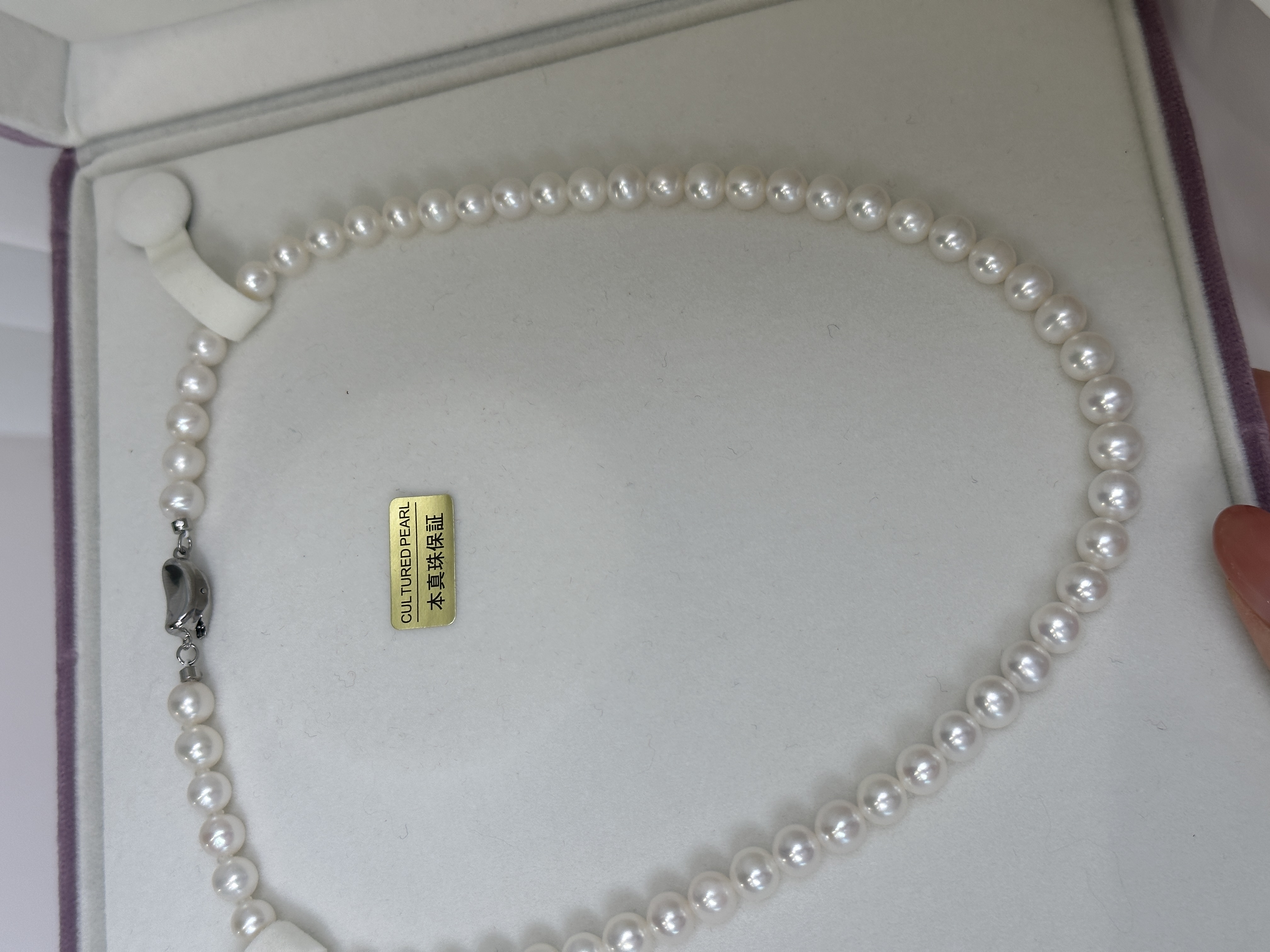第三组:7.5-8.5mm,近正圆,无暇。这几条是无暇的,适合对瑕疵要求比较高的妈妈们哦~佩戴之后视觉上也是蛮圆的,所以性价比很高的哦。售价1380一串。