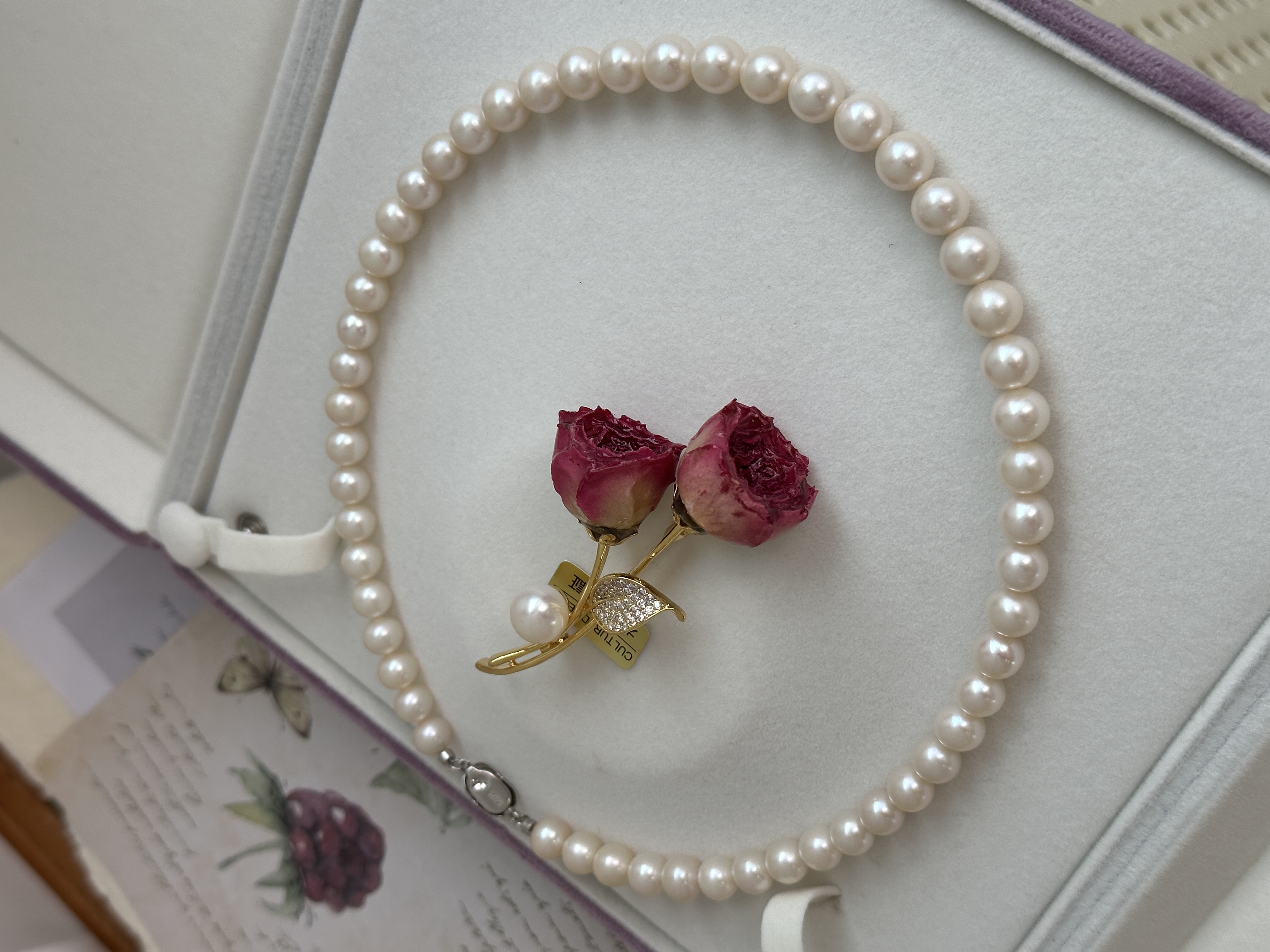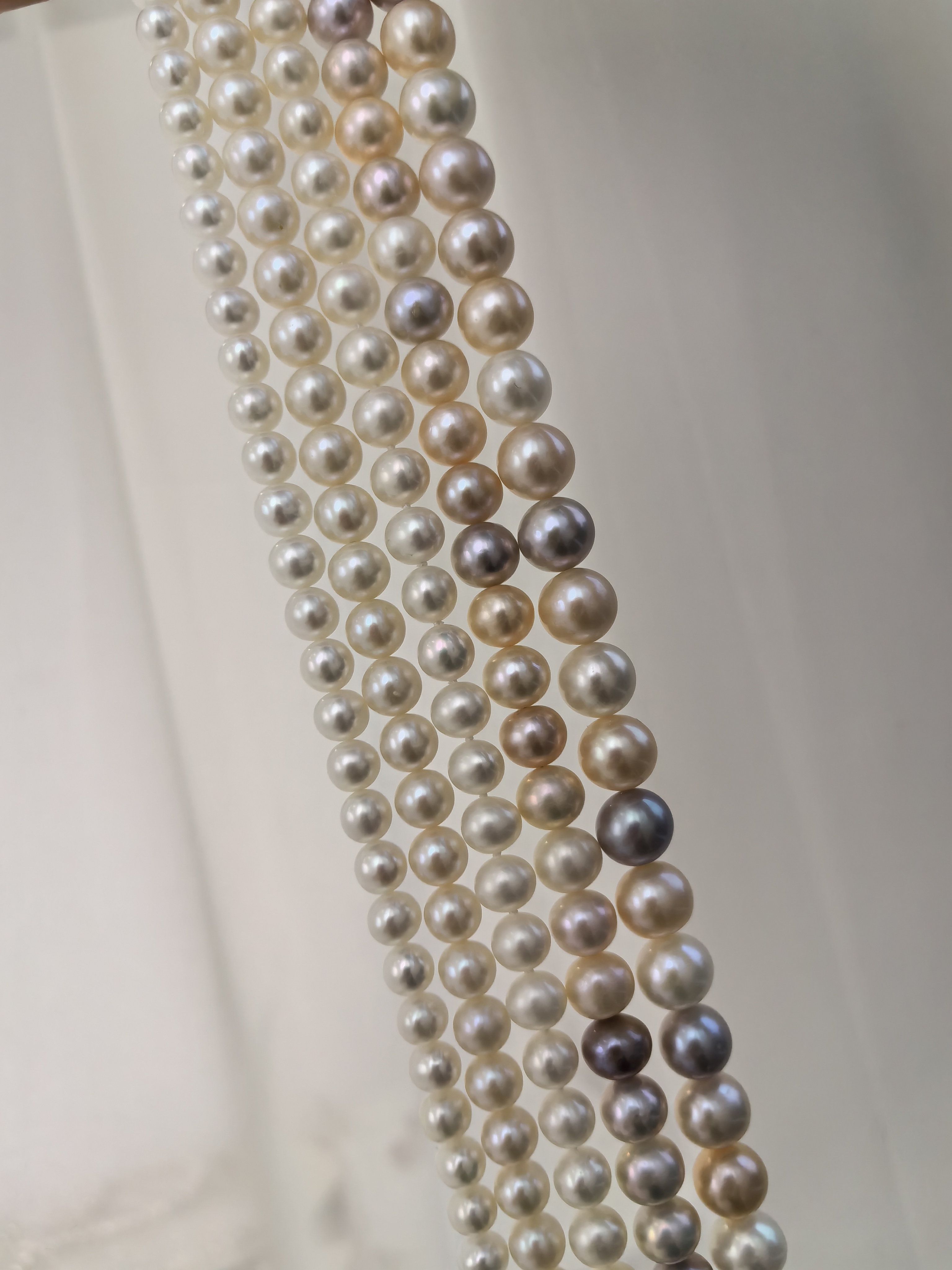 第一组:6.5-7.5mm,无核串链。比较日常放松的大小,珠子是近圆,微瑕,整体长度42.5cm。售价780一串。