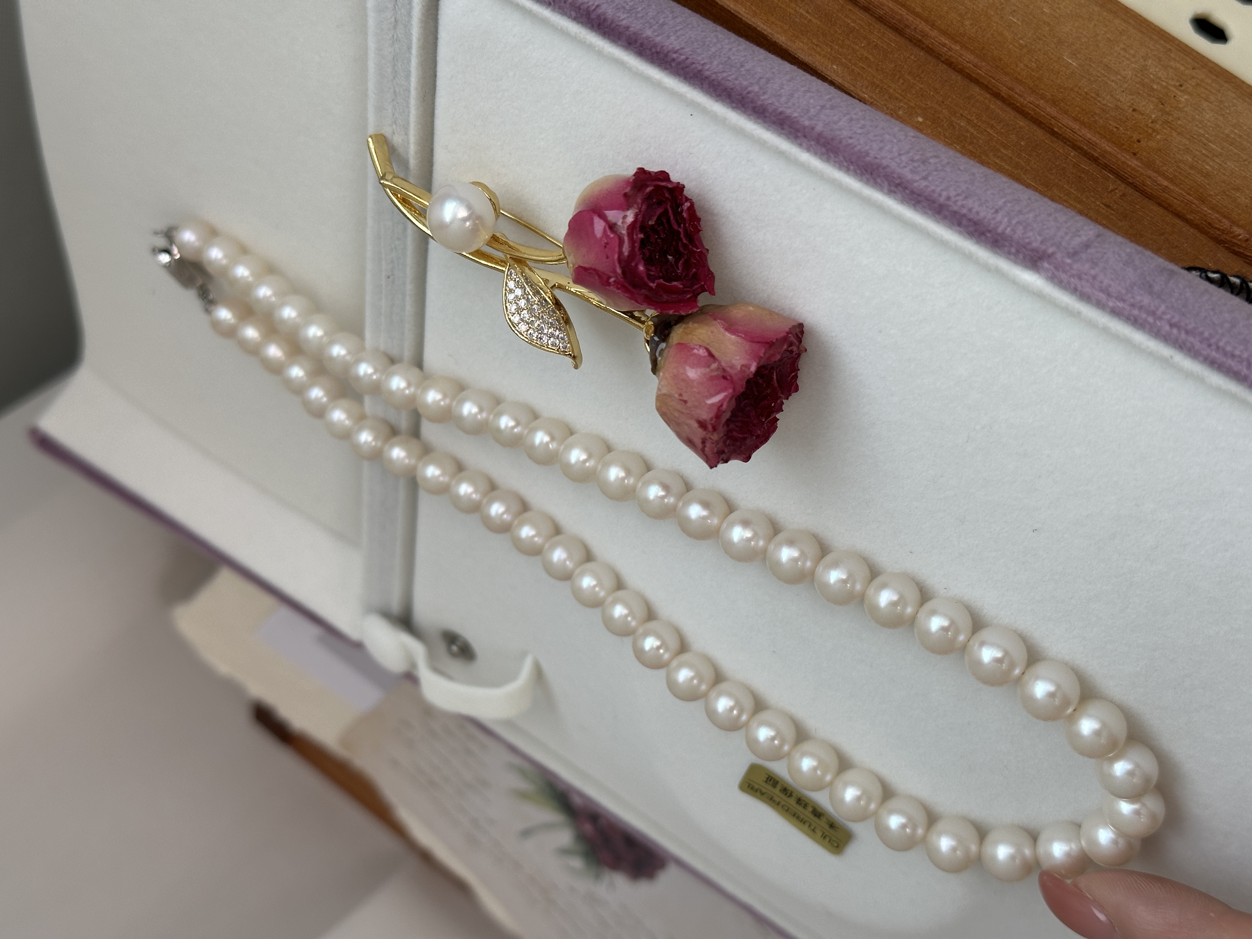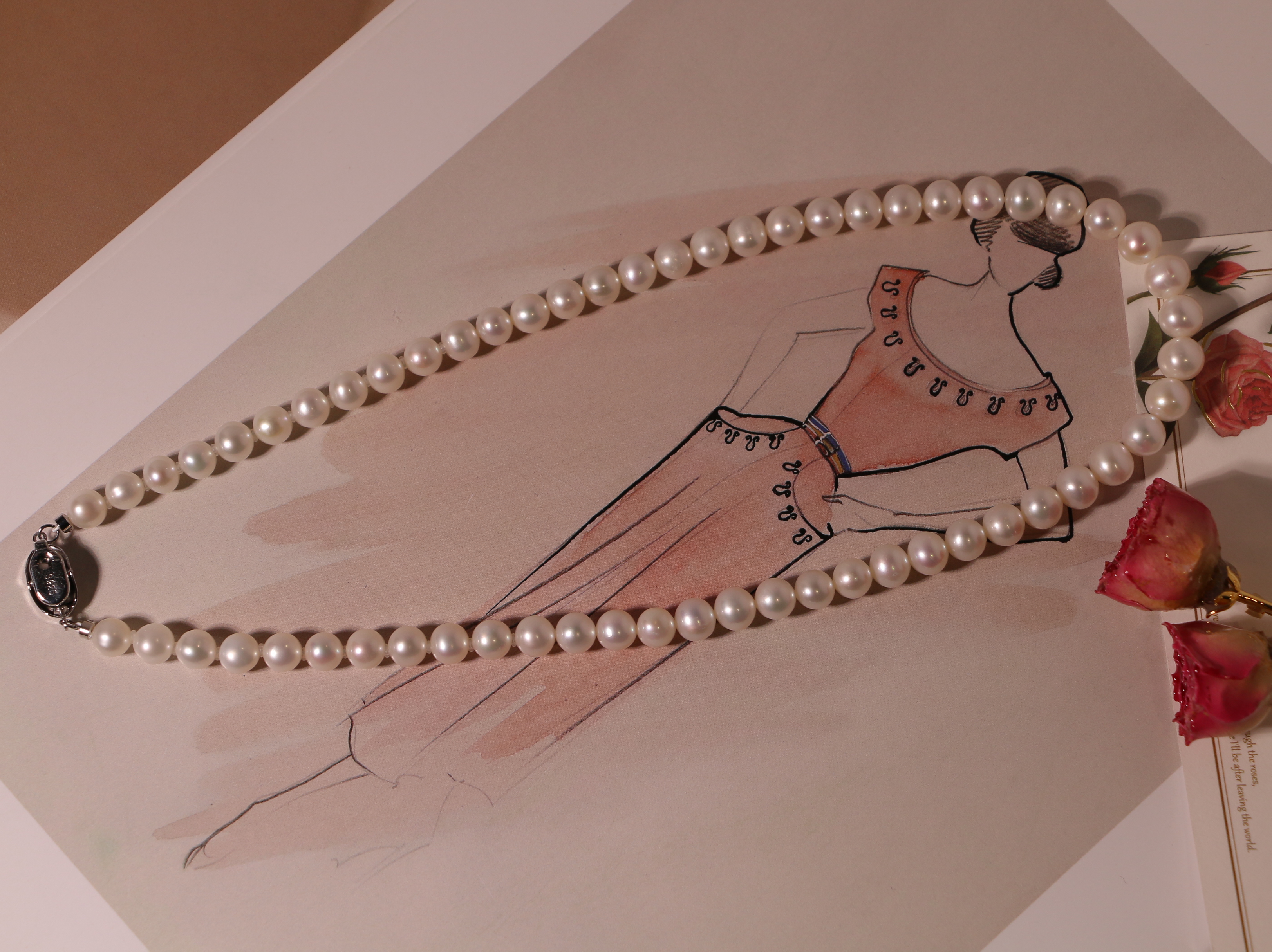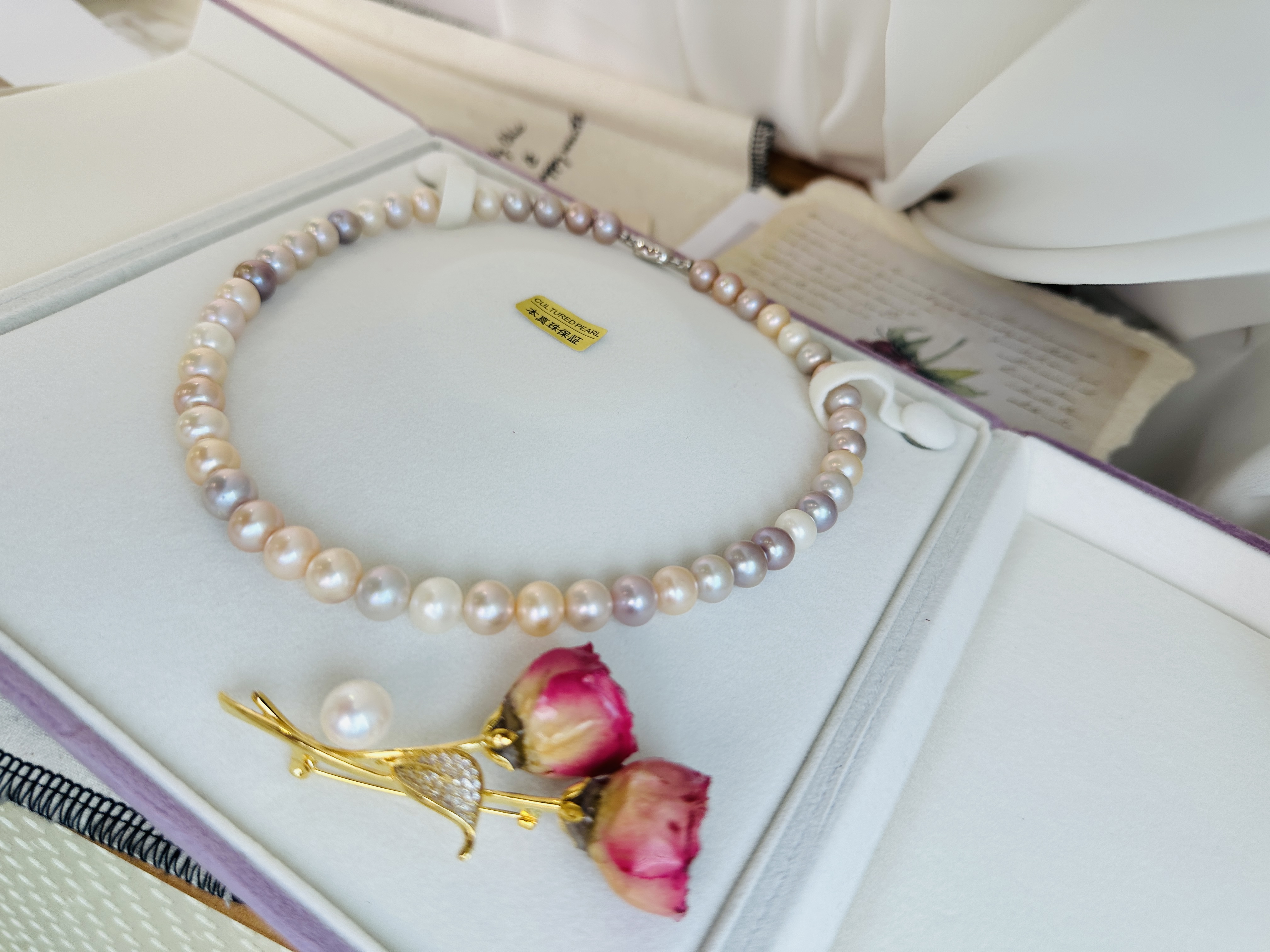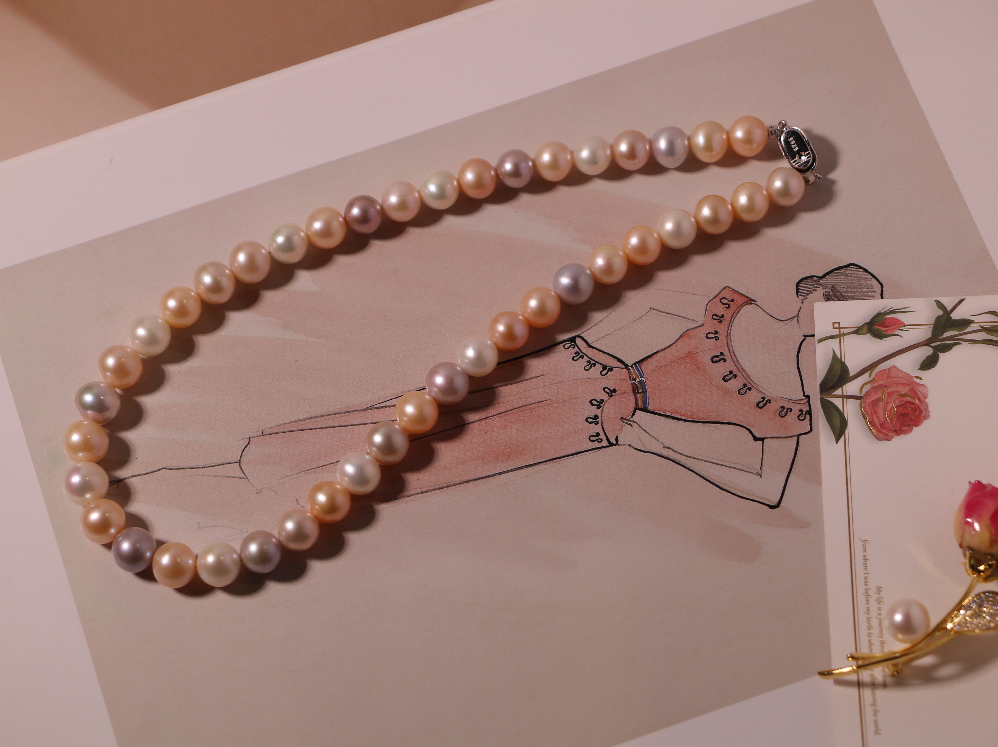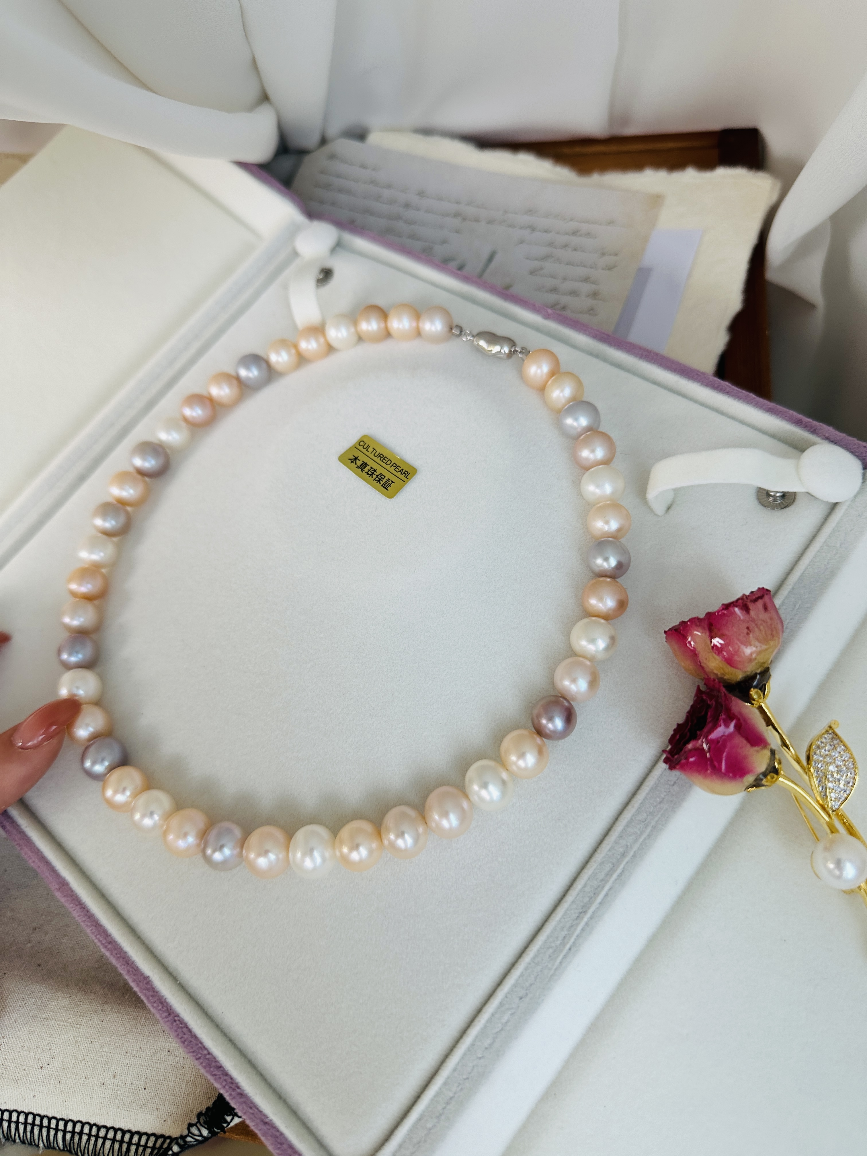 第五组:9.5-10.5mm,比较大一点的一个点位。但是其实上身完全不压人。GRC认证的"Iris Candy",近正圆,微瑕。整体圆度比上面那个点位的好一些。珠宝感更强一些。有预算的姐妹不妨考虑这串。送人也很拿得出手。售价1499一串