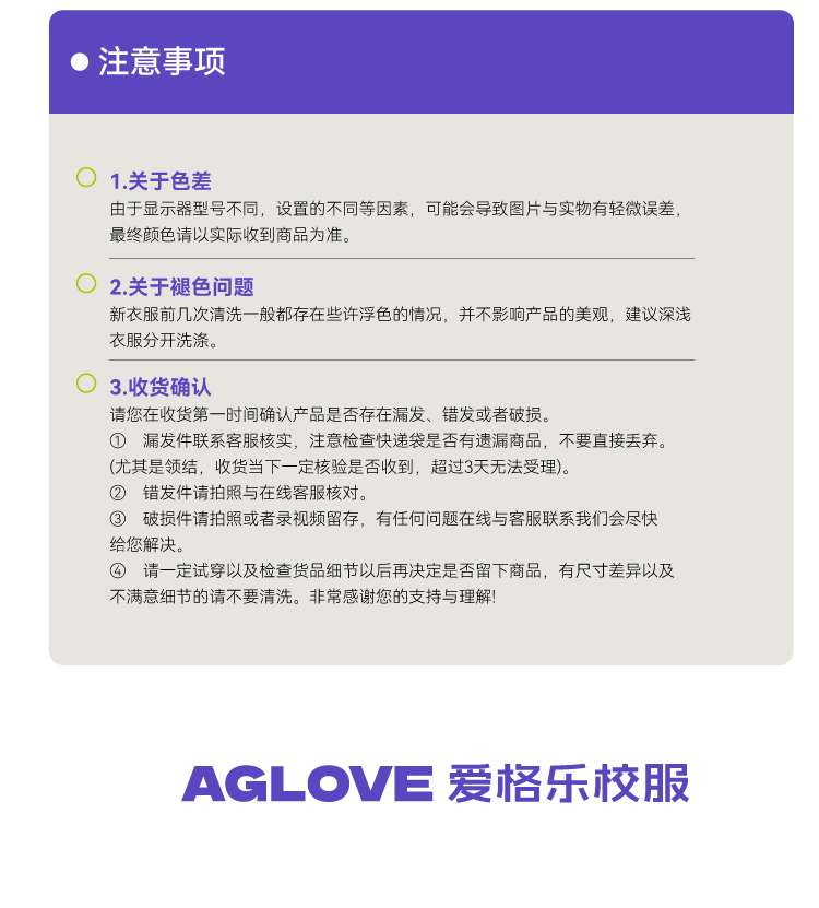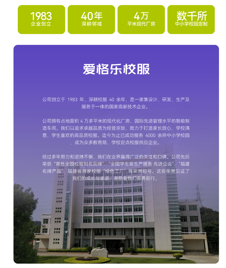 - 爱格乐制衣有限公司,是集学生服装生产、销售、物流及服务为一体的大型综合性企业。以优质的产品和服务为教育事业贡献力量。