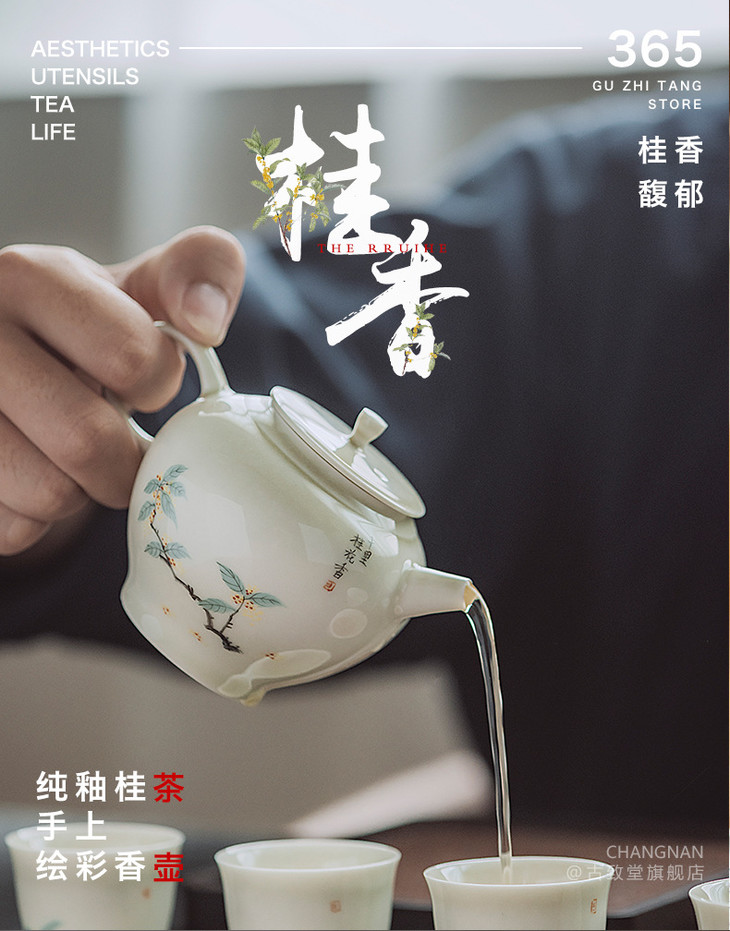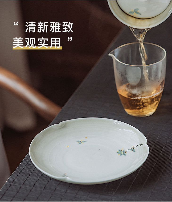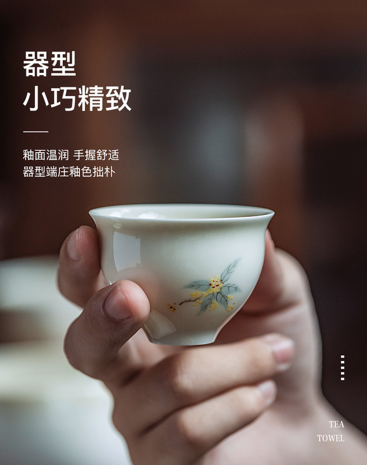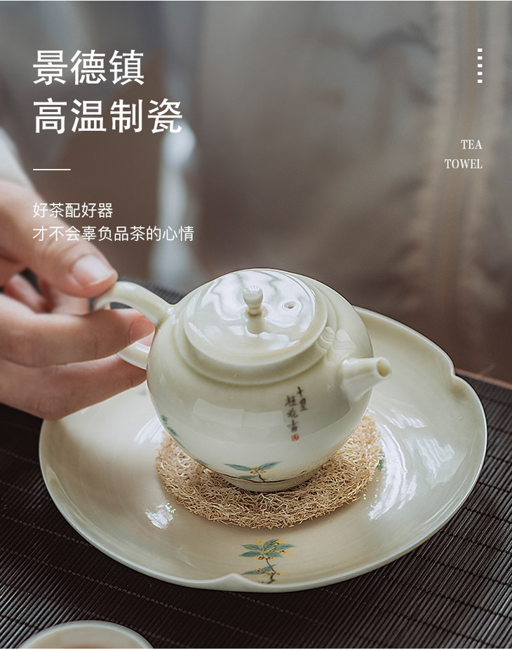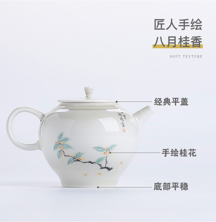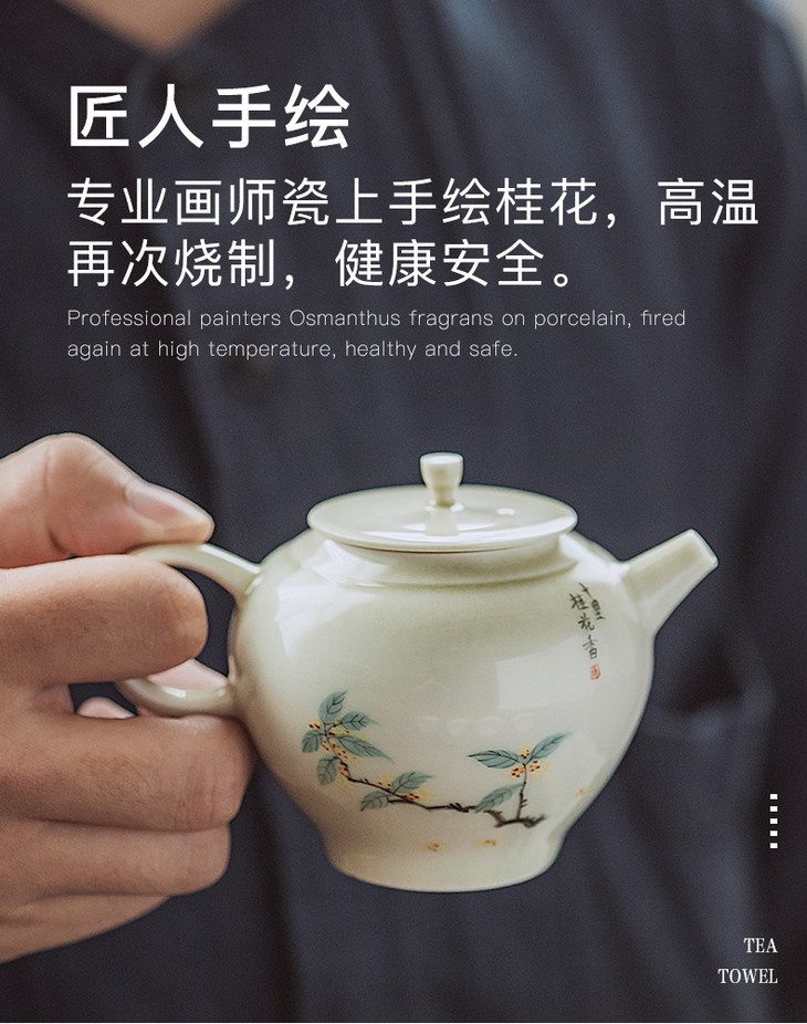 「景德镇手工手绘桂花茶壶茶具」青灰釉宋代美学球孔小茶壶 品茗杯 复古干泡盘 三才盖碗 家用陶瓷茶具