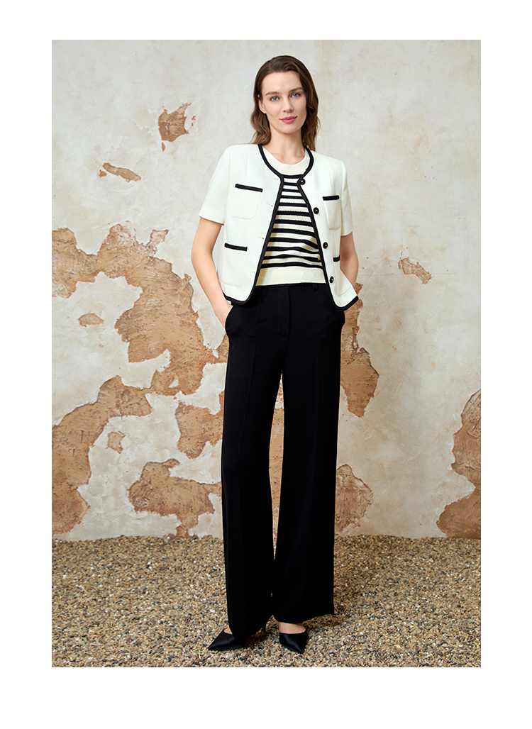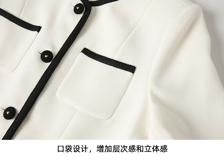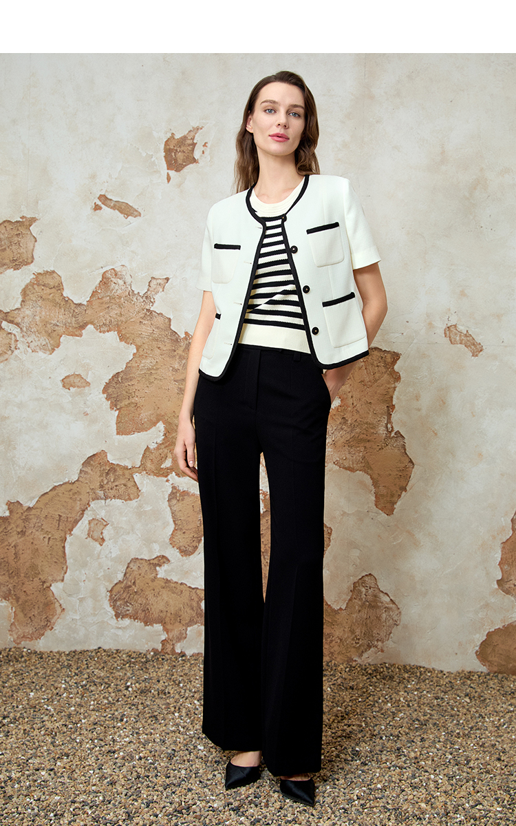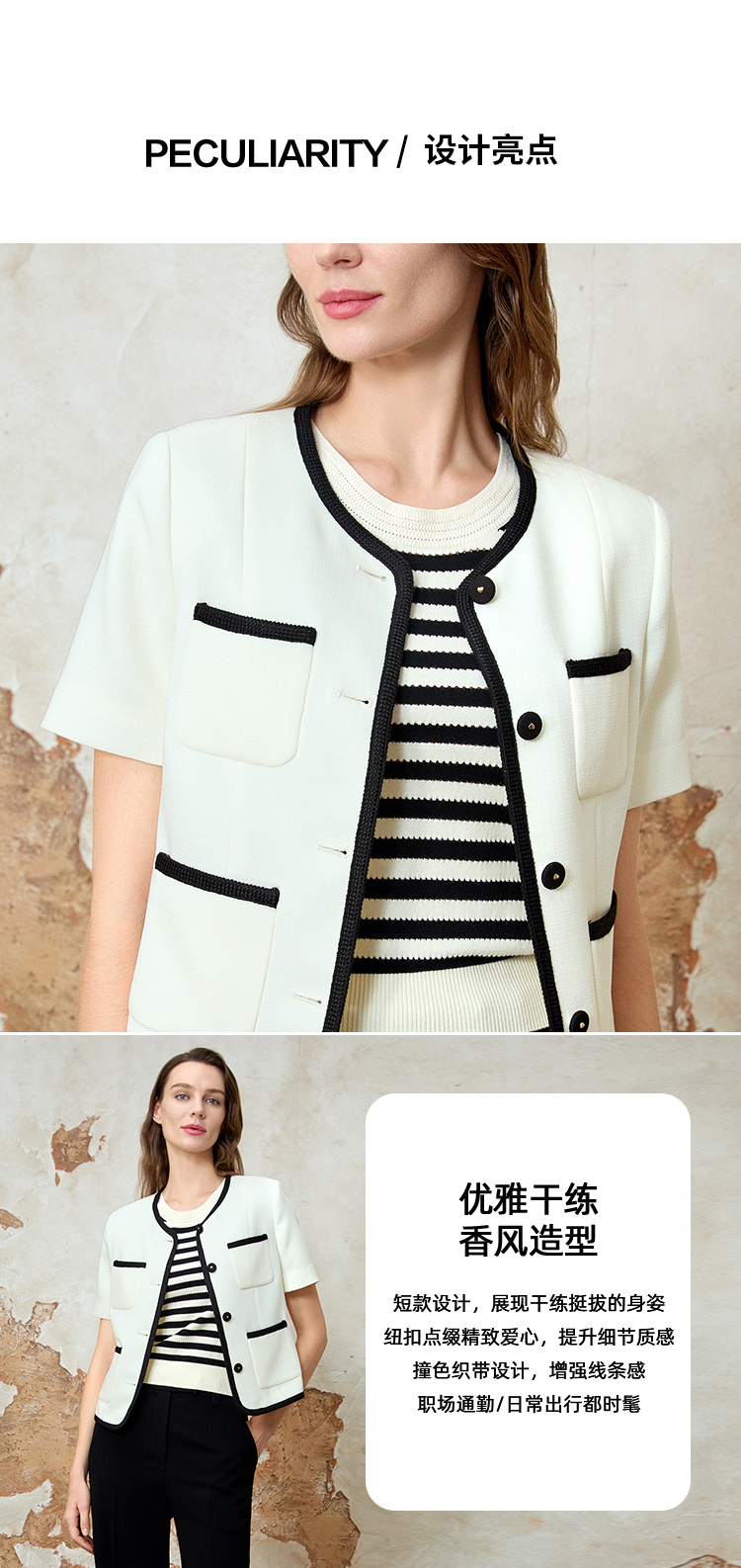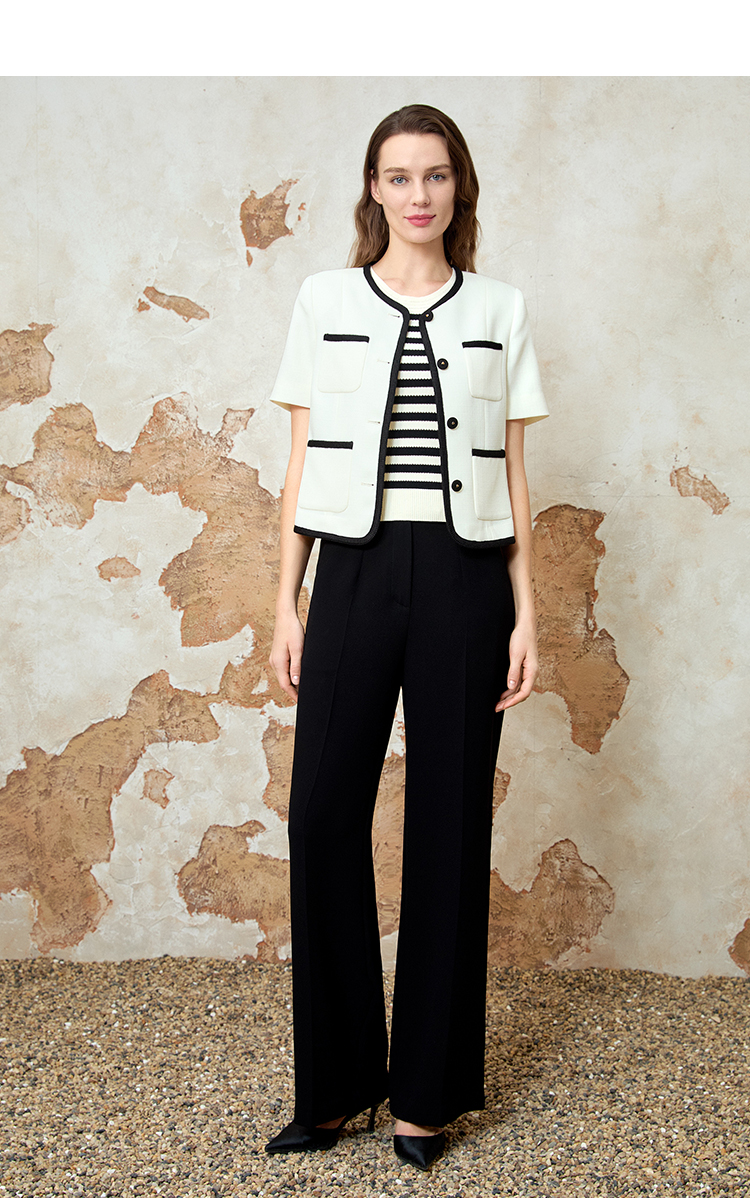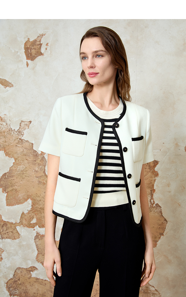 EITIE爱特爱气质圆领小香风撞色短款百搭短袖开衫外套春新款8103809