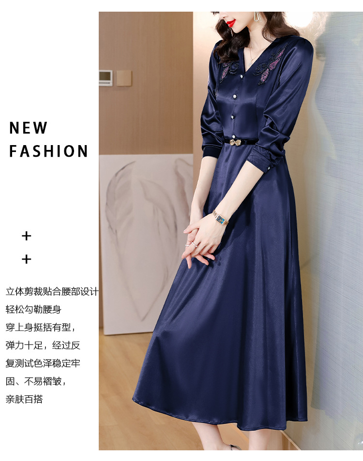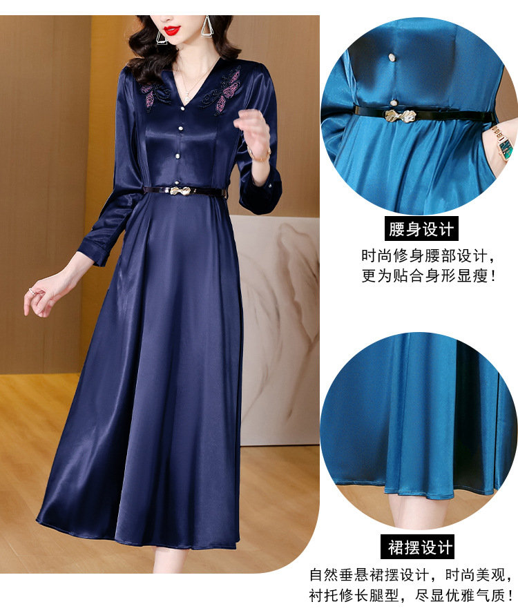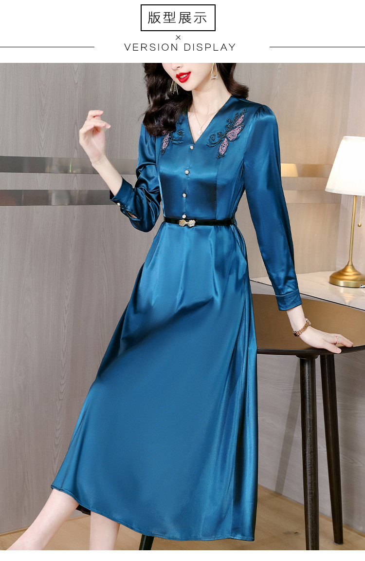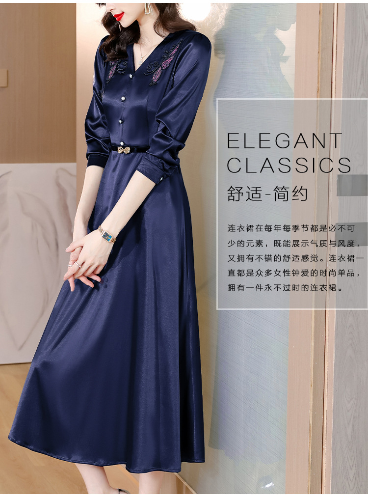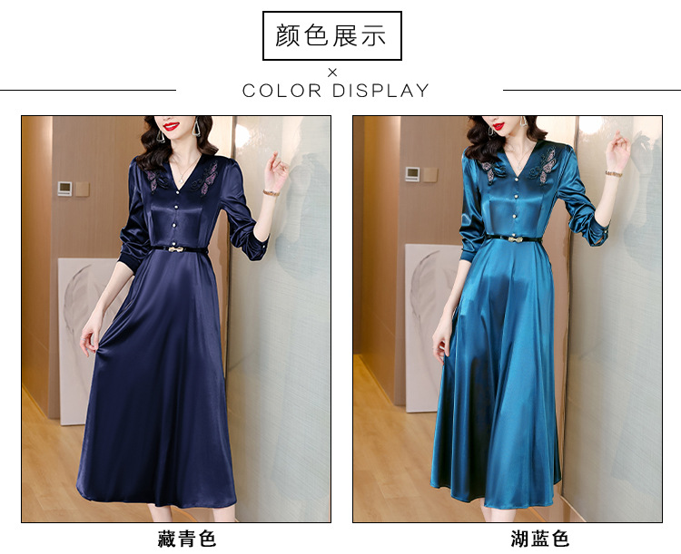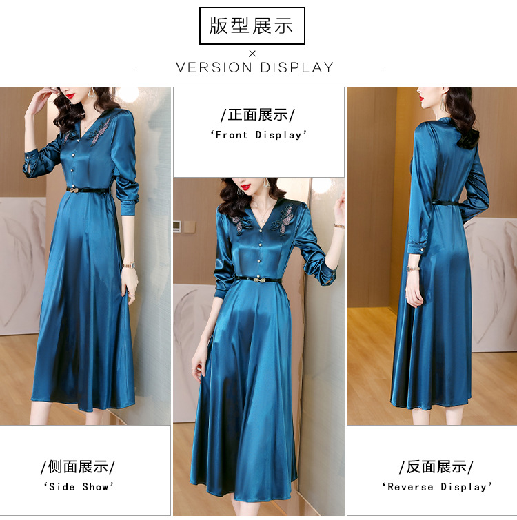 NYL62730 重工刺绣醋酸缎面连衣裙女2022秋季新款时尚洋气V领拼接显瘦遮肚