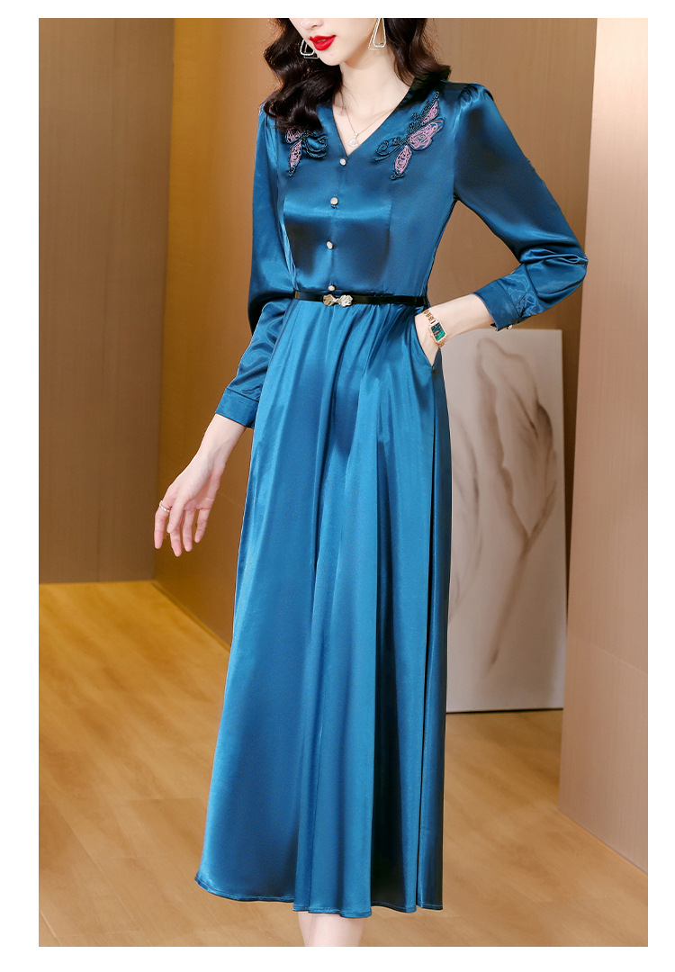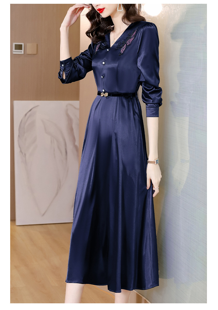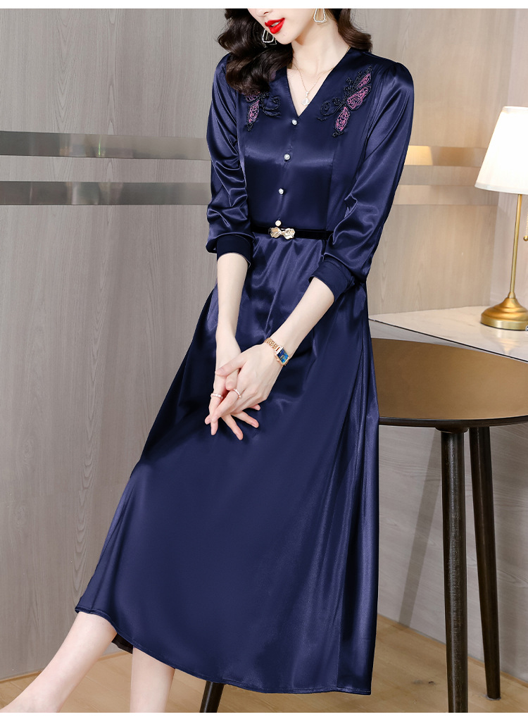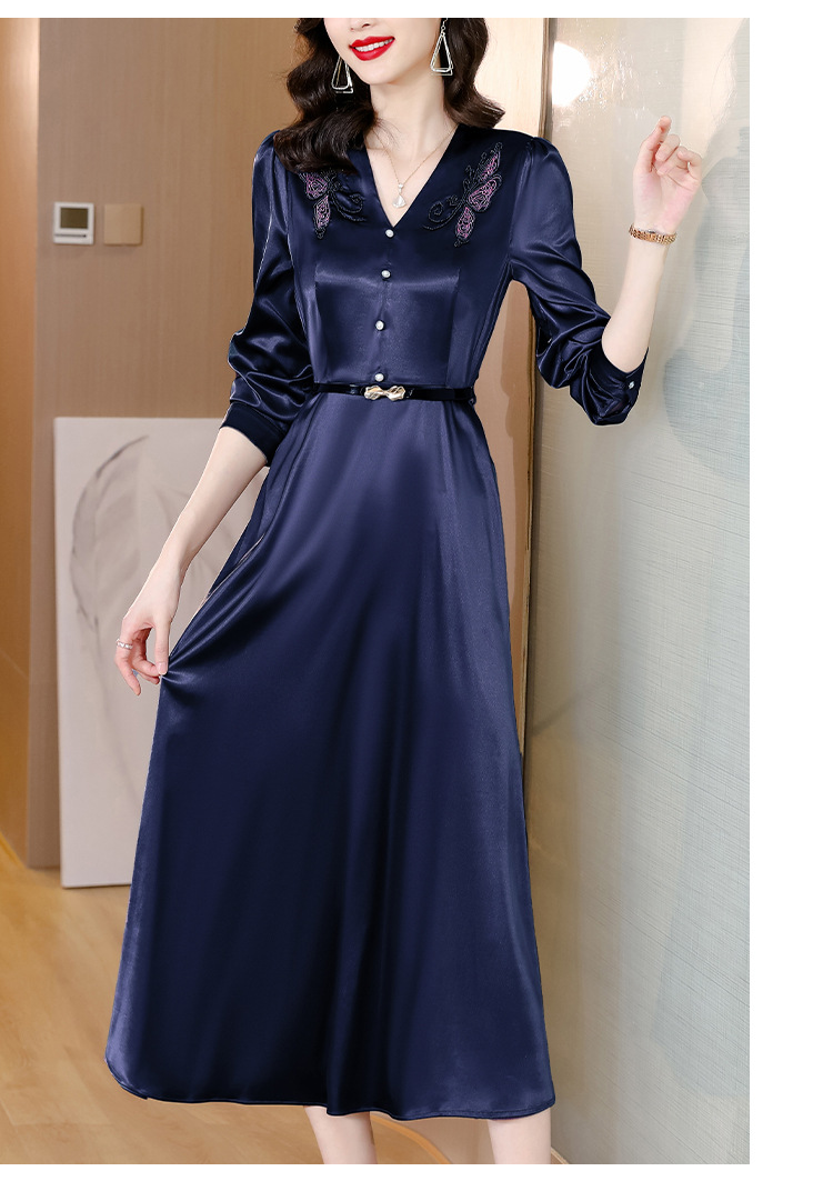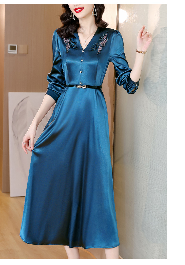 NYL62730 重工刺绣醋酸缎面连衣裙女2022秋季新款时尚洋气V领拼接显瘦遮肚