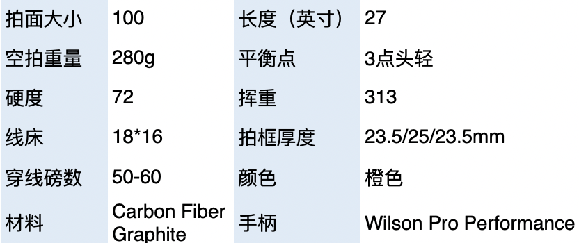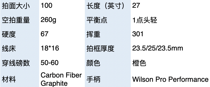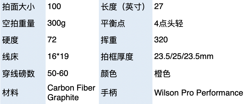 100拍面,300克重量,4点头轻,这些参数都使得它在挥拍时非常灵活和迅速,可以打出快速的球速和角度。而16*19较开放线床也有助于产生上旋,进一步扩大底线击球的优势。