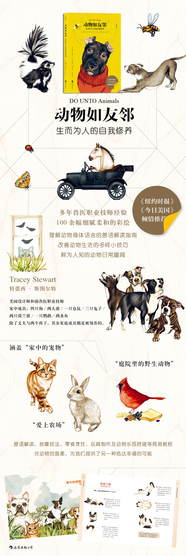 本书中,特蕾西·斯图尔特结合自身多年的兽医职业技师经验,与读者分享了改善动物生活的秘诀。全书涵盖“家中的宠物”“庭院里的野生动物”与“爱上农场”三部分,通过兽语解读、按摩技法、零食烹饪、玩具制作及动物乐园搭建等简易教程,鼓励人们将好奇与仁爱的情绪化为行动,与周围的动物建立亲密关系。她以幽默、细腻的笔触描绘了人与动物之间的温暖趣事,并透露了宠物店与工业化养殖场不会告诉我们的内幕,呼吁我们正视自身与动物相互依存的关系。