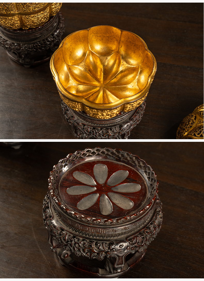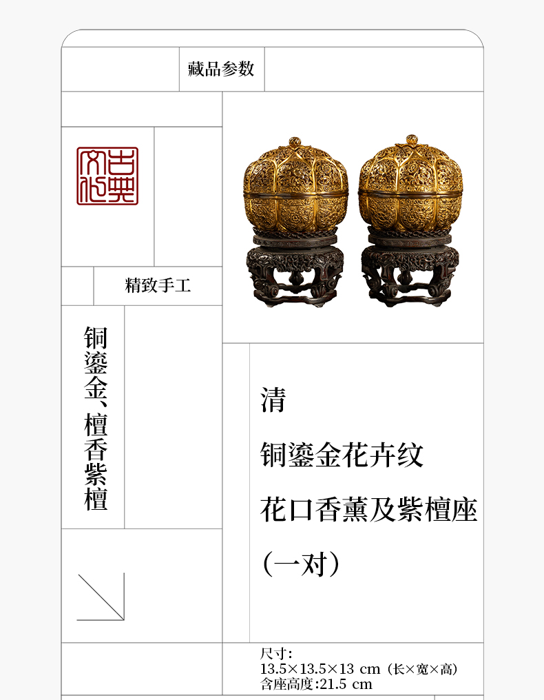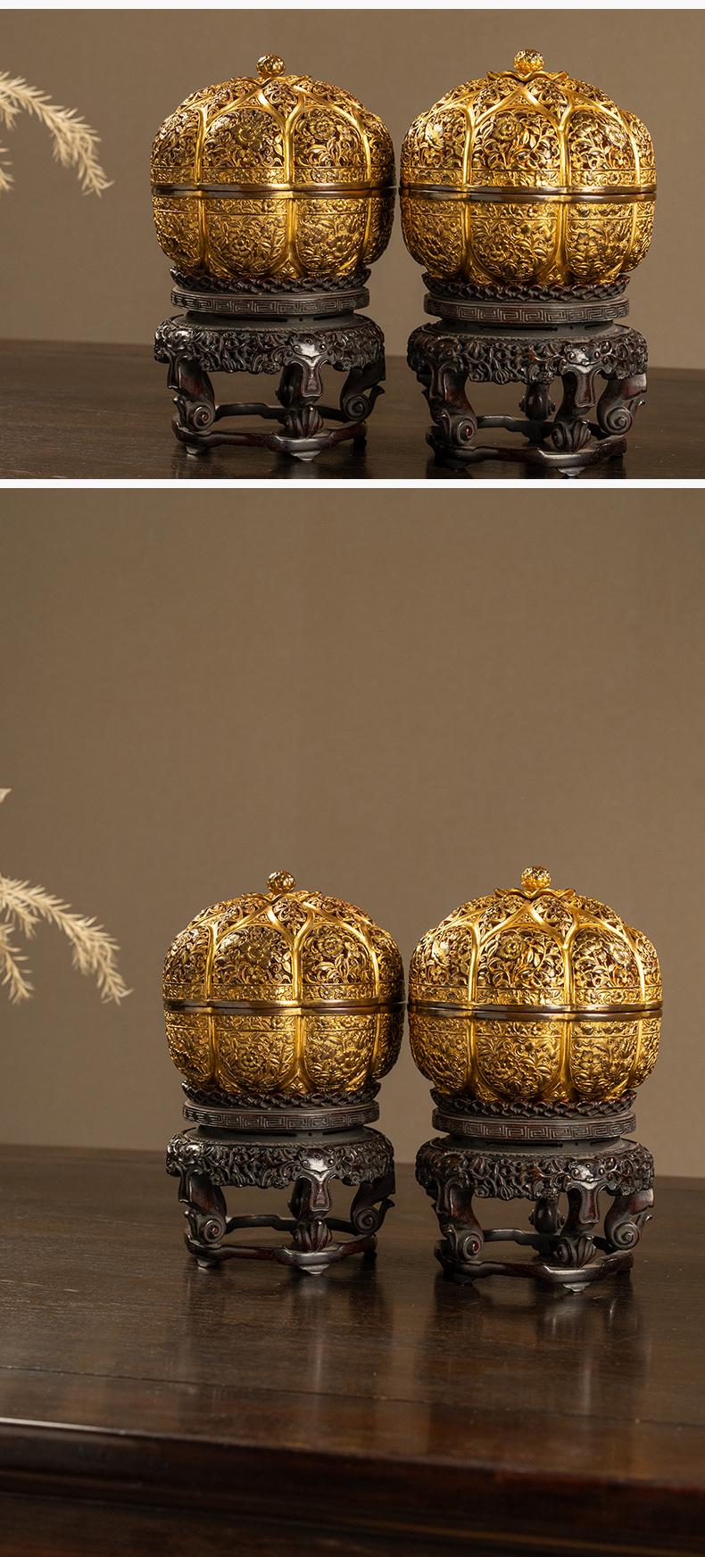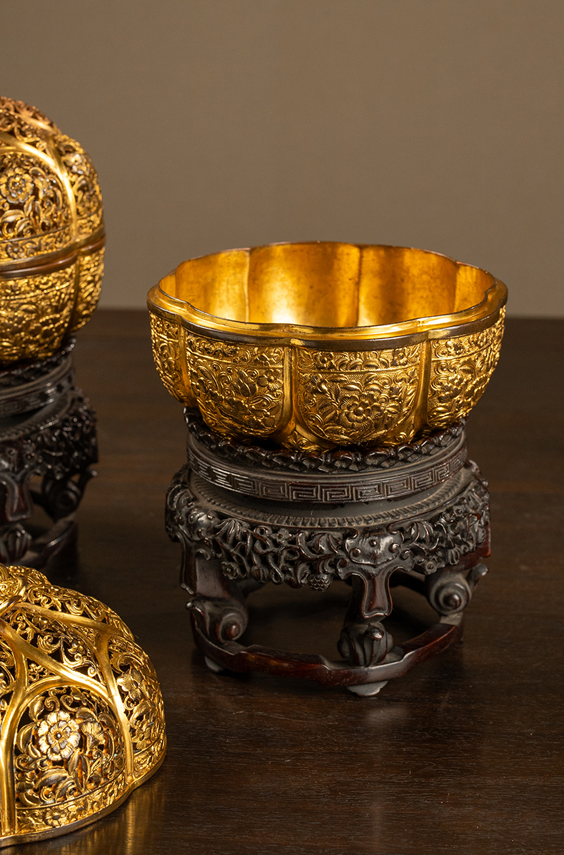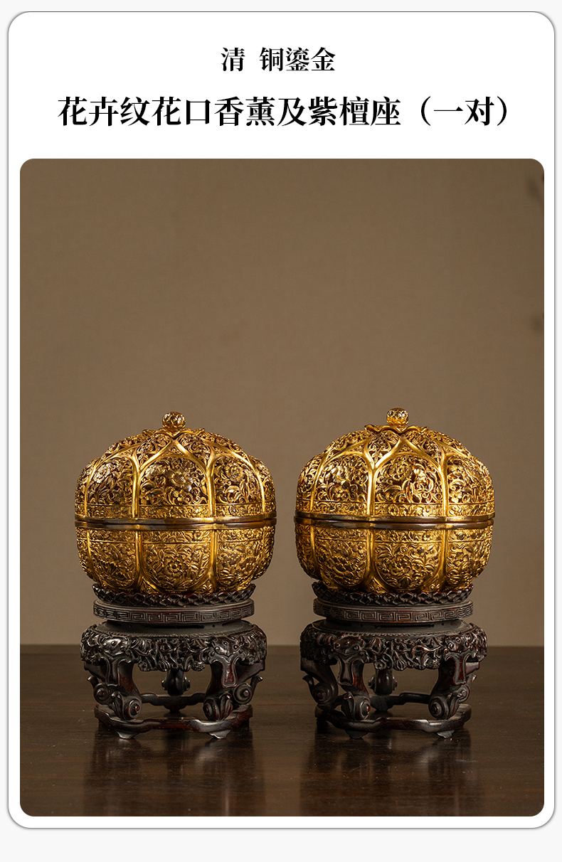清 铜鎏金花卉纹花口香薰及紫檀座(一对)