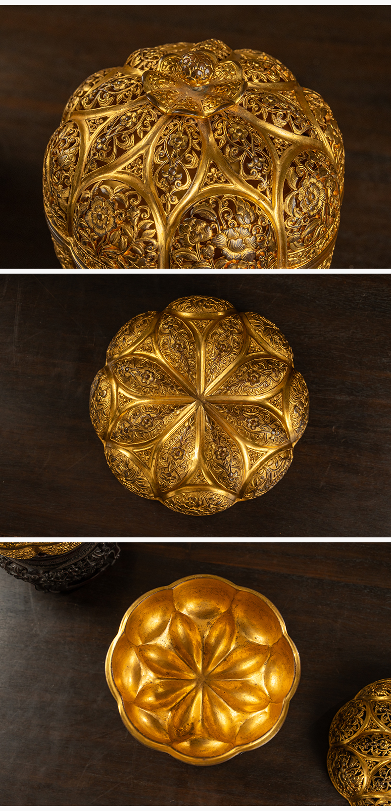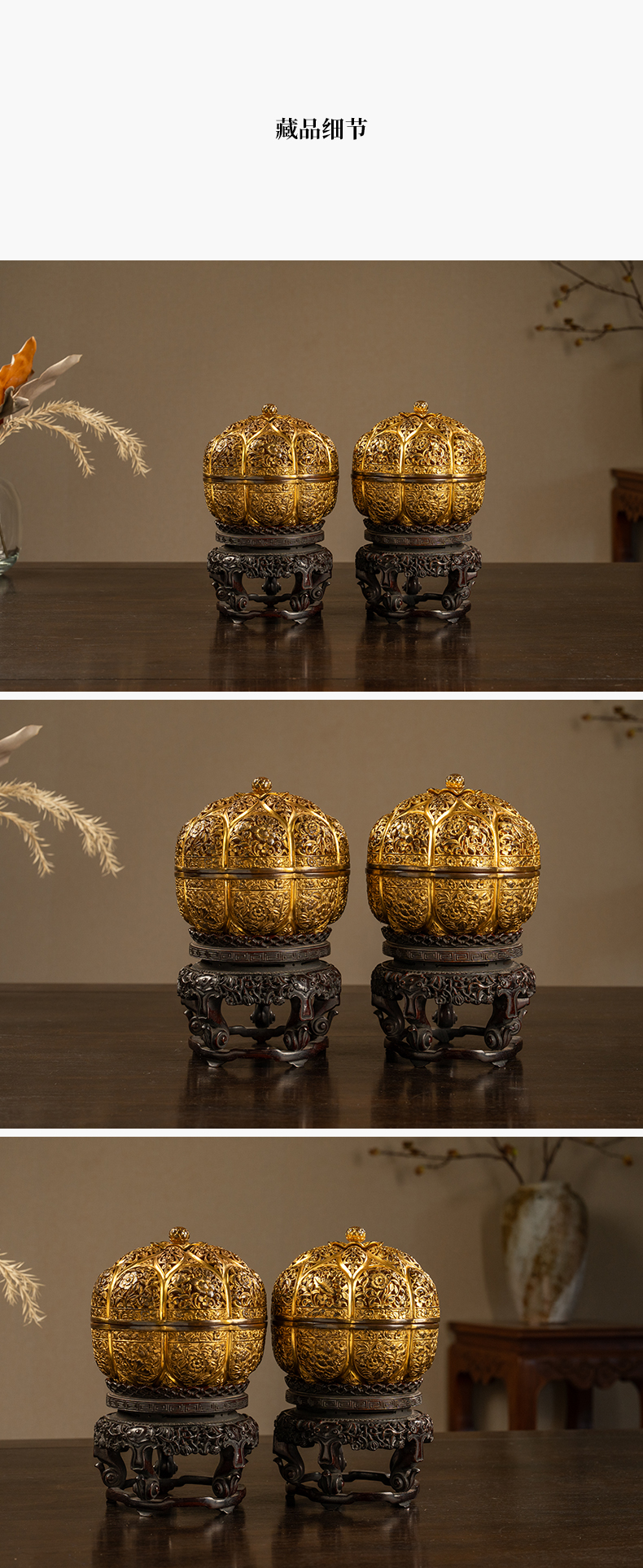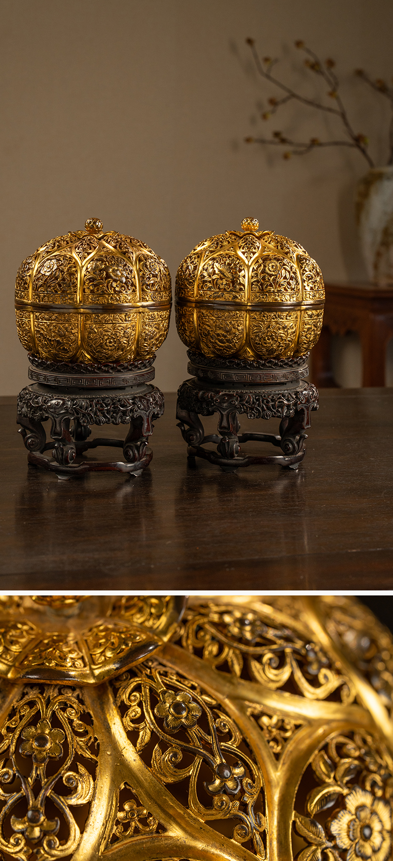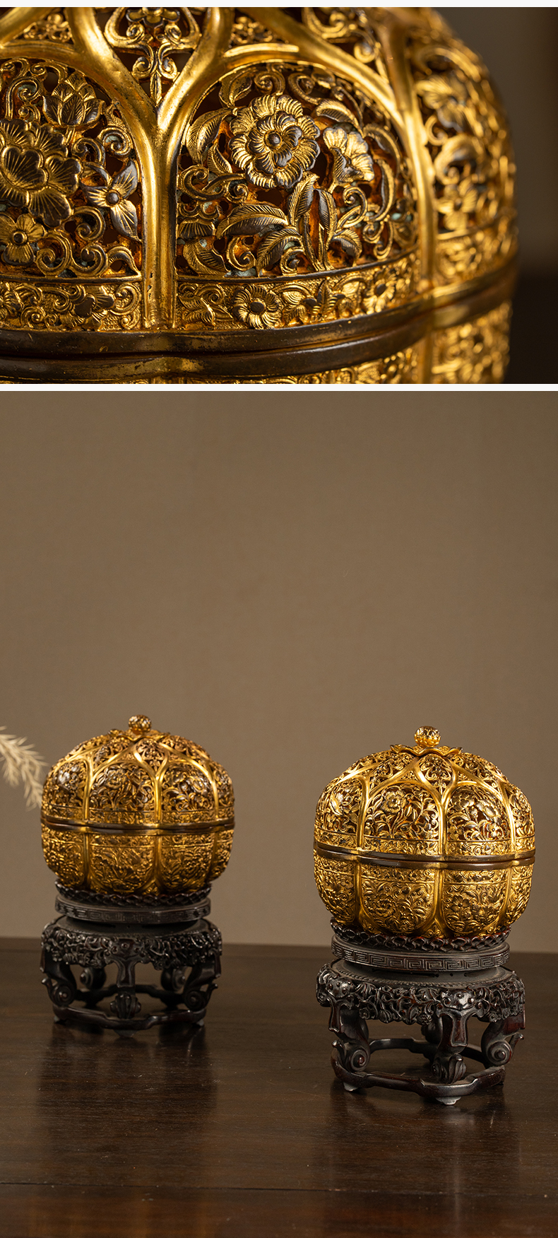 清 铜鎏金花卉纹花口香薰及紫檀座(一对)
