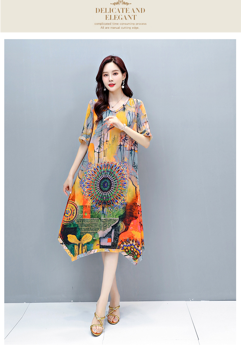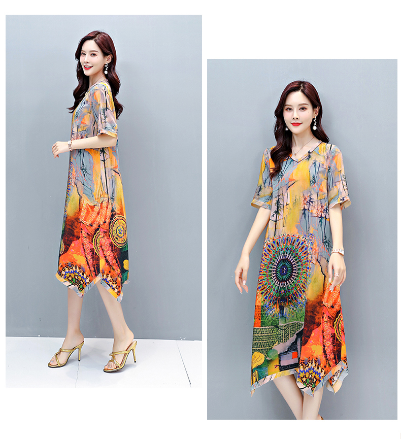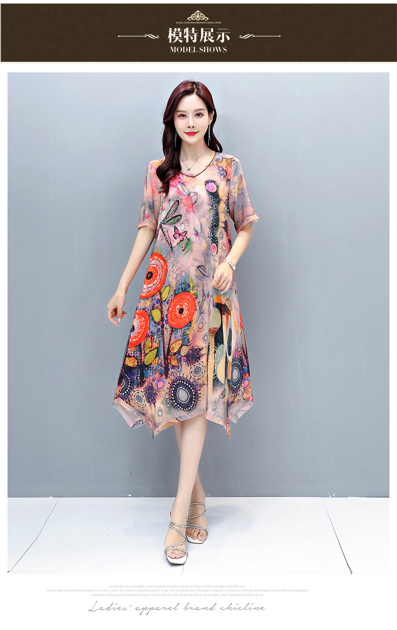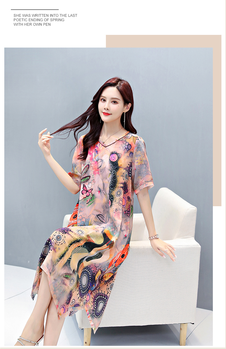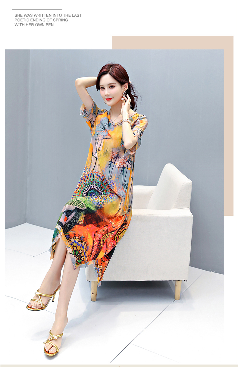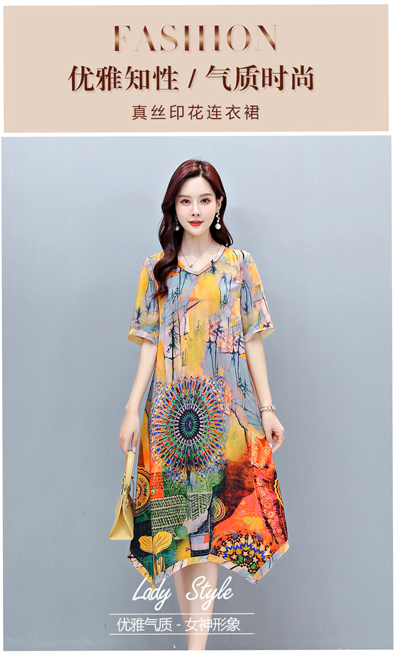 宽松舒适,长款复古套头大摆型印花真丝连衣裙MFE82132