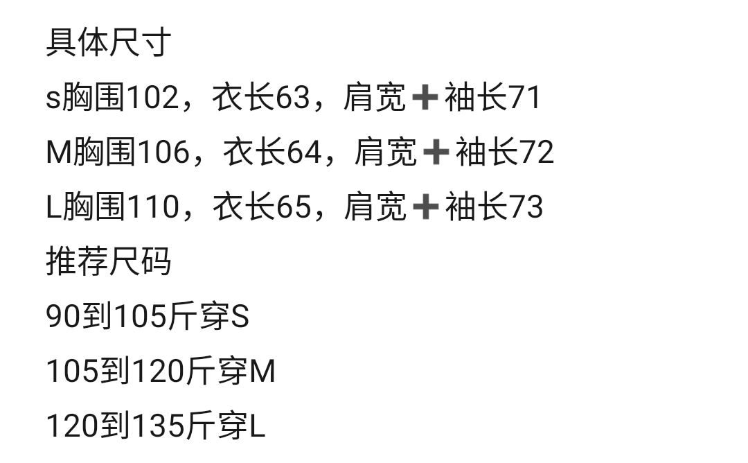 s胸围102,衣长63,肩宽➕袖长71
