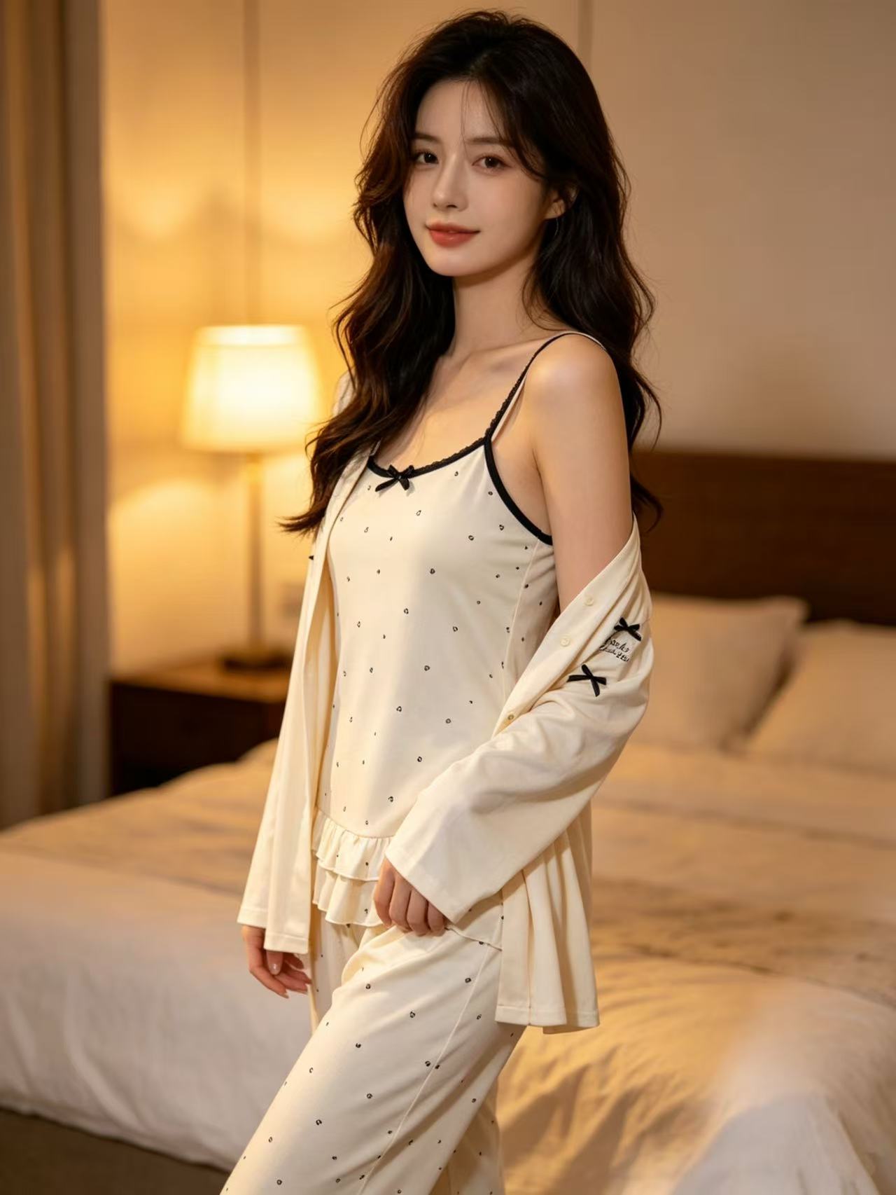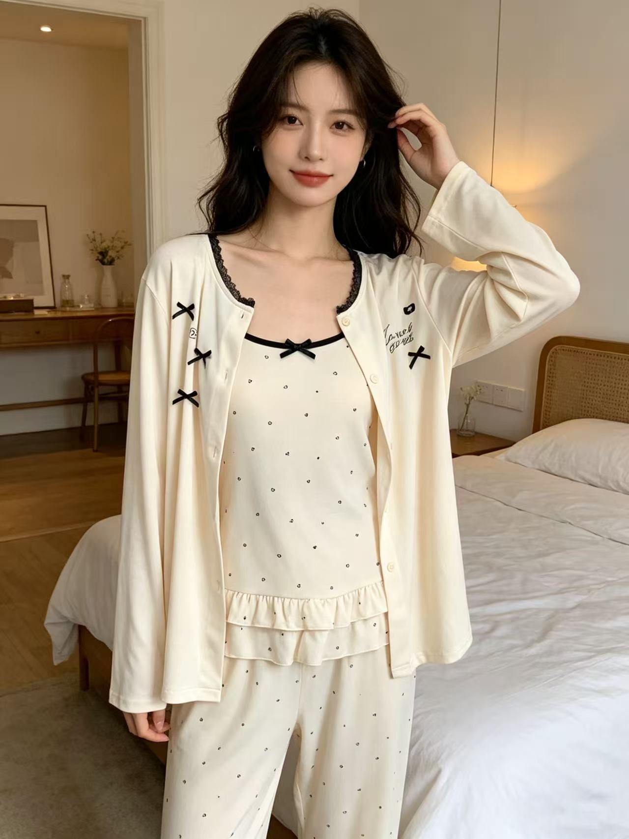 三件套!!有胸垫【自营】可外穿胸垫吊带+外搭+长裤睡衣套装-喜出