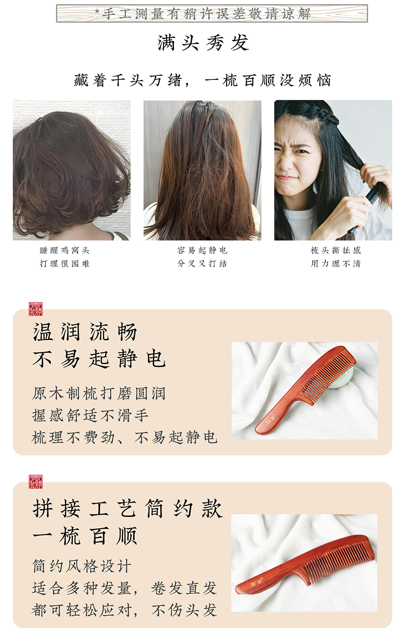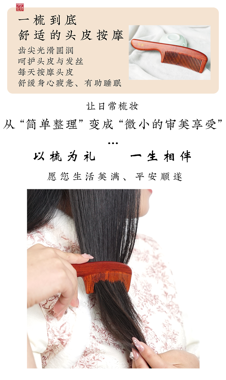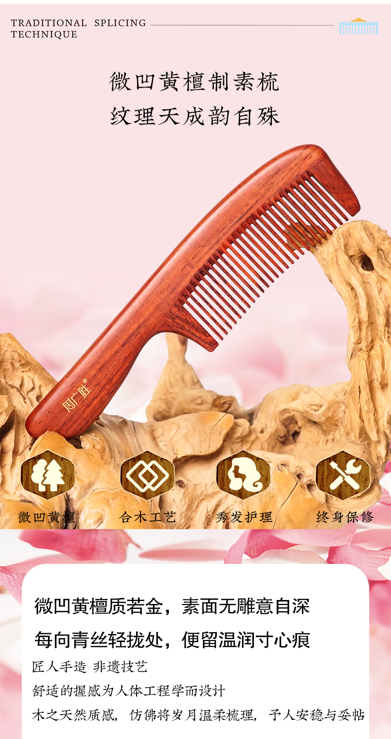 周广胜紫檀雕花珠语防静电按摩插齿梳子女士专用护发顺发礼盒