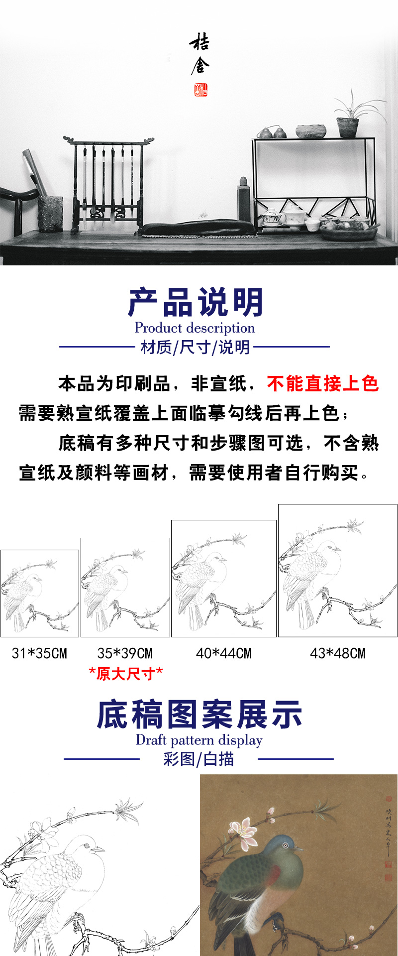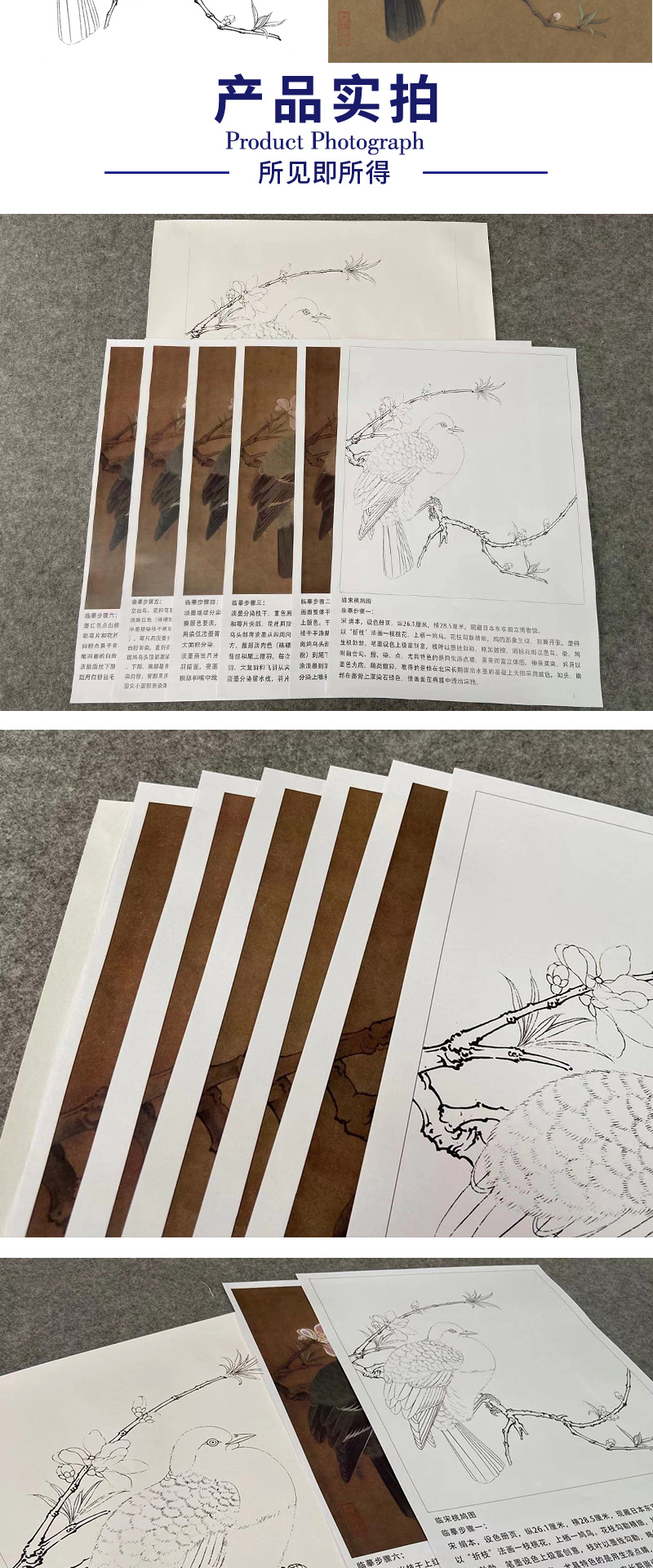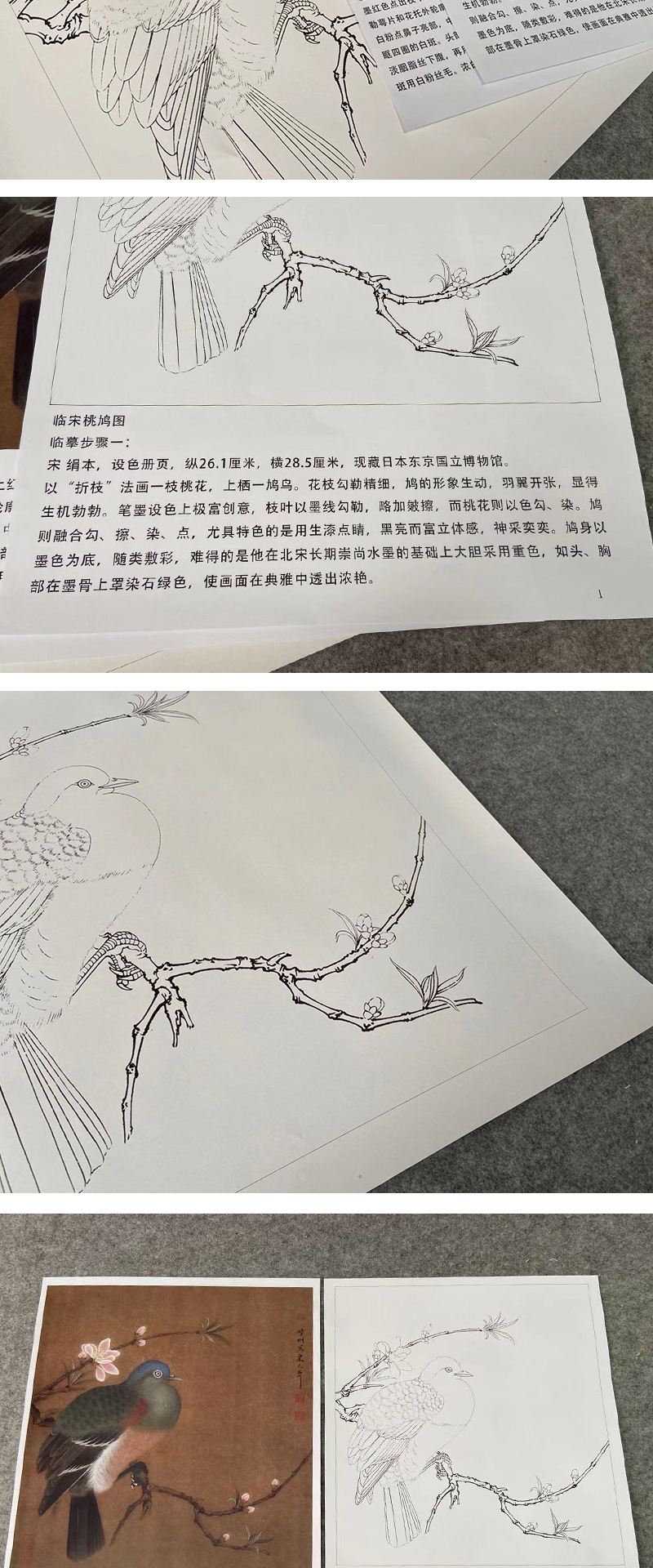 【有步骤、大彩图】李晓明工笔画白描底稿斗方小品《临宋桃鸠图》桃花斑鸠初学者临摹花鸟线稿KC16