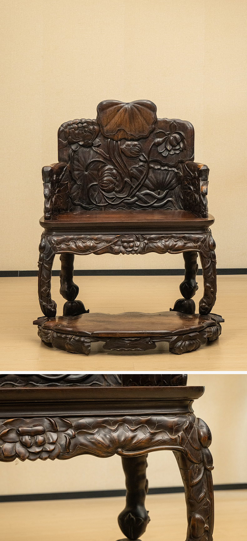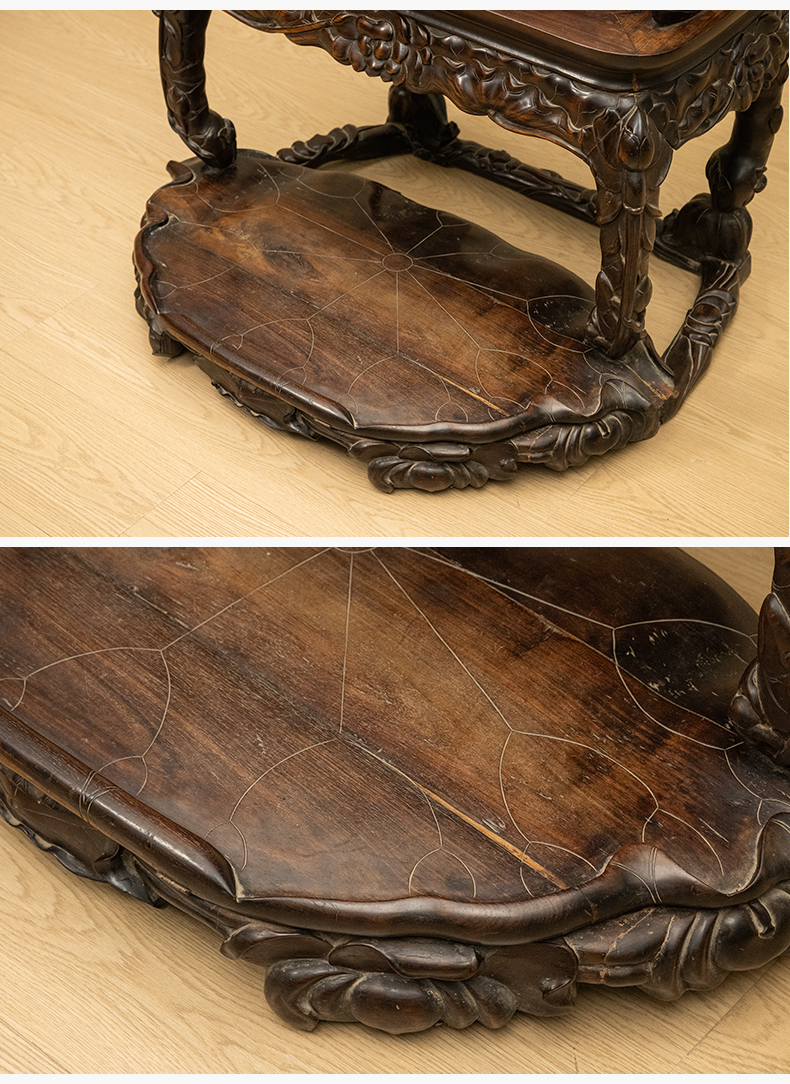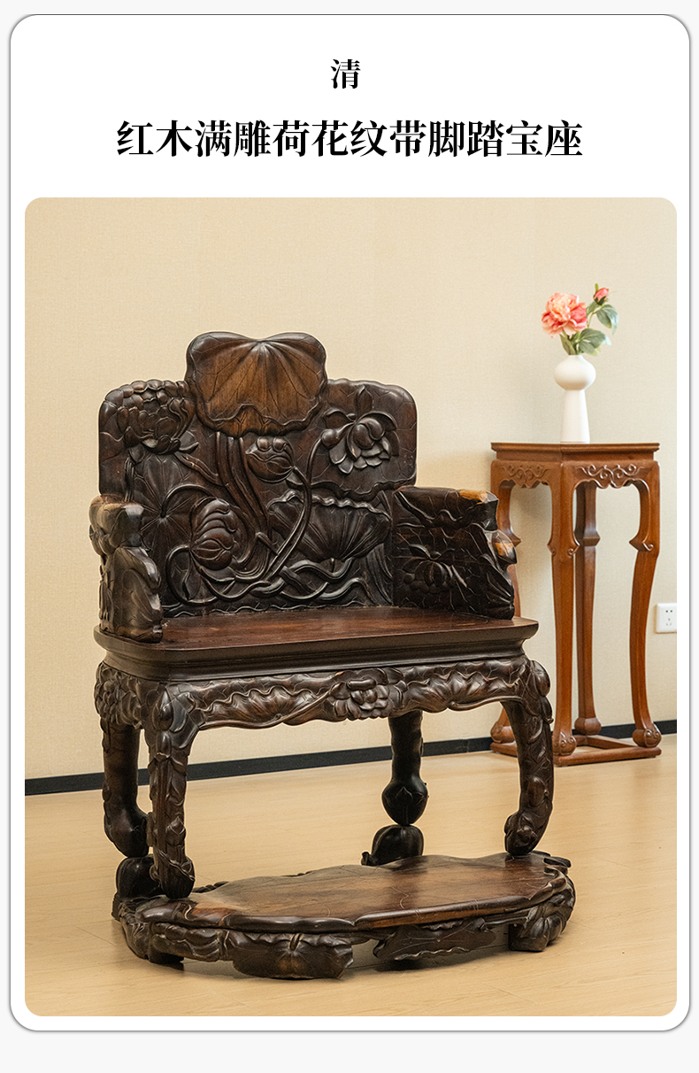 清 红木满雕荷花纹带脚踏宝座