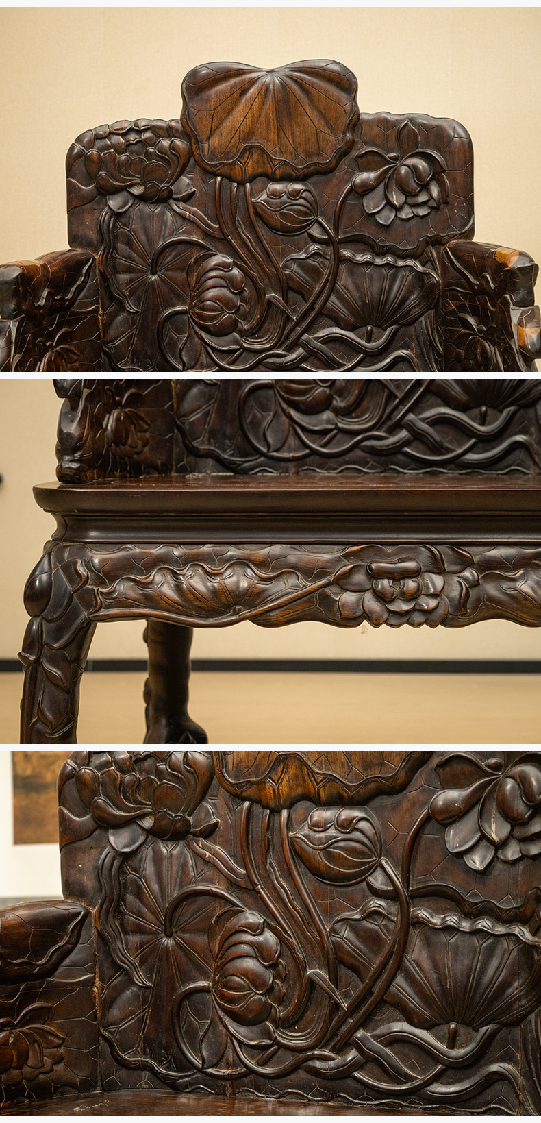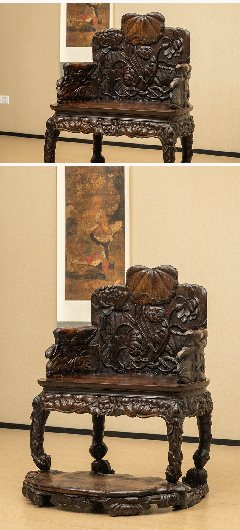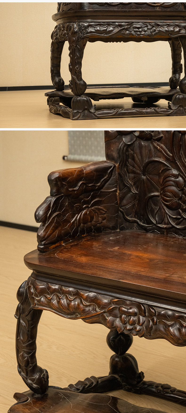 清 红木满雕荷花纹带脚踏宝座