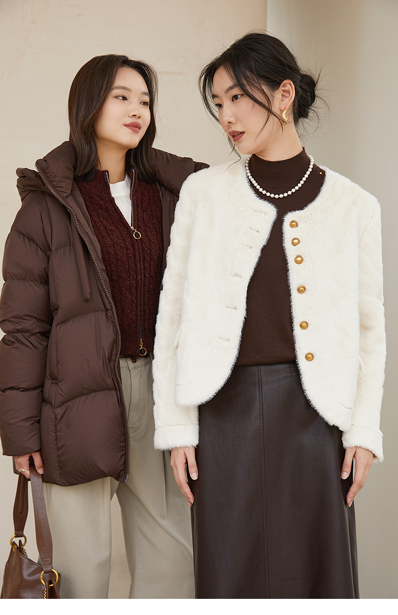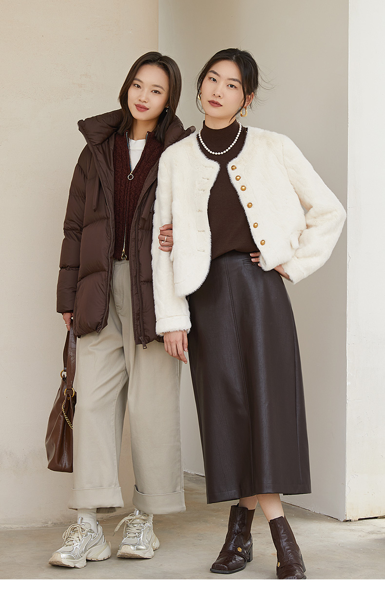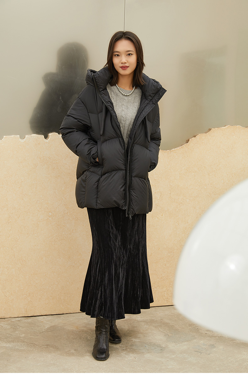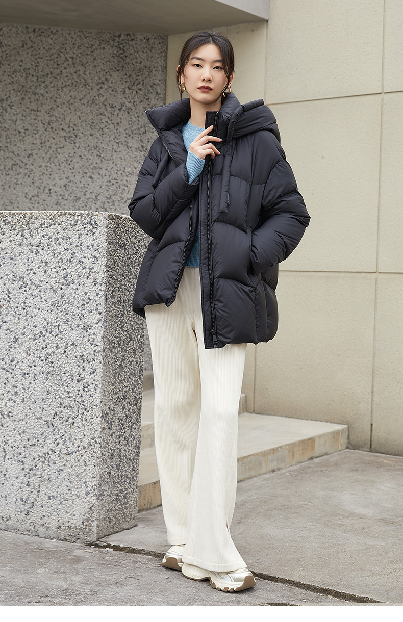 【鹅绒】深棕色连帽中长款羽绒服 秋冬宽松廓形拉链保暖面包服外套