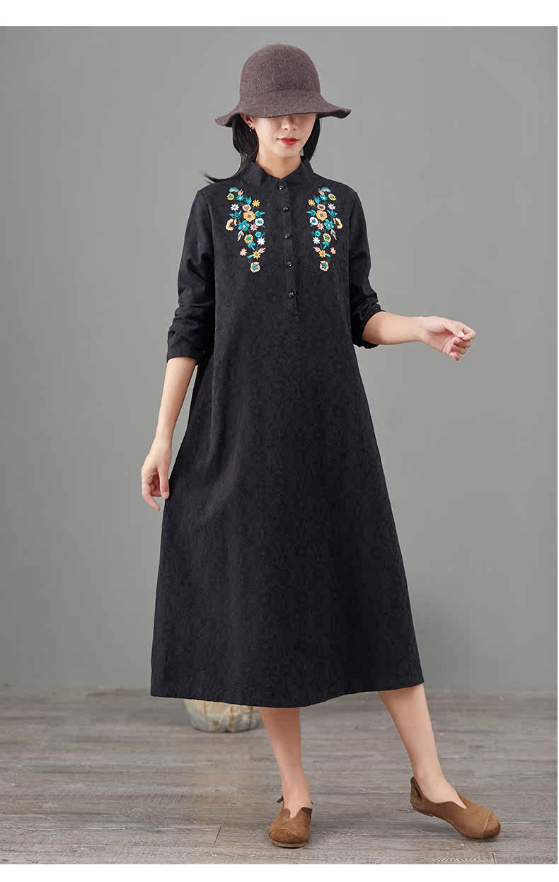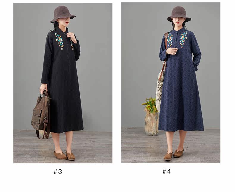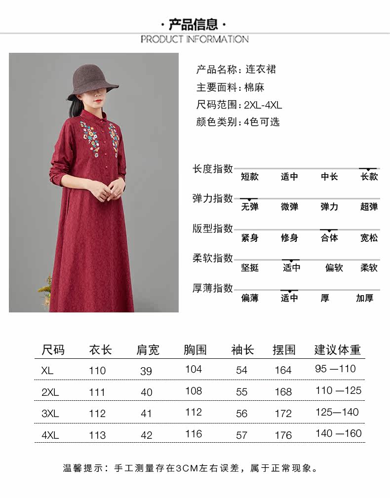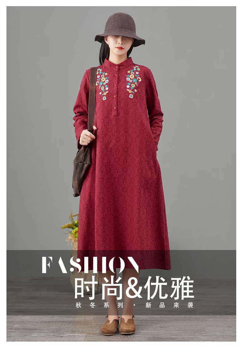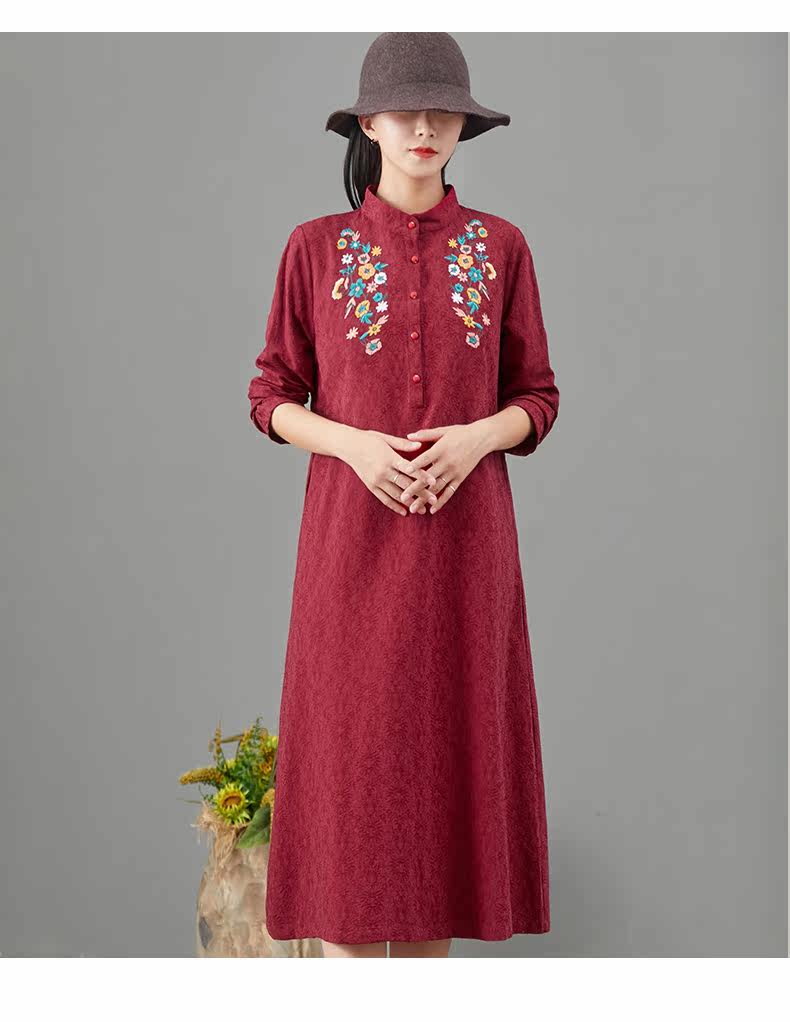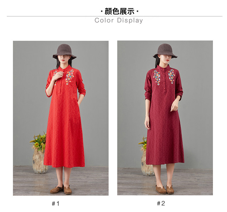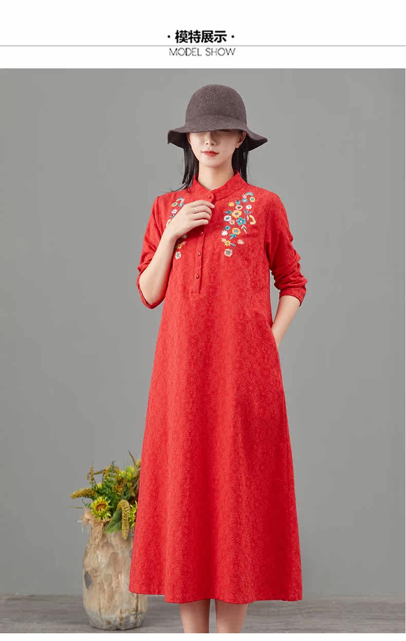 MQ-1918-2春秋新款大码民族风刺绣棉麻提花长袖素色裙YY