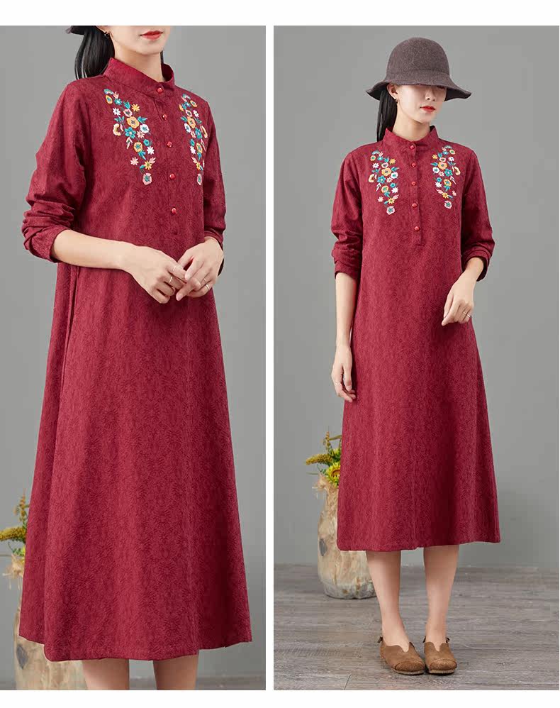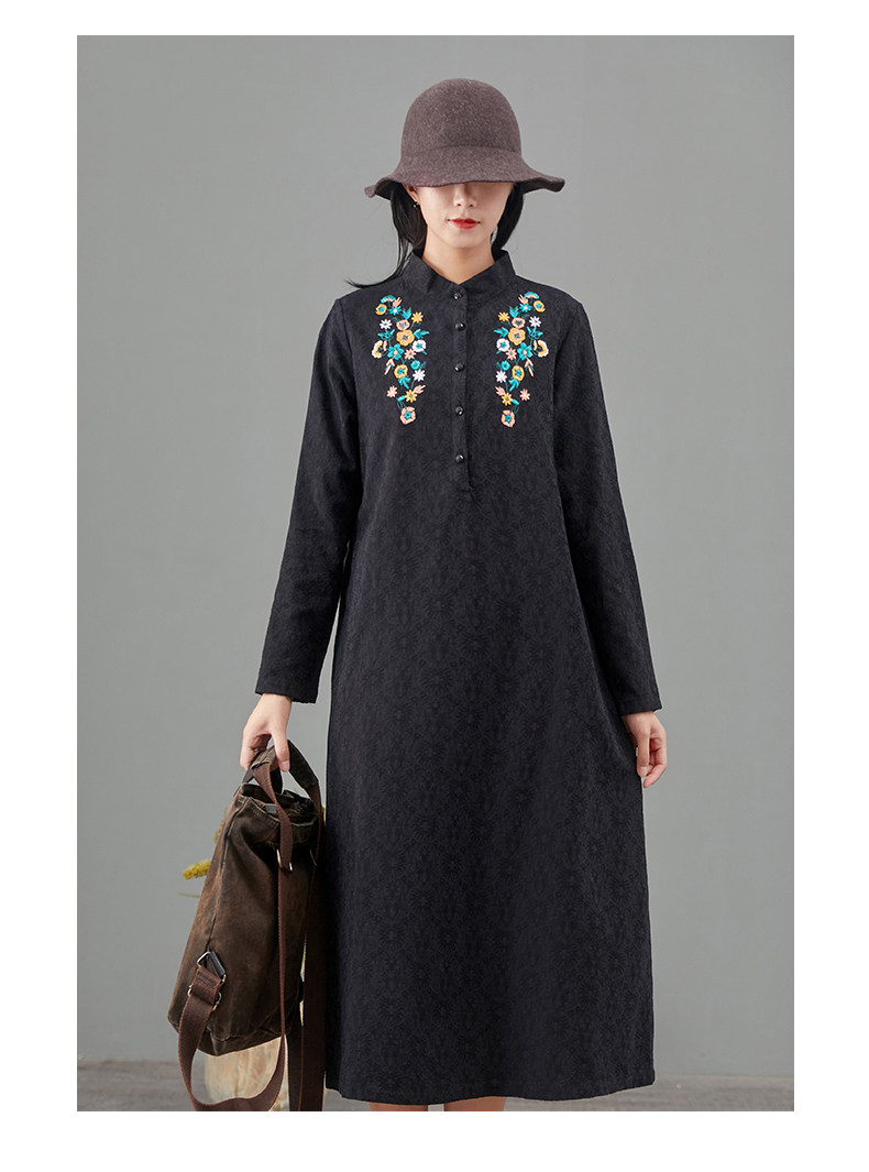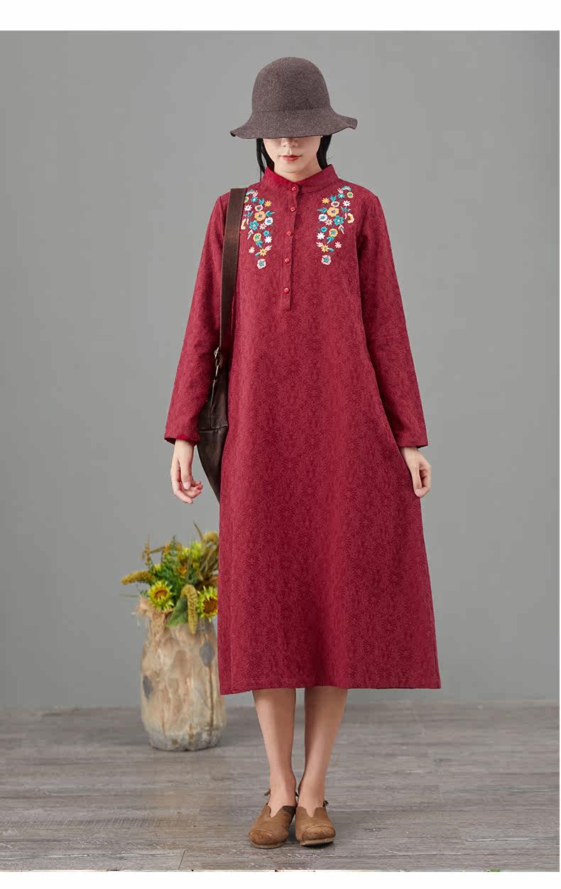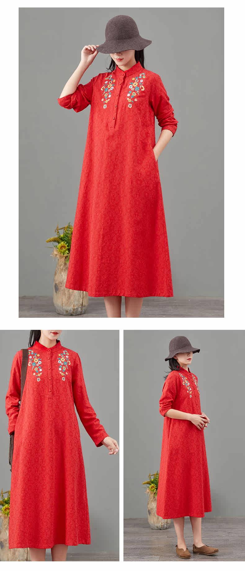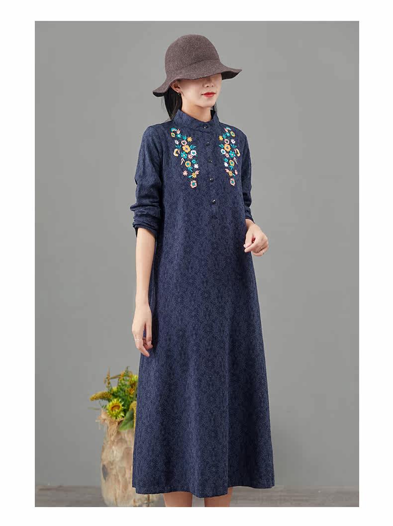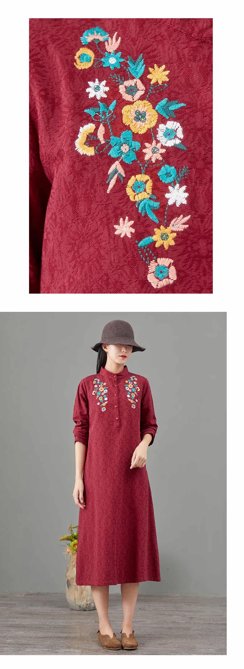 MQ-1918-2春秋新款大码民族风刺绣棉麻提花长袖素色裙YY