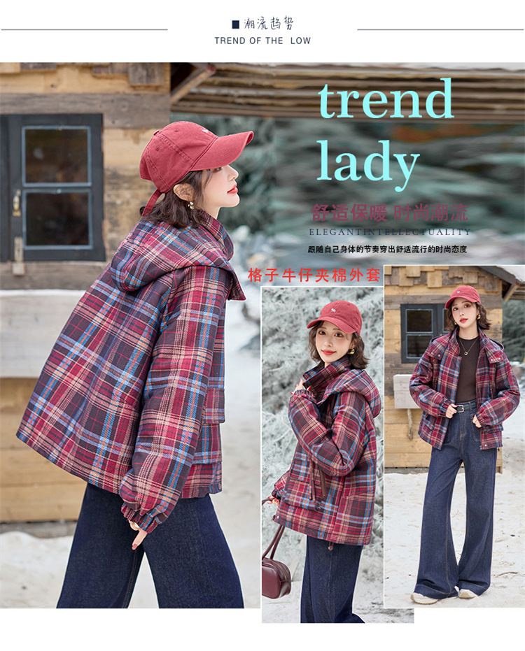 HR SYY2904棉服牛仔格纹连帽宽松加厚短款洋气时尚外套 商品图0
