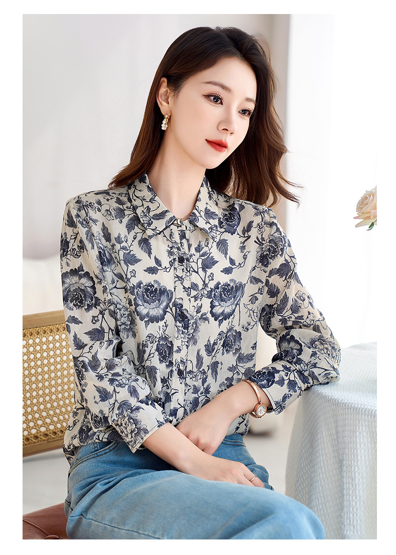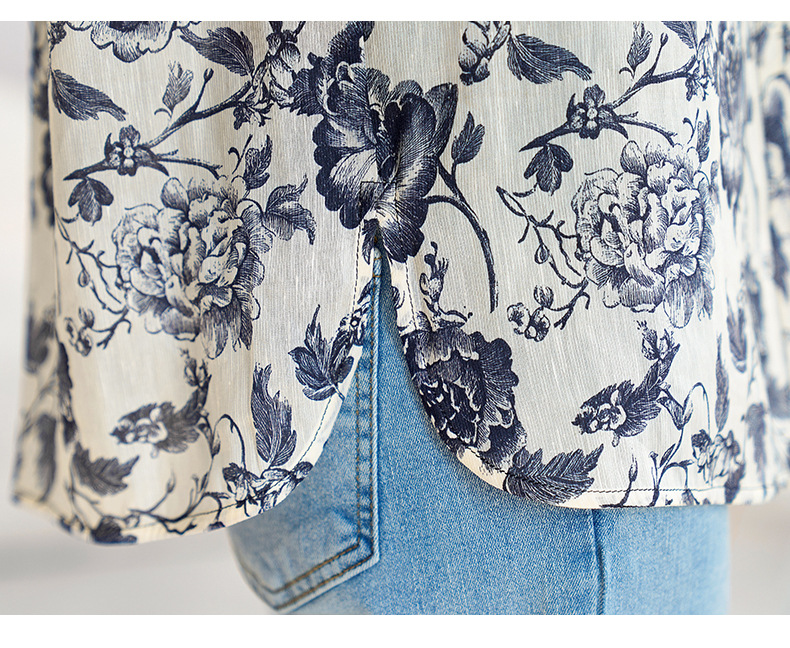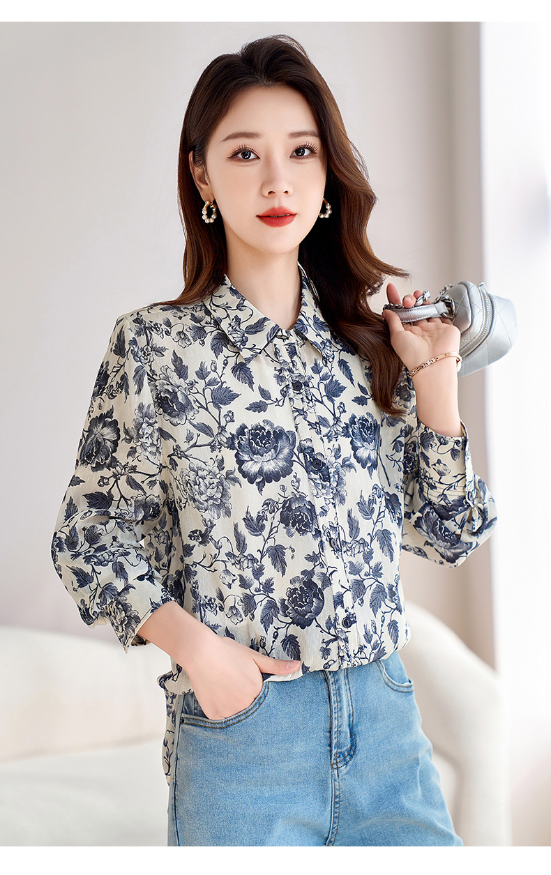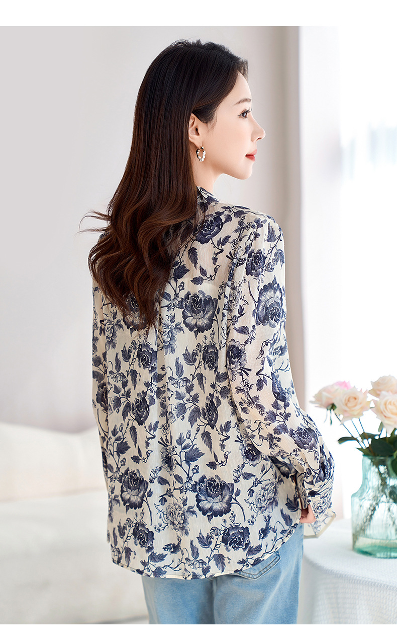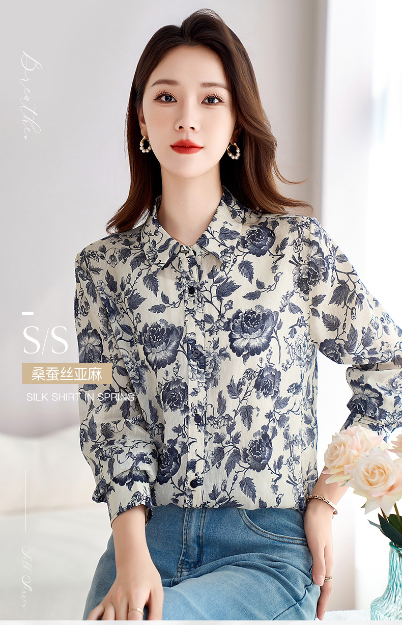 QS-12599628春季上衣女原创国风印花衬衣女真丝亚麻青花瓷长袖衬衫女9768
