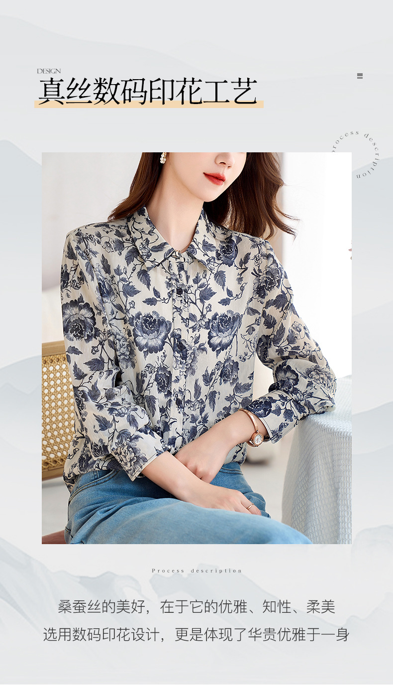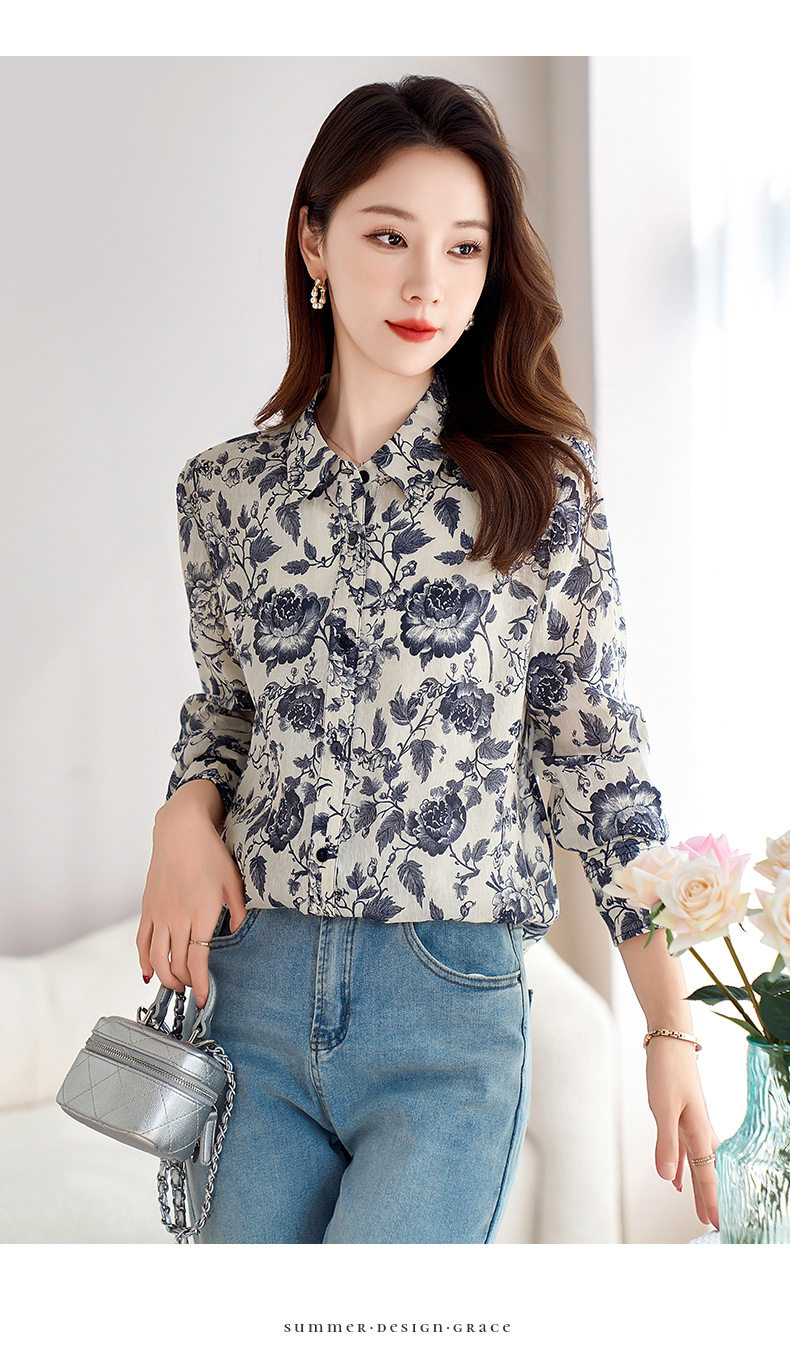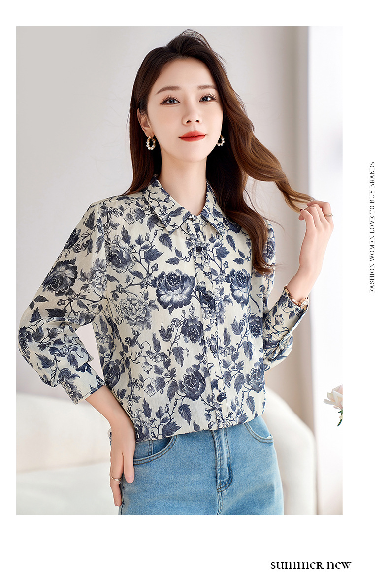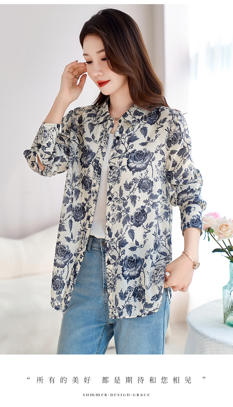QS-12599628春季上衣女原创国风印花衬衣女真丝亚麻青花瓷长袖衬衫女9768