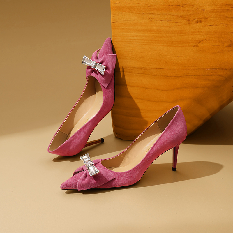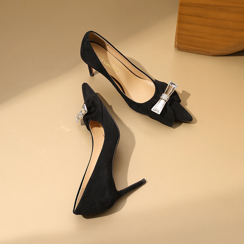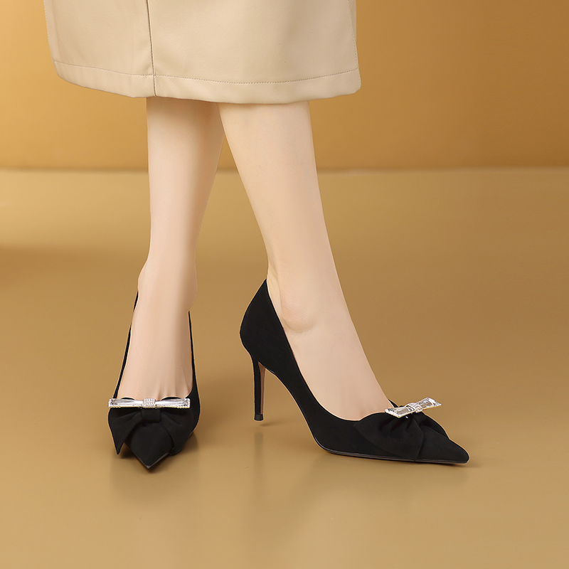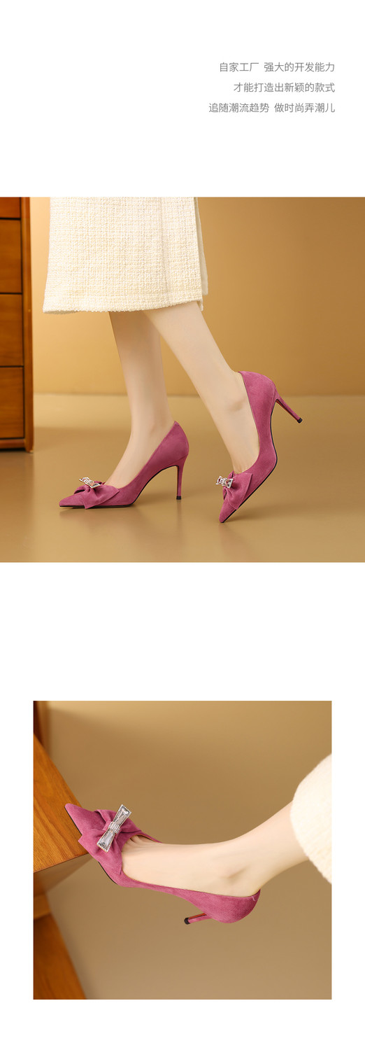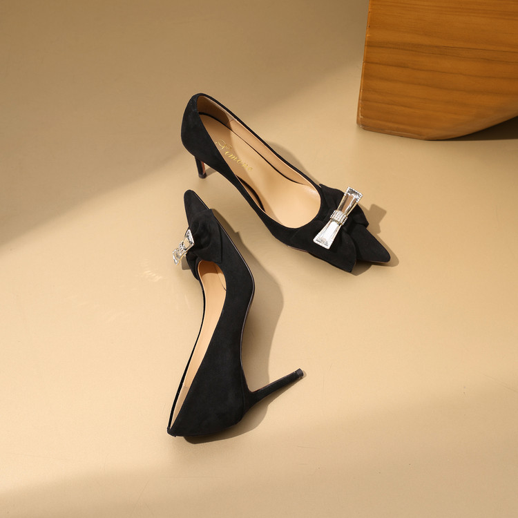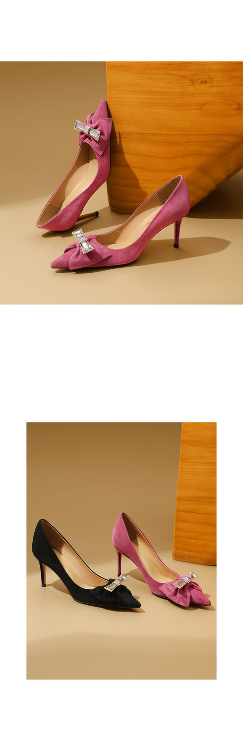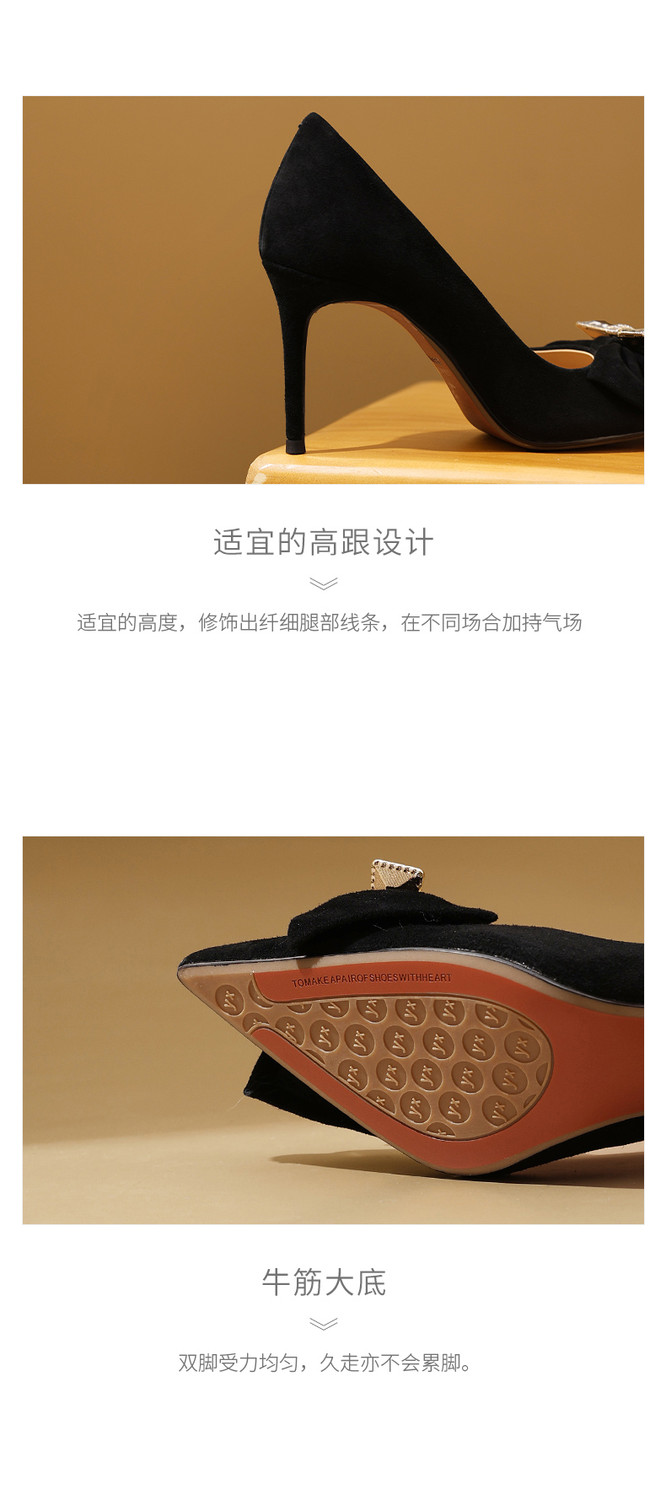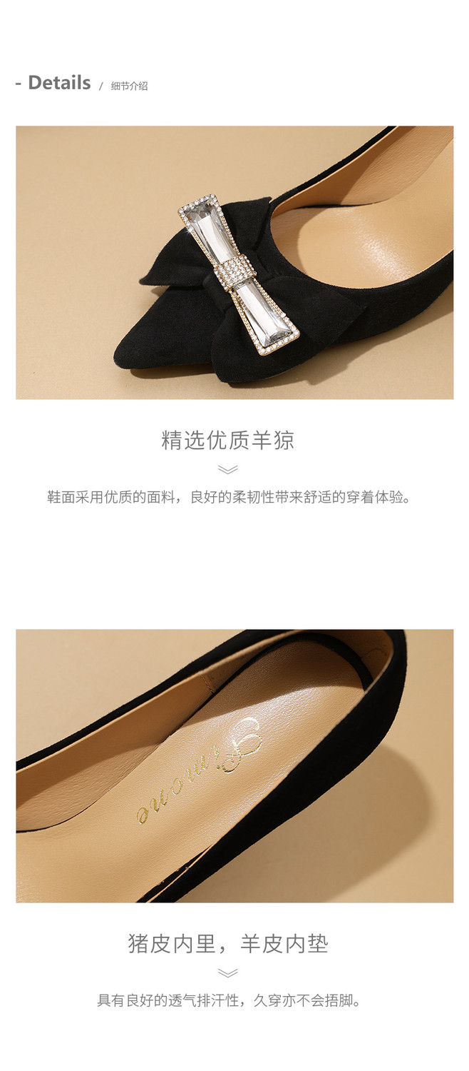 【预售7天】法式水钻蝴蝶结磨砂皮高跟鞋女春秋新款尖头细跟气质时装浅口单鞋CX&B0811