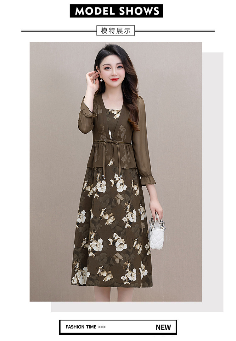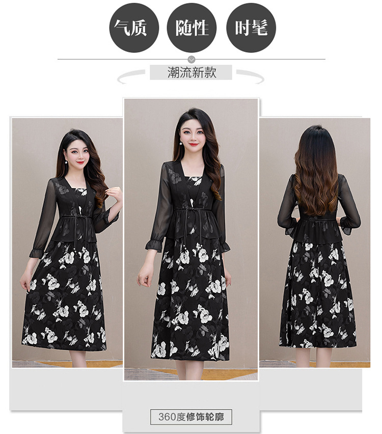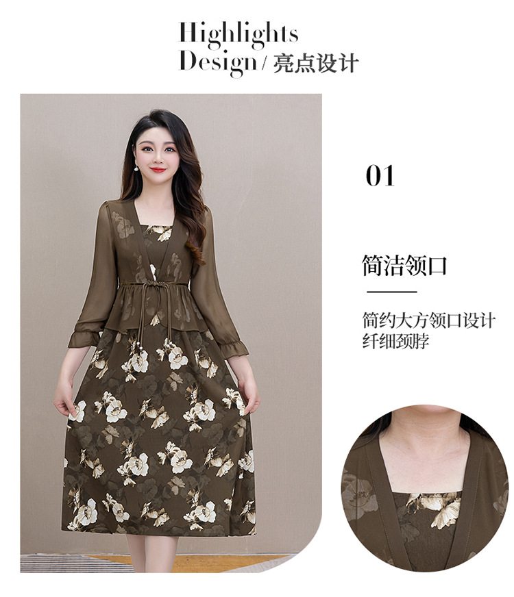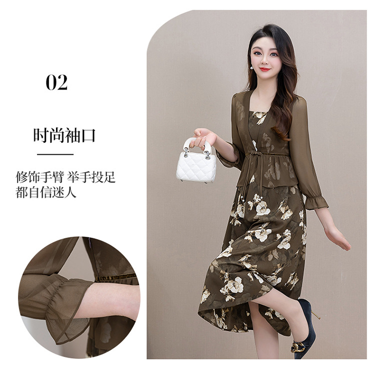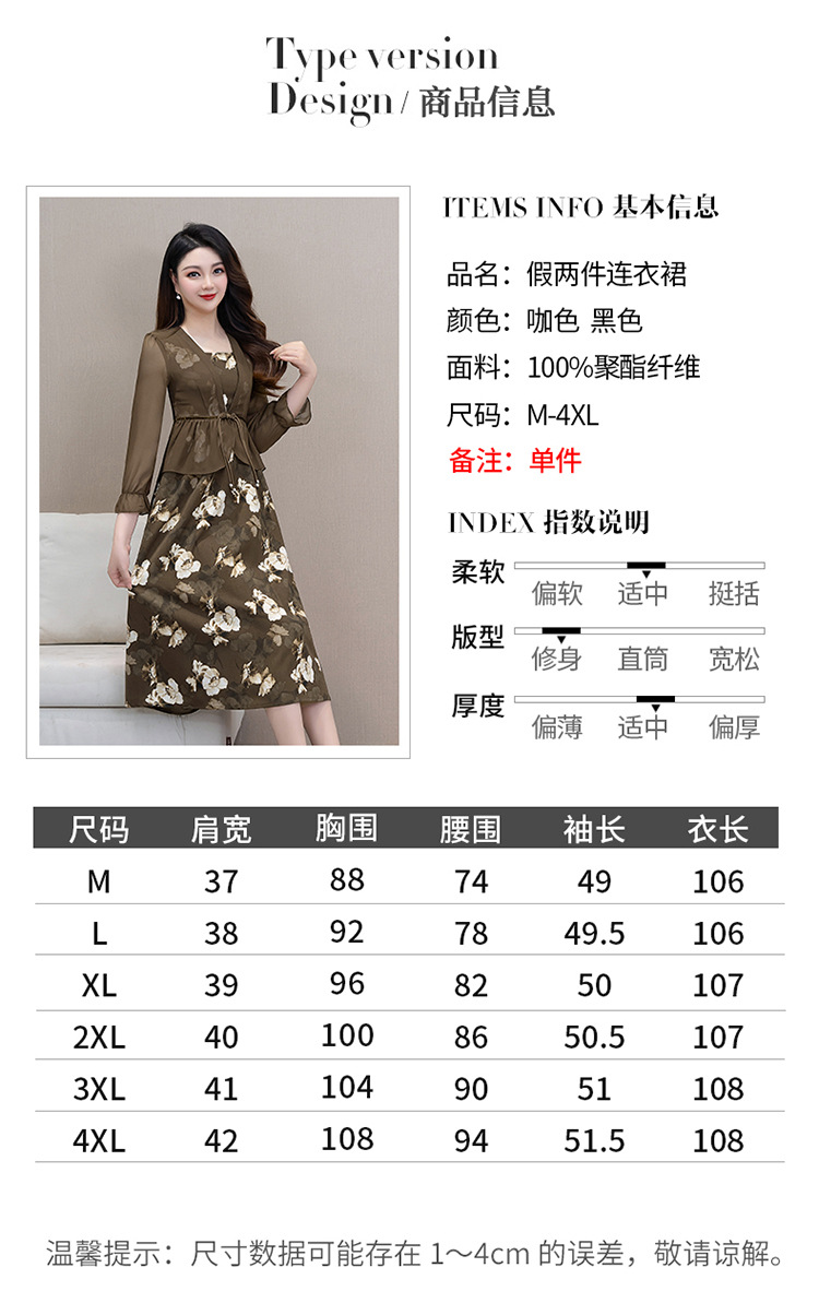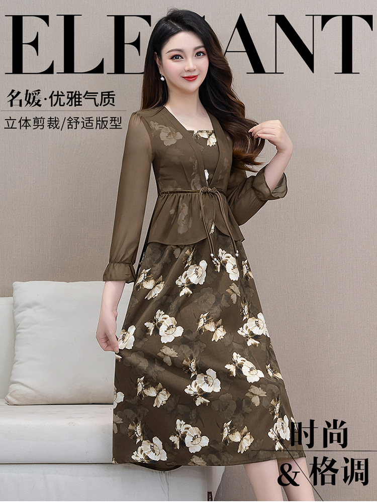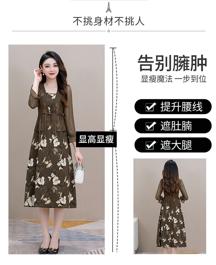 修身时尚,秋款中长款印花假两件连衣裙方领长袖时髦雪纺裙QYM-XQD-53C2316-L