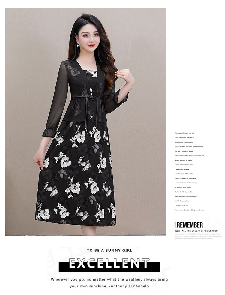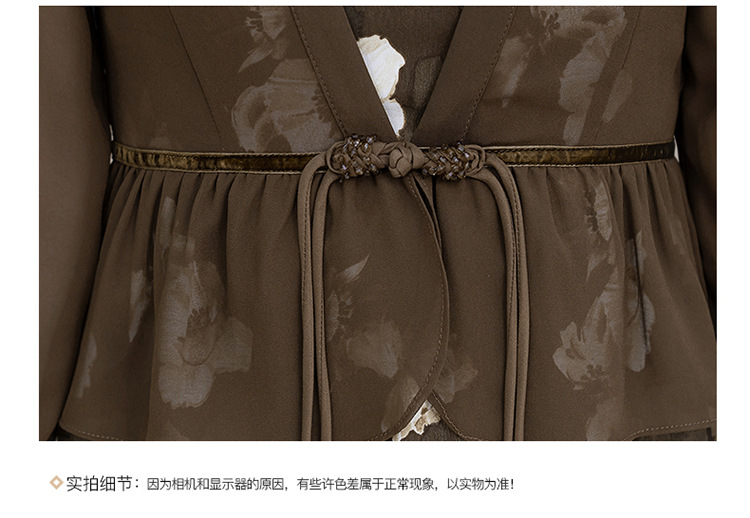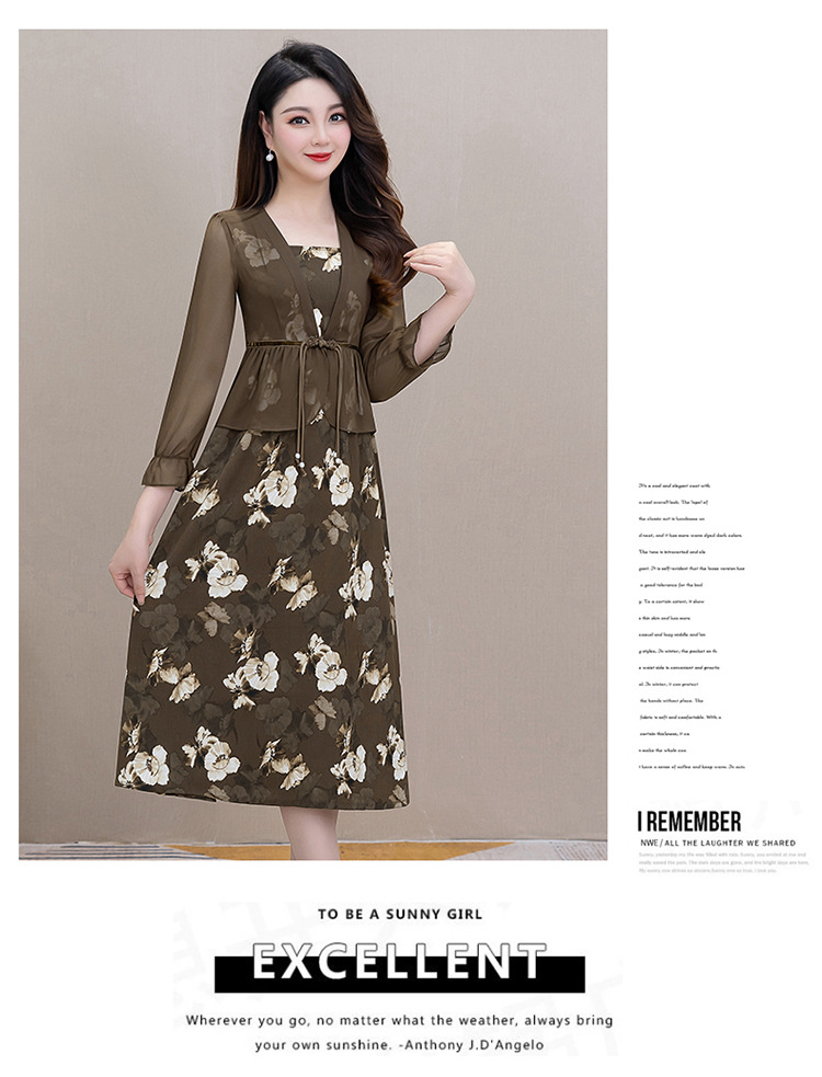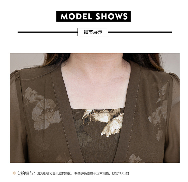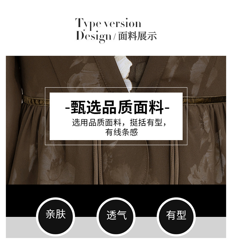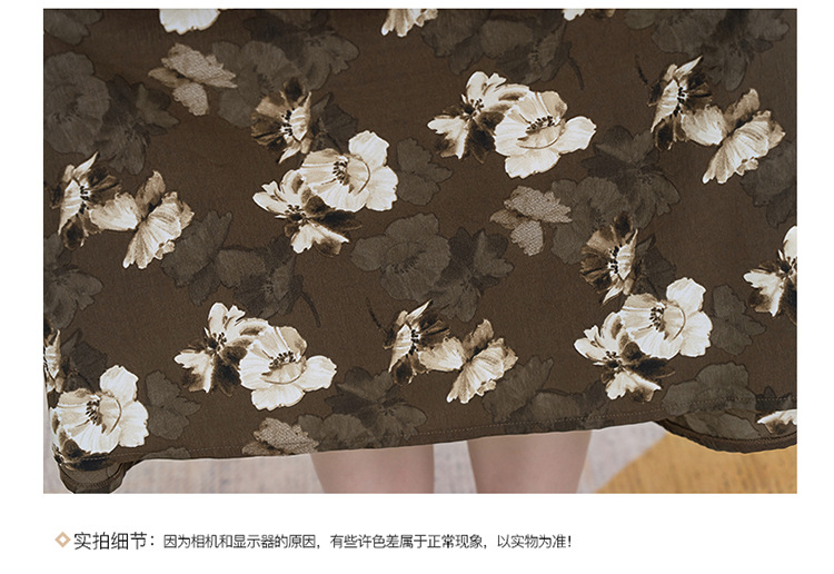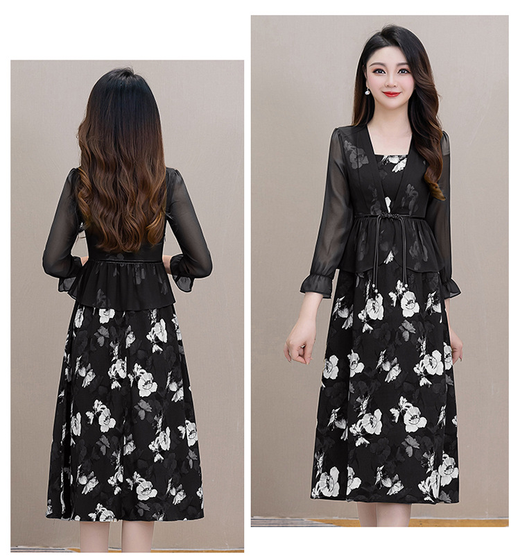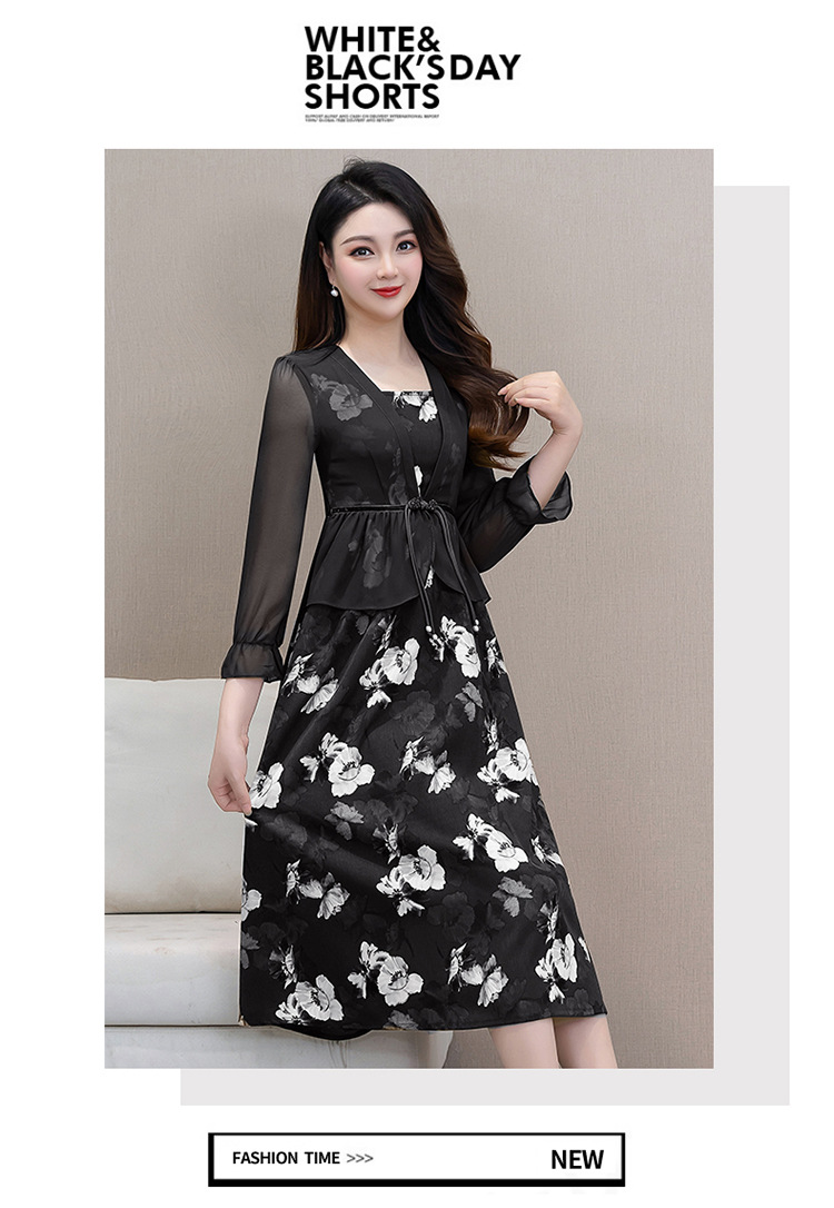 修身时尚,秋款中长款印花假两件连衣裙方领长袖时髦雪纺裙QYM-XQD-53C2316-L