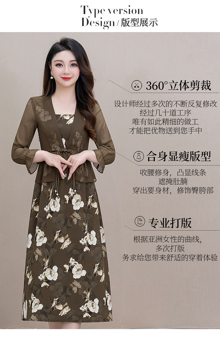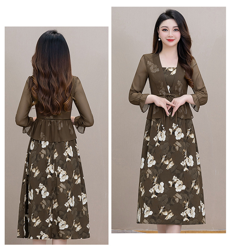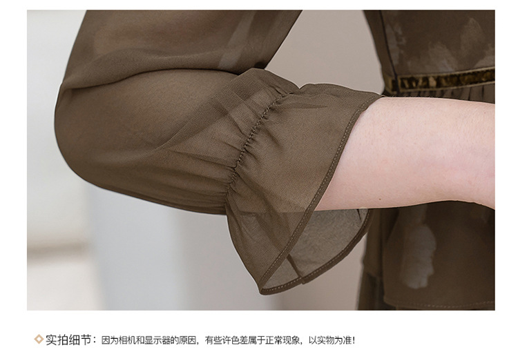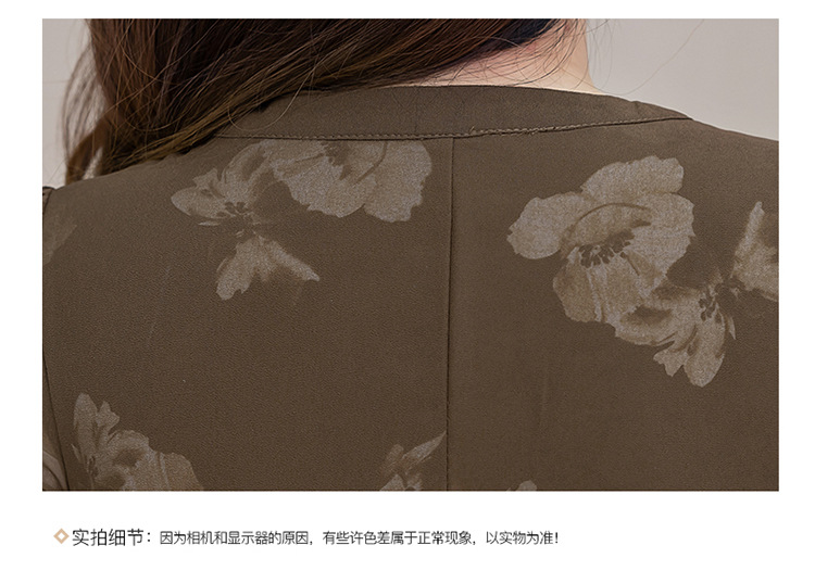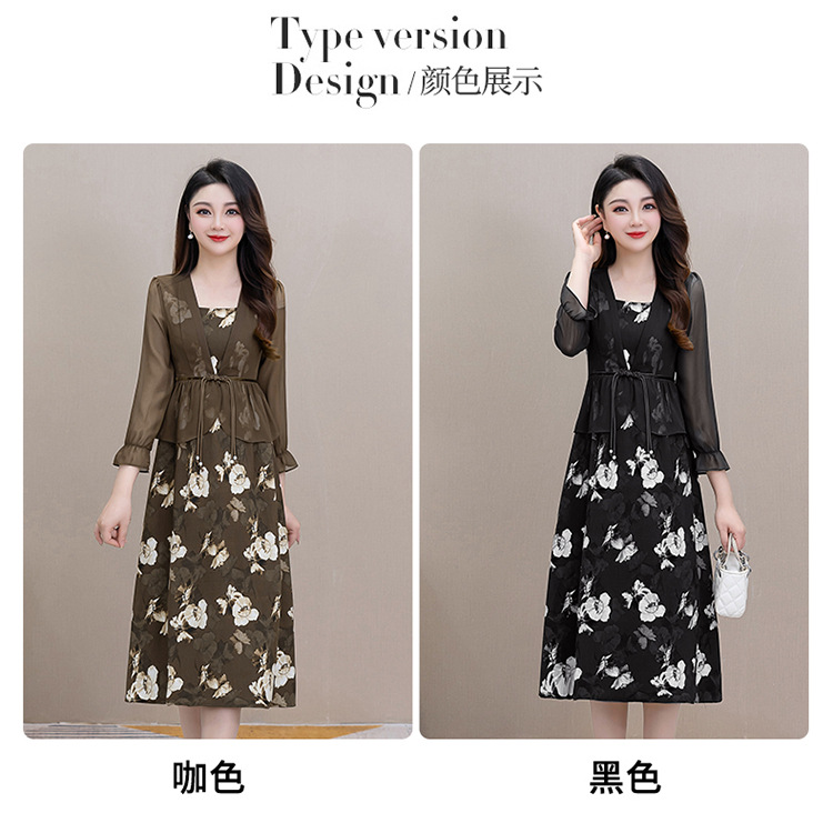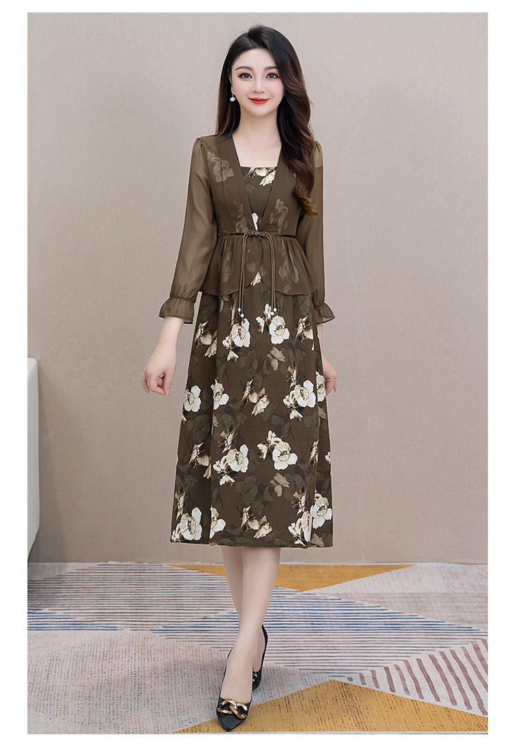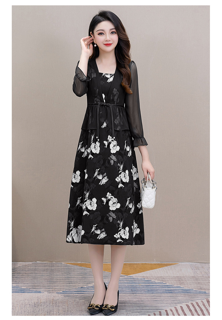 修身时尚,秋款中长款印花假两件连衣裙方领长袖时髦雪纺裙QYM-XQD-53C2316-L