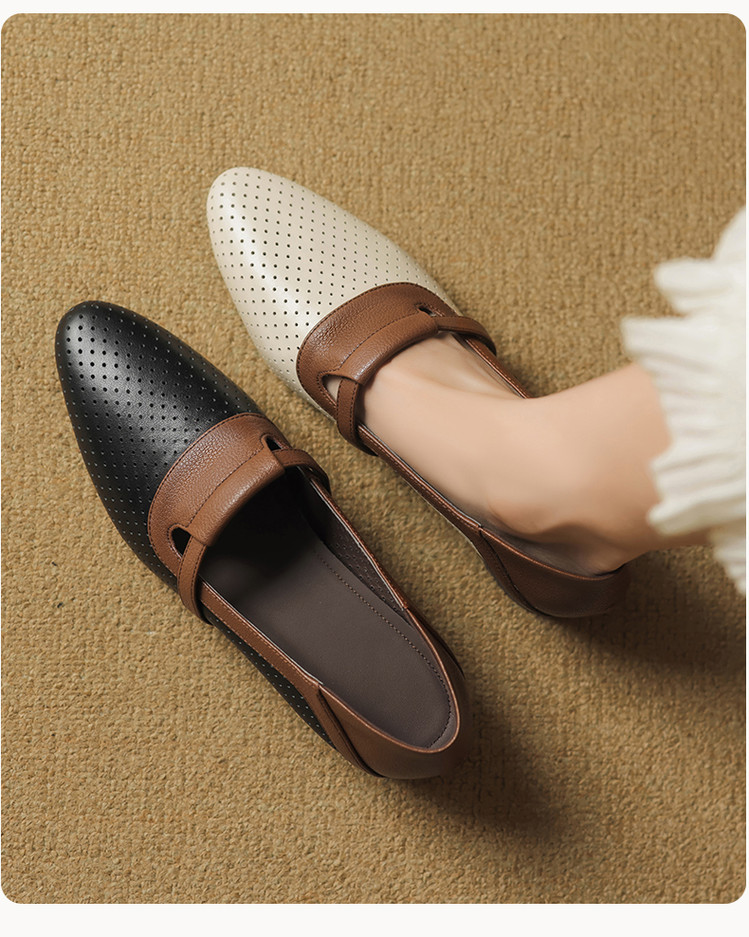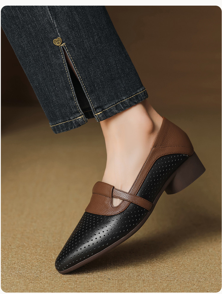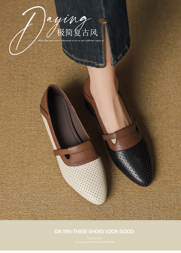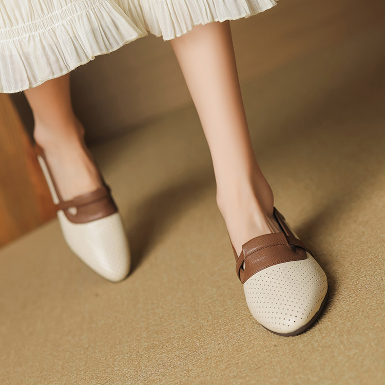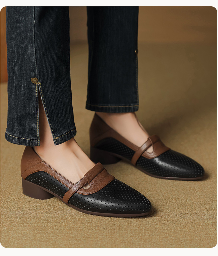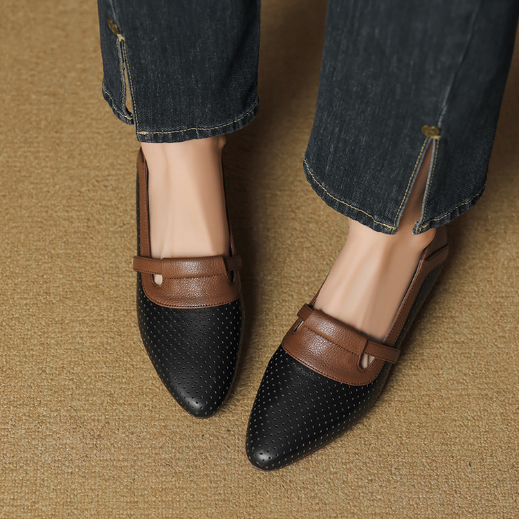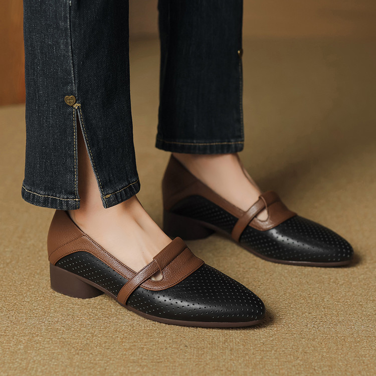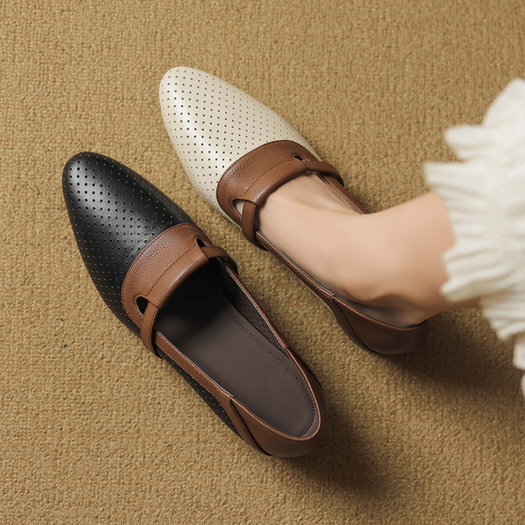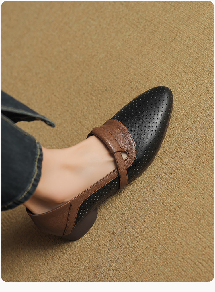 【预售5天】法式拼色软皮低跟单鞋女新款春季圆头中口洞洞鞋一脚蹬小皮鞋YCJX&H-7395